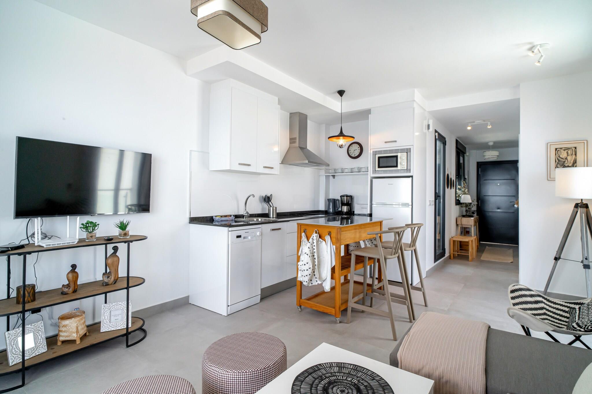 Denne stilfulde feriehus med en rolig et-værelses indretning, en dobbeltseng og madrasser af høj kvalitet har komfortabel plads til to gæster. Den er perfekt til par og tilbyder en afslappende atmosfære med en hyggelig stue med sofa, aircondition og internetadgang. Ejendommen er ikke kæledyrsvenlig. En privat balkon tilbyder panoramaudsigt over havet og bjergene, hvilket tilføjer en naturskøn charme til opholdet. Gæsterne kan nyde en luksuriøs fælles saltvandspool, der er tilgængelig året rundt. Valgfrie tilbehør som barnesenge, høje stole, champagne og velkomstpakker øger bekvemmeligheden og komforten. Derudover sørger gratis sæsonbestemte aktiviteter og personlig indtjekningsservice for en problemfri og imødekommende ankomst. Denne velbeliggende lejlighed ligger mellem Nerja og Torrox på Málagas østkyst og placerer dig i nærheden af flere naturskønne strande. Playa Güilche ligger kun 1 km væk, mens strandene Playazo, El Peñoncillo og Torrecilla strækker sig fra 1,2 til 3 km og tilbyder muligheder fra fredelige bugter til livlige steder med restauranter og strandbarer. For daglige bekvemmeligheder og lokal kultur er den nærliggende landsby og det ugentlige marked let tilgængelige med bus eller taxa. Det nærmeste busstoppested ligger cirka 1 km væk langs N340, og Malaga Lufthavn er det nærmeste større rejseknudepunkt, hvilket gør lejligheden til et bekvemt udgangspunkt for udforskning. Lejligheden har et fuldt udstyret moderne køkken med high-end apparater, ideelt til selvforplejning. Et elegant badeværelse med bruser og friske håndklæder sikrer komfort og privatliv.