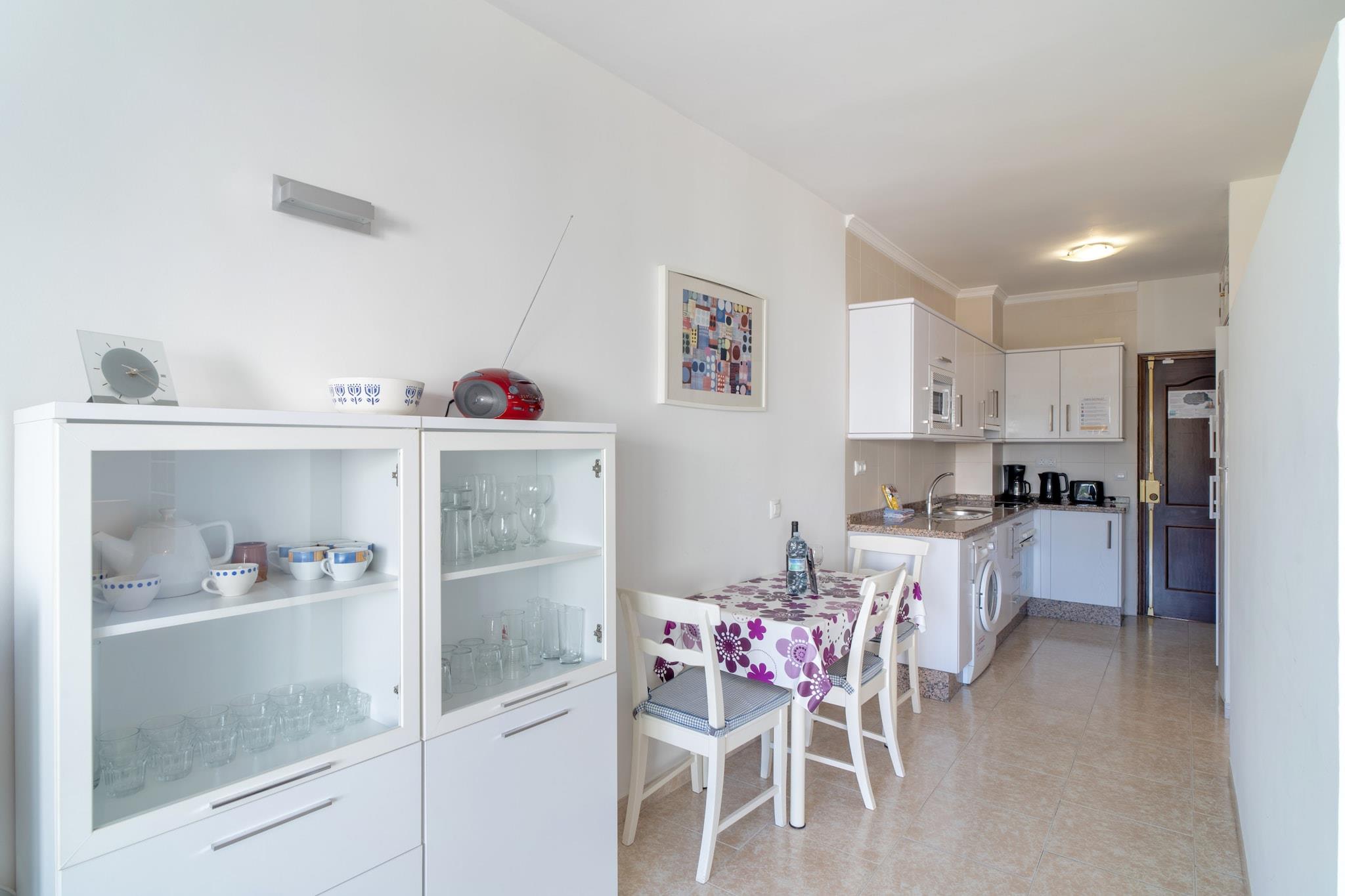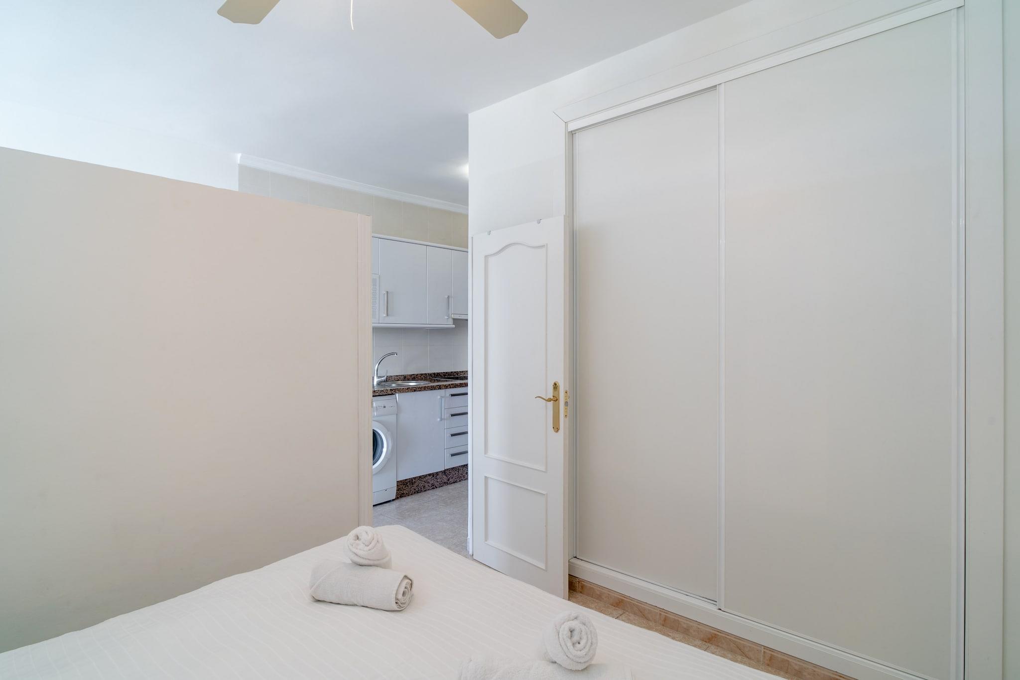 Dette moderne feriehus er en stilfuld og kompakt studiolejlighed, ideel til op til to gæster og har en komfortabel dobbeltseng. Selvom det ikke er kæledyrsvenligt, er det perfekt til solorejsende eller par, der søger et roligt kystnært tilflugtssted. Det airconditionerede interiør inkluderer en hyggelig opholdsstue med internationalt satellit-tv, og den private balkon tilbyder en fantastisk havudsigt. Gæsterne har også adgang til en fælles saltvandspool, der er åben året rundt. Valgfrie tjenester som lufthavnstransport, en velkomstpakke og personlig indtjekning bidrager til bekvemmeligheden. Dette studio ligger kun 100 meter fra Nerjas sandstrande og har en privilegeret beliggenhed tæt på lokale attraktioner, restauranter og caféer. Det fredelige Carabeo-område tilbyder hurtig adgang til havet, mens bymidten og Balcón de Europa ligger en kort gåtur væk. Selvom parkering på stedet er begrænset og tilbydes efter først til mølle-princippet, er der offentlig parkering i nærheden, hvilket gør det nemt at udforske omgivelserne i bil. Indenfor er det åbne gaskøkken udstyret med alt det nødvendige, herunder ovn, mikrobølgeovn, køleskab og kaffemaskine - perfekt til at tilberede lette måltider. Et moderne badeværelse med bruseniche og hårtørrer sikrer komfort under hele dit ophold. Yderligere faciliteter inkluderer vaskemaskine, strygejern, gratis Wi-Fi, elevatoradgang og udsigt over bjergene og haven, hvilket gør det til en praktisk, men afslappende mulighed for en strandferie.