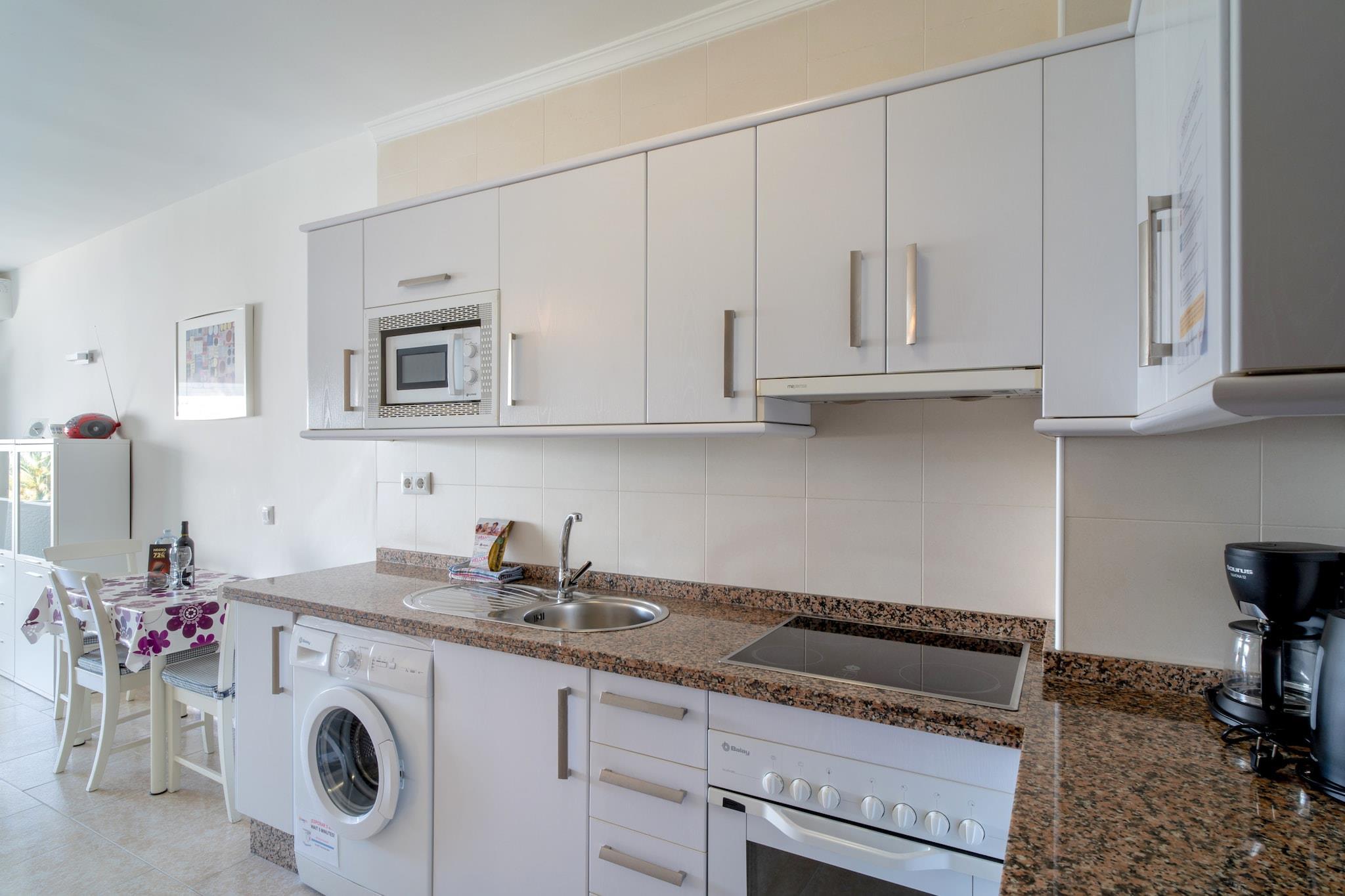 På 2. etage: (Stue(dobbeltseng, Fjernsyn(parabol), spisebord, sofahjørne), åbent køkken(kogeplade(gas), elkedel, brødrister, kaffemaskine, ovn, mikrobølgeovn, køle-fryseskab, Saftpresser, ), badeværelse(bruser, føntørrer), Internetadgang) , vaskemaskine, balkon, klimaanlæg, swimmingpool(deles med andre gæster), strygejern