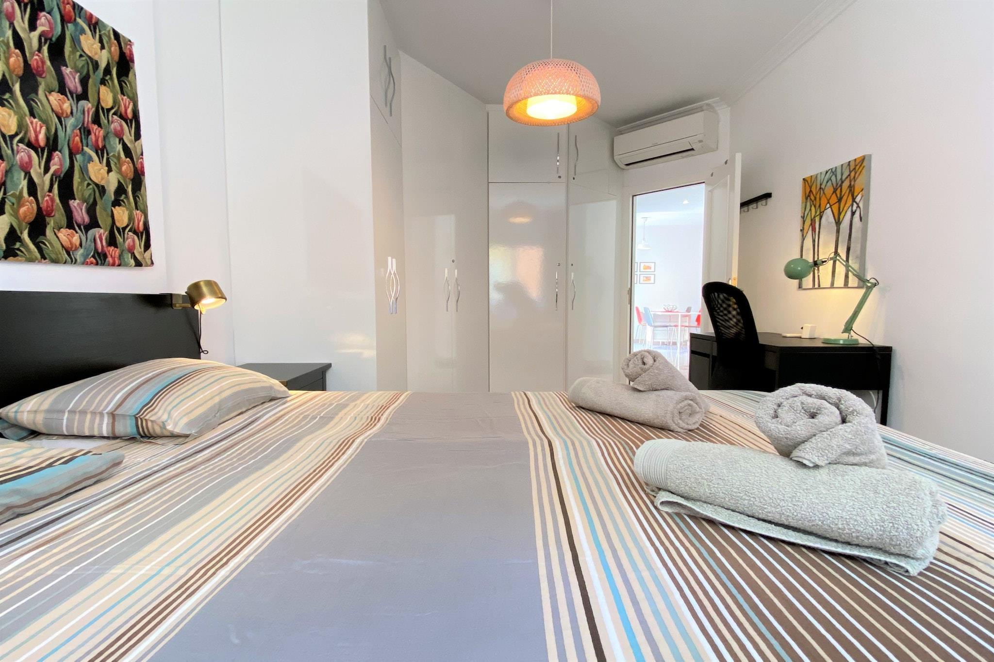 På 1. etage: (åbent køkken(elkedel, brødrister, kaffemaskine, ovn, mikrobølgeovn, opvaskemaskine , køle-fryseskab, ), stue / spisestue(enkeltsovesofa), soveværelse(dobbeltseng), badeværelse(bruser), Internetadgang) vaskemaskine, klimaanlæg, swimmingpool(deles med andre gæster), strygejern, føntørrer