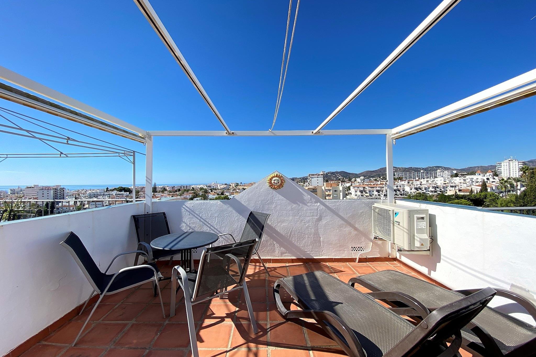 Dette moderne rækkehus med en frisk og komfortabel atmosfære er ideelt til op til fire gæster. Det har en rummelig opholdsstue med sofa, spiseplads og adgang til højhastigheds-fiberinternet og internationale tv-kanaler. Begge soveværelser er møbleret med fleksible sengearrangementer, der tilbyder enten enkelt- eller dobbeltsenge. Ejendommen inkluderer også en privat tagterrasse, en mindre terrasse på hovedplan og adgang til en stor fælles pool, der deles af kun 27 boliger i et roligt kompleks i spansk stil. Kæledyr er ikke tilladt, og huset tilbyder personlig indtjekning for en problemfri ankomstoplevelse. Rækkehuset ligger kun 700 meter fra Burriana-stranden i et fredeligt boligområde med nem adgang til lokale faciliteter. Gæsterne kan nå Nerjas pulserende centrum på 20-25 minutter til fods, mens et stort Mercadona-supermarked kun ligger 350 meter væk. Ejendommen har også udsigt over havet, byen og de omkringliggende bjerge, hvilket gør det til en naturskøn base for at udforske den andalusiske kyst. Offentlige transportforbindelser er i nærheden for nem transport til andre attraktioner eller lufthavne. Det separate køkken er nyrenoveret og veludstyret med induktionskogeplade, ovn, mikrobølgeovn, køleskab med fryser, opvaskemaskine og essentielle små apparater som kaffemaskine og brødrister. Der er et gæstetoilet i stueetagen, mens øverste niveau har et moderne badeværelse med bruser og vaskemaskine med integreret tørretumbler.