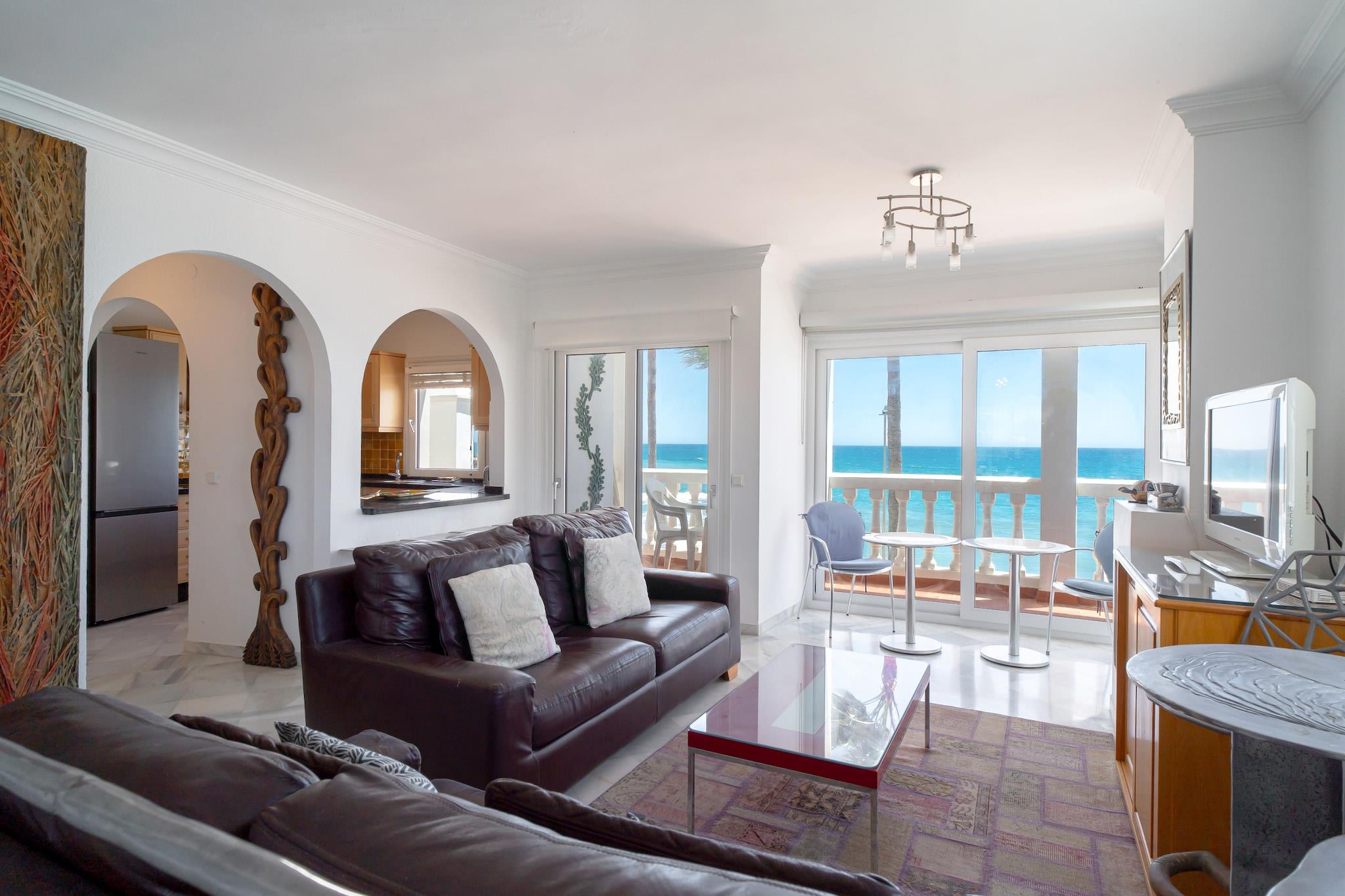 Vågn op til den beroligende lyd af bølger og Middelhavets gyldne glød i denne lyse og rummelige lejlighed med 1 soveværelse i Nerja. Med 80 m² smagfuldt møbleret interiør er dette lyse tilflugtssted perfekt til to gæster, der søger en rolig flugt ved havet. Lejligheden ligger i et familievenligt område lige ved vandet og tilbyder en betagende udsigt over både kystlinjen og de omkringliggende bjerge - en ideel blanding af natur og komfort. Kun få skridt fra din dør finder du tre fantastiske strande - El Chucho, Playazo og Torrecilla - alle inden for 100 meter, perfekte til solbadning eller en morgendukkert. En kort gåtur bringer dig til lokale favoritter som Chiringuito Mauri og La Rienda, mens den charmerende Balcón de Europa kun ligger 1 km væk til en romantisk aftentur. Det essentielle er også lige ved hånden, med Supermercado MAS kun 300 meter væk og Málaga Costa del Sol Lufthavn kun 65 km fra din fredelige base ved havet. Indenfor er lejligheden fuldt udstyret til et ubekymret ophold. Det separate gaskøkken har alt fra kaffemaskine til mikrobølgeovn, mens opholdsstuen åbner ud til en privat balkon, hvor du kan nyde din morgenkaffe med udsigt. Med aircondition i alle soveværelser, satellit-tv, Wi-Fi, vaskemaskine og adgang til en fælles pool er hver eneste detalje designet til din komfort og afslapning.