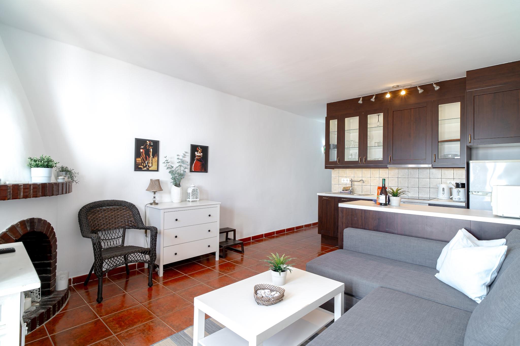 Åbent køkken(elkedel, brødrister, kaffemaskine, ovn, mikrobølgeovn, køle-fryseskab, elektriske kogeplader, , ), stue / spisestue(Fjernsyn, spisebord, pejs, sofahjørne), soveværelse(king size-seng), badeværelse(bruser, håndvask), Internetadgang, vaskemaskine, klimaanlæg, terrasse(15 m2), swimmingpool(deles med andre gæster), strygejern, føntørrer