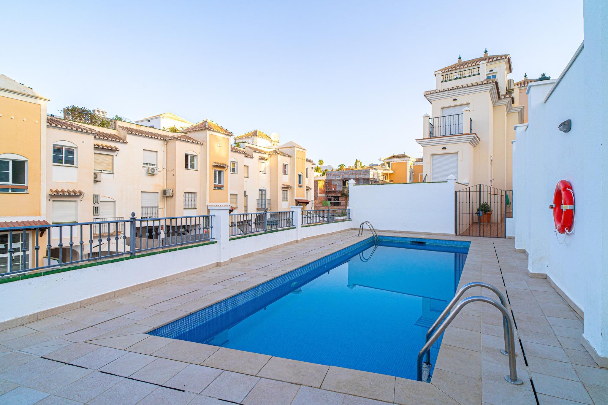 Los Aguacates Bellavista er et charmerende feriehus med en fantastisk udsigt over Middelhavet, beliggende i Nerjas fredelige Capistrano-område. Denne ejendom med to soveværelser tilbyder en rolig oase, kun 2 kilometer fra stranden. Nyd havudsigten fra både soveværelset og stuen, og vågn op til en malerisk start på dagen. Huset har to terrasser, hvoraf den ene er tilgængelig fra stuen og fører til den fælles swimmingpool, ideel til afslapning og nydelse af middelhavsklimaet. Det rummelige soveværelse tilbyder en dobbeltseng af høj kvalitet, der vender ud mod havet med en privat terrasse, der er perfekt til solbadning. Det andet soveværelse er møbleret med to komfortable enkeltsenge. Ejendommen inkluderer også et fuldt udstyret køkken, aircondition, højhastighedsinternet og internationale tv-kanaler. Et moderne badeværelse med bruser og et ekstra toilet i stueetagen øger bekvemmeligheden for gæsterne. Den smukt anlagte urbanisering Aguacates Bellavista tilbyder botaniske haver, avocadotræer og et velholdt poolområde. Parkering er let at finde, selv i højsæsonen. For ekstra bekvemmelighed kan du bestille en lufthavnstransport og anmode om en velkomstpakke med kolde drikkevarer og snacks. Personlig... Indtjekning er mulig fra kl. 16:00, med en værtschef til at tage imod dig og sikre en problemfri ankomst.