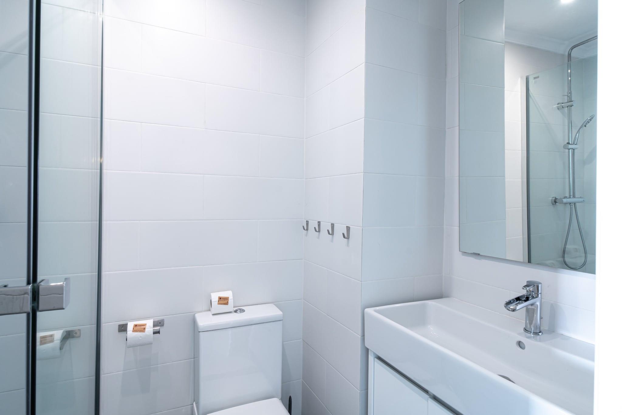 , Køkken(elkedel, brødrister, kaffemaskine, ovn, mikrobølgeovn, opvaskemaskine , køleskab, fryser, ), stue / spisestue(Fjernsyn(Smart-TV), spisebord, sofahjørne), soveværelse(enkeltseng, enkeltseng), soveværelse(dobbeltseng), badeværelse(bruser), badeværelse(bruser), Internetadgang, vaskemaskine, balkon, klimaanlæg, grill, swimmingpool(deles med andre gæster), strygejern, føntørrer, Sea view, Wine glasses