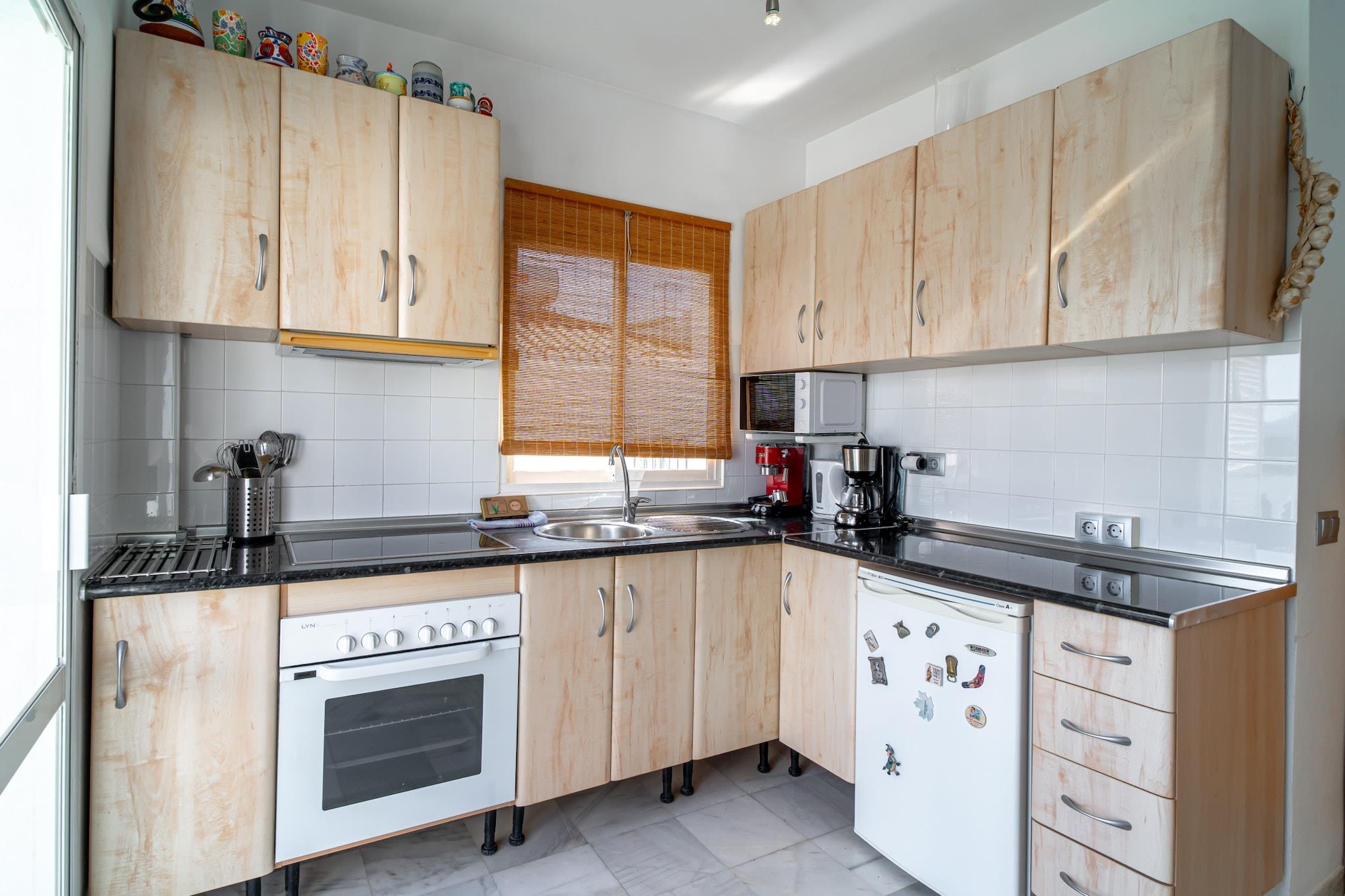 Denne lyse ferielejlighed er en moderne lejlighed med komfort og panoramaudsigt, perfekt til par, der søger en fredelig ferie ved kysten. Ejendommen har et rummeligt soveværelse med en 160x200 cm dobbeltseng og aircondition overalt for at sikre et behageligt ophold året rundt. Stuen har et hyggeligt siddeområde med direkte adgang til en privat terrasse, ideel til afslapning efter en dag på stranden. Selvom ejendommen ikke er kæledyrsvenlig, tilbyder den valgfri ekstraudstyr såsom en velkomstpakke, babyseng og højstol for at øge gæsternes bekvemmelighed. Udendørs servering og en grill på terrassen indbyder til måltider under åben himmel med spektakulær udsigt over havet og bjergene. Lejligheden ligger i et roligt område af Nerja, kun 600 meter fra den populære Burriana-strand, kendt for sin pulserende atmosfære, restauranter ved stranden og vandaktiviteter, herunder kajaksejlads og paddlesurfing. Supermarkeder som Mercadona og Carrefour ligger også kun 600 meter væk, hvilket gør det nemt at handle dagligvarer. Et lokalt busstoppested 200 meter fra ejendommen forbinder gæsterne med resten af byen, mens der er nem gadeparkering, selv i højsæsonen. Lufthavnstransport kan også arrangeres for en problemfri rejseoplevelse. Lejligheden har et fuldt udstyret åbent køkken, perfekt til at tilberede måltider med moderne apparater og madlavningsudstyr. Højhastighedsinternet og tv sørger for underholdning, mens det rene og velholdte badeværelse sikrer komfort under dit ophold.