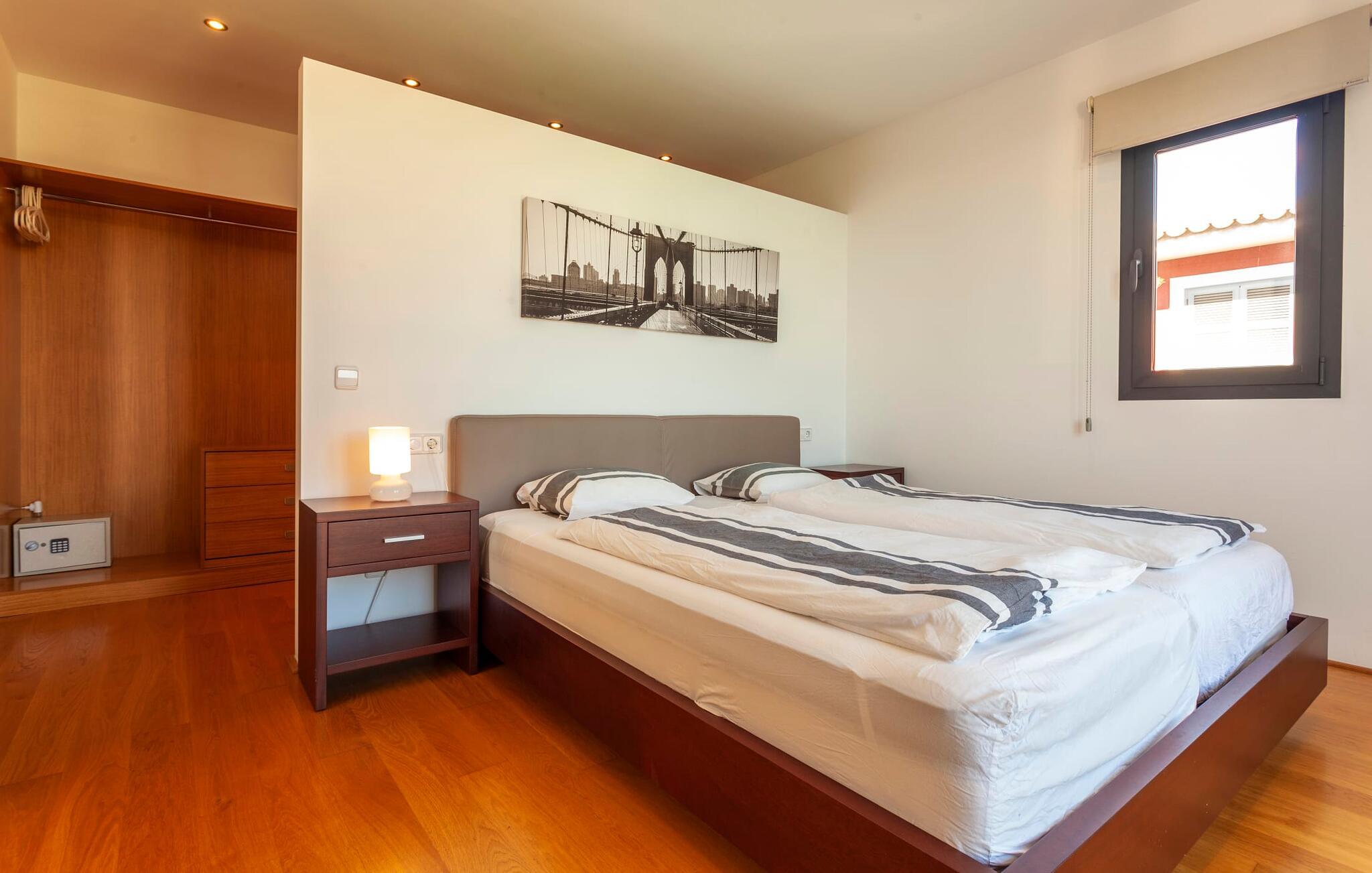 Det indre af den fuldt klimatiserede villa passer perfekt til det moderne ydre. Klare linjer og harmoniske, naturlige farver dominerer, og takket være dekoratørernes trænede blik for detaljer som møbler, boligtilbehør og tekstiler er der skabt en afdæmpet, men indbydende varm atmosfære. Både par og familier med børn føler sig straks hjemme her. Alle rum er vidunderligt lyse takket være store vinduer. I stueetagen findes et dobbeltværelse med badeværelse samt det smarte grå køkken med et lille bord til morgenkaffen og den åbne stue- og spisestue. Mens den store sofa indbyder til timevis af afslapning og fjernsynskiggeri, finder I lige ved siden af et langt spisebord med elegante stole med satinpuder, der stråler i lyset fra lysekronen. Her kan I sidde sammen i ro og mag, nyde velsmagende måltider og lade de oplevelsesrige feriedage passere i revue.