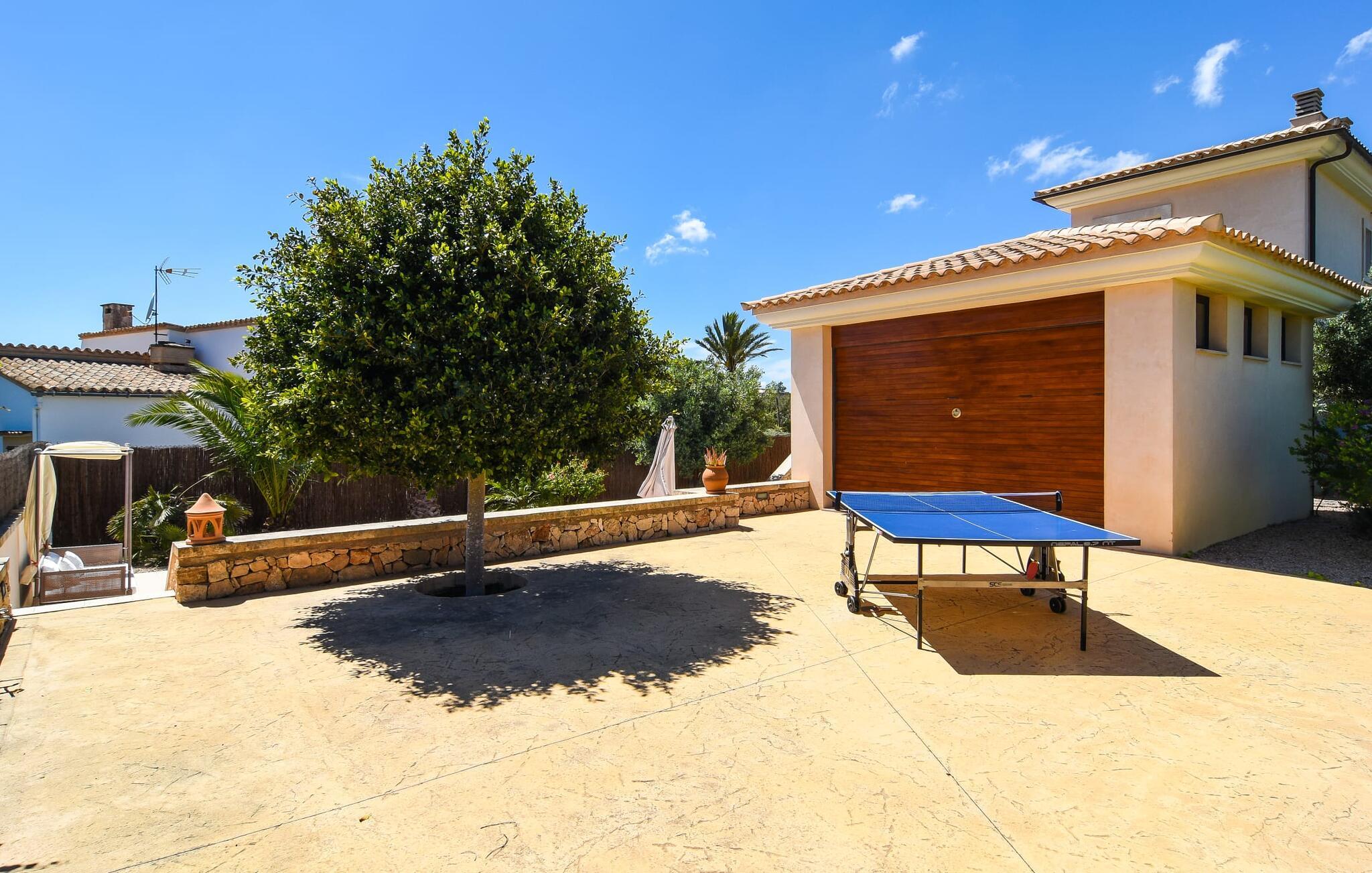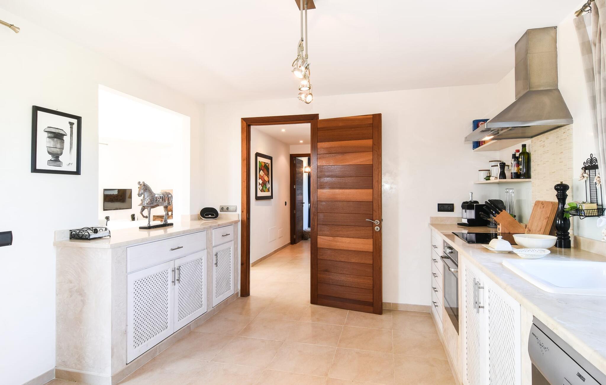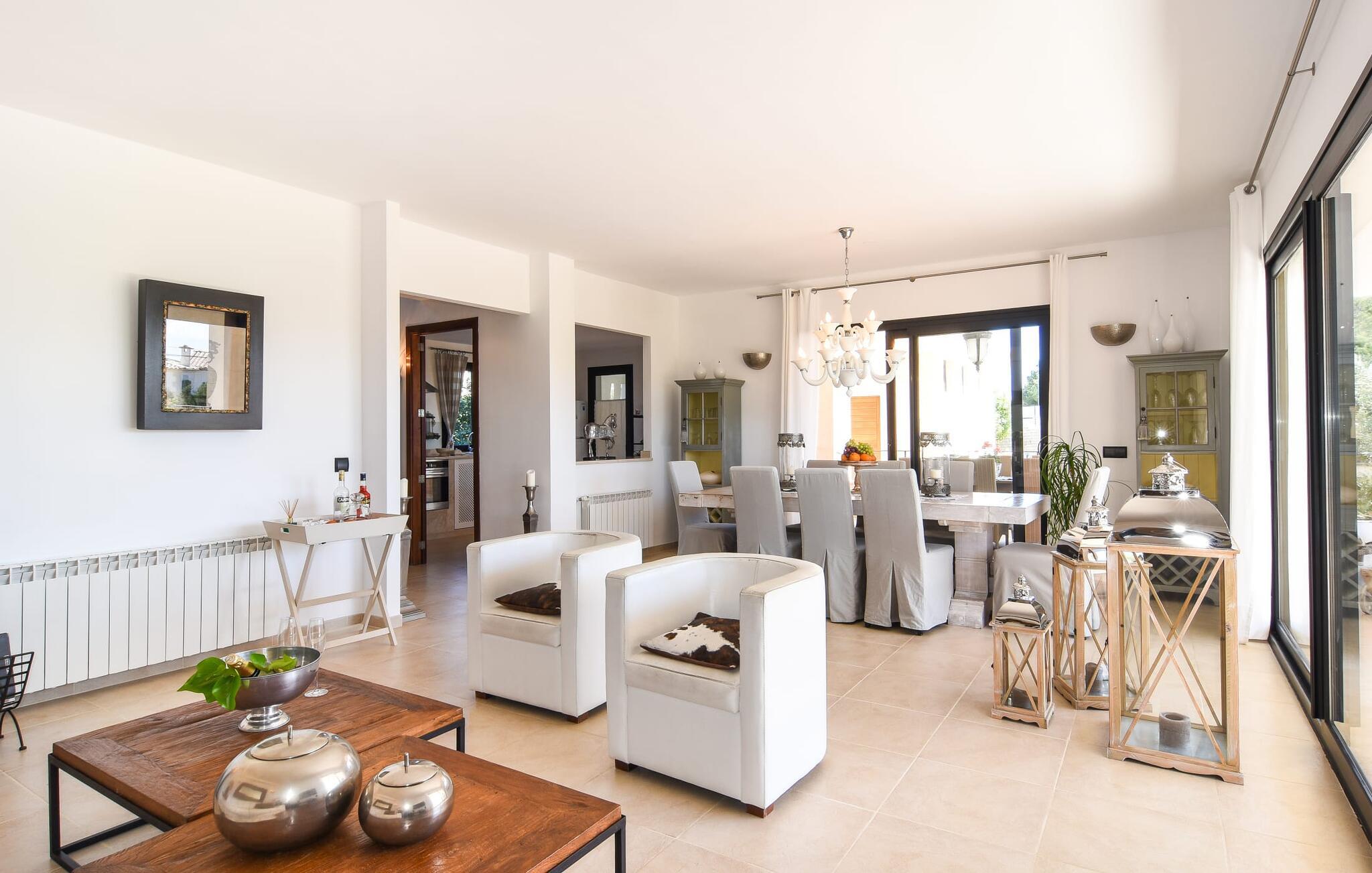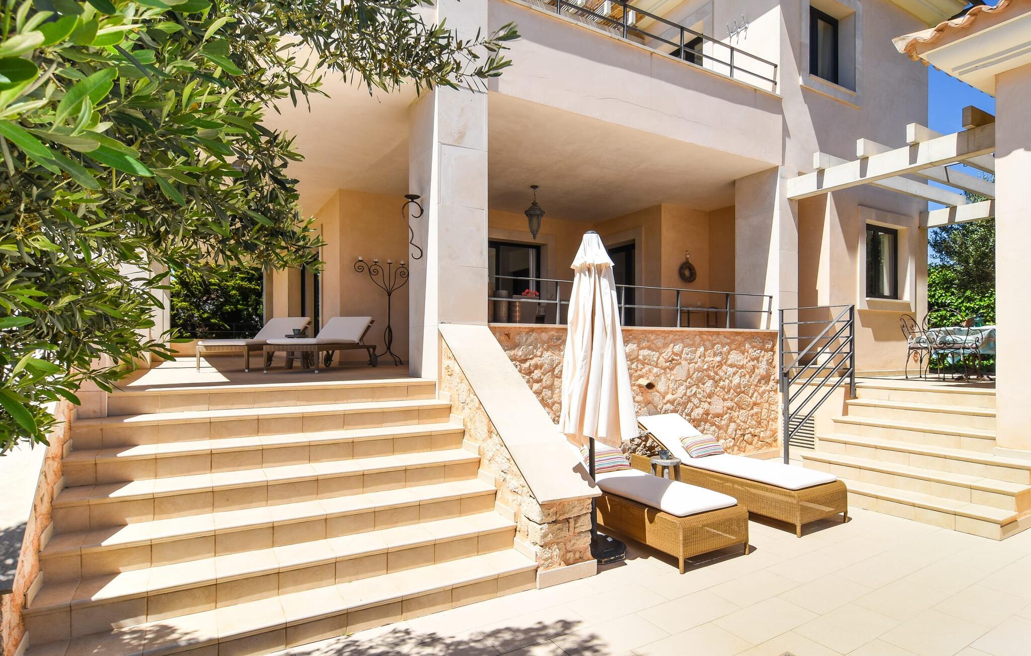 “Ocean Blue” – det er det lovende navn på denne byvilla, der ligger på Mallorcas smukke sydøstkyst. Her er nogle af højdepunkterne i drømmevillaen. Ejendommen består stort set af en helt sydvendt terrasse og poolområde. Poolen er tilgængelig via en lav sidetrappe og er placeret på en naturstensterrasse. Der er plads nok på terrassen til komfortable poly-flet liggestole og endda en kølig dagseng i Bali-stil. Middelhavsblomstrende planter som hibiscus, nogle palmer og oliventræer omgiver det lille, men meget attraktive udendørsområde. Selvom villaen er beliggende i en urbanisering af høj kvalitet med nabohuse, er poolområdet ikke synligt, og privatlivets fred er meget godt beskyttet i hele ejendommen. En trappe fører til villaens overdækkede terrasse, som er L-formet. Der er god plads til liggestole og et massivt træbord med trendy højryggede rattanstole. Et andet mere romantisk opholdsområde på en slags terrasse lige ved siden af køkkenet er udstyret med et delikat bistromøbelsæt. Ydermere er der ovenpå en indbydende, delvist overdækket udsigtsplatform og et afslappet loungehjørne, der er tilgængeligt fra to af soveværelserne. Uanset om det er dag eller nat, kan I slappe helt af og nyde den fænomenale havudsigt. Når vi træder ind i denne 5-stjernede ejendom, møder vi en eksemplarisk indretningsstil, der fuldstændig imponerer med sin elegante, tidløse stemning via gulv-til-loft, antracitfarvede vindueselementer, der bader interiøret i denne smarte villa i smukt lys. De lyse rum er indrettet med overvejende hvide møbler og højkvalitets tilbehør af metal og træ i rustik-moderne landstedsstil med vintage-touch, som det også kan ses i den kombinerede opholds- og spiseafdeling. Højkvalitets, massive mørke trædøre adskiller rummene. Marès-sten af høj kvalitet, som har sin naturlige oprindelse på De Baleariske Øer, blev ofte brugt. Det trendy køkken er udstyret med indbyggede skabe, der svarer til stilen fra et tidligere gårdkøkken - alt i hvid af høj kvalitet. Det moderne, fuldt udstyrede køkken gør selvforplejning til en fornøjelse. Enkeltværelset med enkel og elegant indretning samt badeværelse, der også sagtens kan bruges som gæstebadeværelse, er placeret i stueetagen. En trætrappe, som bliver til et galleri, fører til det øverste niveau, hvor de tre andre soveværelser er placeret; alle med aircondition. Sengene i de rummelige værelser måler alle 1,80 mx 2 m. To trendy afslapningsrum deler det ene af de to badeværelser, hovedsoveværelset har eget badeværelse. Hvert en-suite badeværelse har indretning af høj kvalitet - smukt flisebelagt med brusekabine fra gulv til loft: I hovedbadeværelset er der endnu et stort badekar, hvor I kan nyde panoramaudsigten, mens I slapper af i badekarret. Fra den allerede beskrevne solterrasse på dette niveau kan I byde den nye dag velkommen, mens I nyder den let salte brise, der blæser fra havet. Villaen har en privilegeret beliggenhed mellem de to kystbyer Cala Santanyi og Cala Figuera. Cala Santanyi er også inden for gåafstand. Denne lille bugt med fint sand er kendetegnet ved sin flade, børnevenlige kyst og sin lyse azurblå farve: Enhver, der sidder på trappen til de gamle fiskerhytter og ser på det imponerende klippepanorama over det glitrende vand, ved, at man endelig er på ferie. I bør bestemt ikke gå glip af en tur til den maleriske fiskerihavn Cala Figuera (ca. 1,3 km væk). Denne fjordlignende "figenbugt" er stadig udgangspunktet for fiskere. Samtidig finder I nogle rigtig gode restauranter langs den smukke promenade, der serverer friskfanget fisk. På grund af dens beliggenhed i en urbanisering er der noget støj fra gaden, men det bruges hovedsageligt af lokale beboere, nabobyer er nemme at nå, herunder Santanyi, som blev grundlagt i 1200-tallet. Her kan I gå en tur gennem maleriske gader og finde en hyggelig bodega og tapasbar for at afslutte jeres afslappende dag. Den maritime villa "Ocean Blue" er beliggende i den velholdte urbanisering Se Torre Nova nær Cala Santanyi. Det skylder sit navn til dets nærhed til havet, da den smukke sandbugt Cala Santanyi ligger kun et stenkast væk og kan også nås til fods. Daglig indkøb kan foretages i Santanyi, hvor det ugentlige marked finder sted hver onsdag. Den maleriske fiskerihavn Cala Figuera ligger kun 1,3 km væk og kan nemt nås til fods.