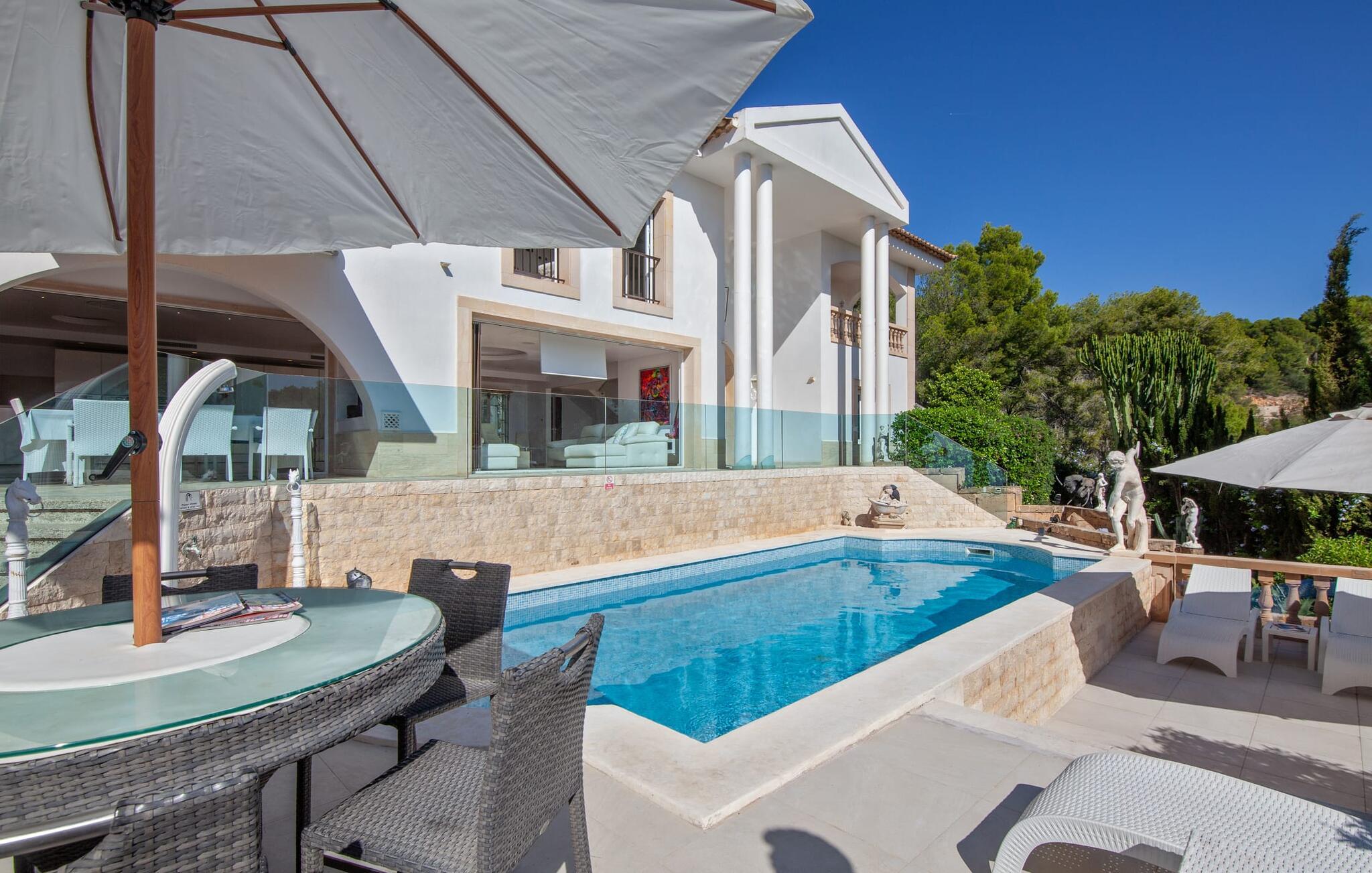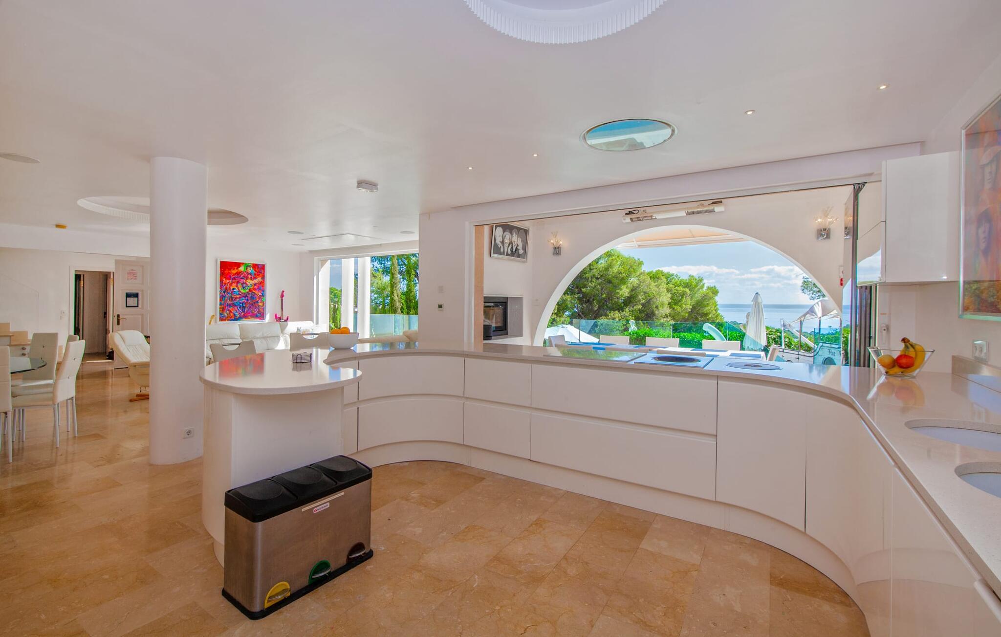 På grund af sin beliggenhed i bakkerne i Portal Nous kan I nyde den perfekte udsigt over havet fra villaen "Ocean View". Samtidig venter der jer adskillige højdepunkter i det varierede udendørsområde: en pool med en omgivende terrasse og liggestole, et udendørs køkken/bar med tv og poolbord, en professionel grillstation og en chillout-lounge. Legepladsen med et piratskib byder også på masser af legemuligheder for de yngre gæster. En overdækket spiseplads ved huset giver jer mulighed for at spise jeres måltider i en familievenlig atmosfære. I kan også nyde en fascinerende panoramaudsigt fra soveværelsets balkoner og terrasser. Det luksuriøse feriehus er indlejret i Middelhavets grønne bakker og tårner sig imponerende op over havet. Luksusferiefølelsen fortsætter i det indre af den elegante villa. Et overdækket spabad venter på jer. Hvis I kan lide at dyrke sport på ferien, kan I træne i hotellets fitnesscenter. Bagefter finder I varme og afslapning i den private sauna. Den fantastiske villa "Ocean View" er derfor ideel til helårsbrug. Udover sportslokalerne er det eksklusive design af de overvejende hvide møbler også imponerende. Det hvide højglans køkken vil glæde enhver amatørkok. De fem soveværelser varierer mellem brug af børn eller voksne, hvilket fremhæver familievenligheden i dette fantastiske feriehus. Tre badeværelser fås i et flot design. Aircondition, downlights, lydsystem, WiFi med mulighed for hjemmekontor og forskellige smart-tv'er kaster denne førsteklasses familievilla ind i premiumsegmentet. Denne elegante og familievenlige ferievilla byder på ren luksus både inde og ude. Ejendommen af høj kvalitet er beliggende i bakkerne i landsbyen Portal Nous mellem Palma og Calvià i den sydvestlige del af øen. Shoppingmuligheder kan findes i de omkringliggende byer som Palmanova, Palma eller Calvià. Villaen ligger 700 m fra Cala Bendinat og andre sandstrande.