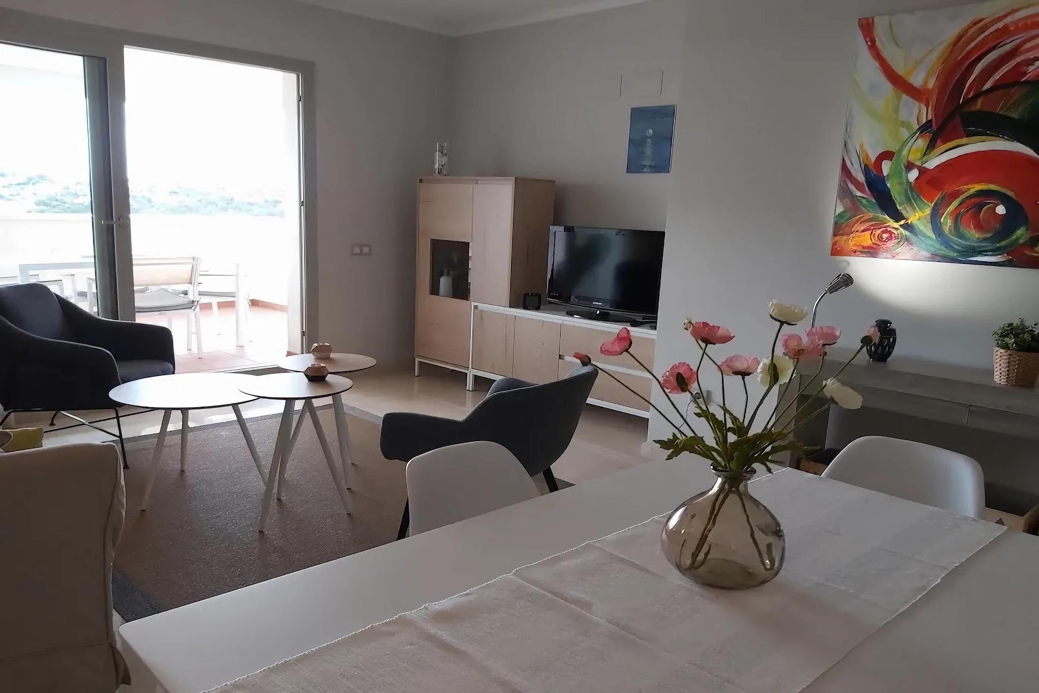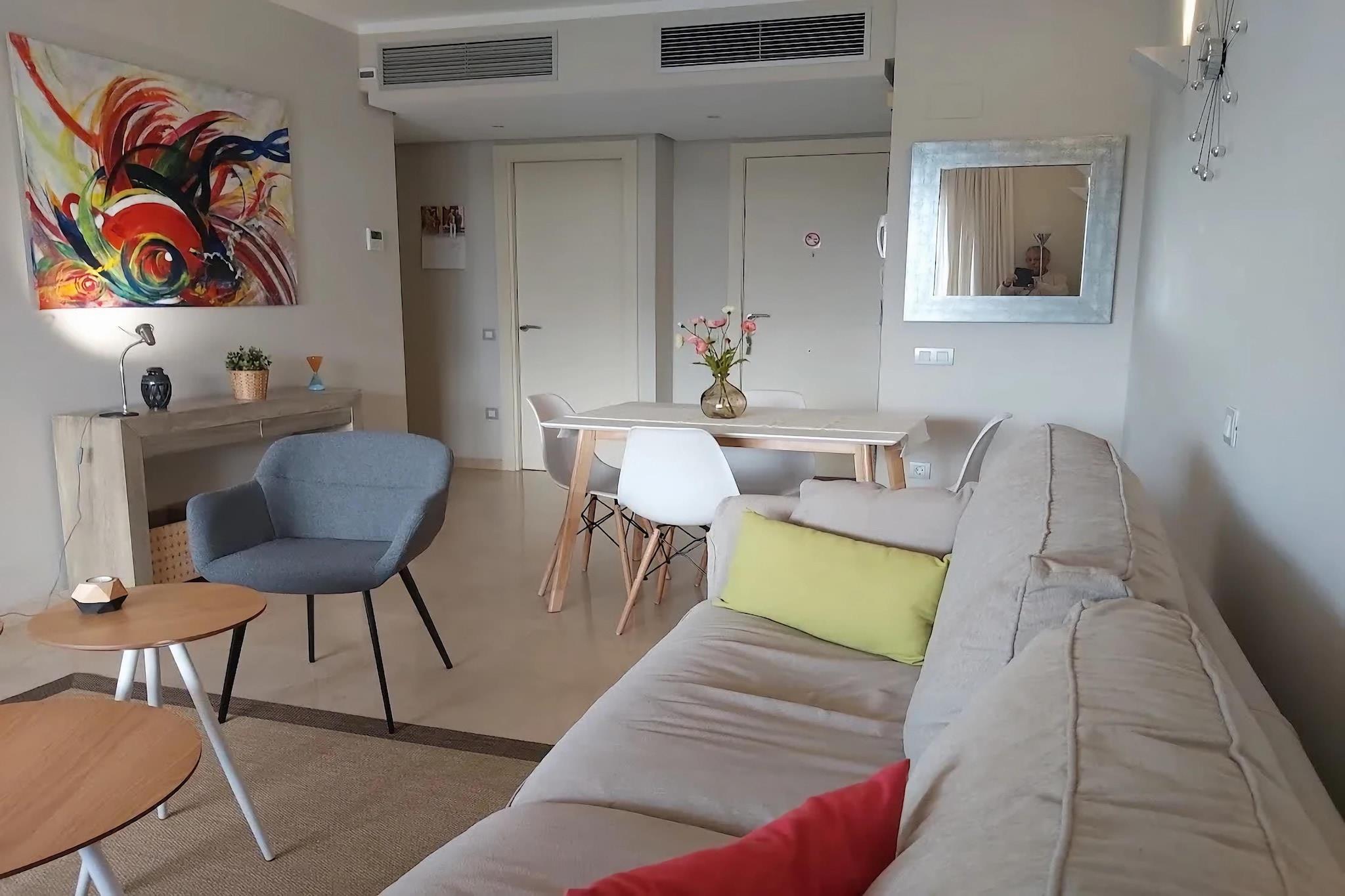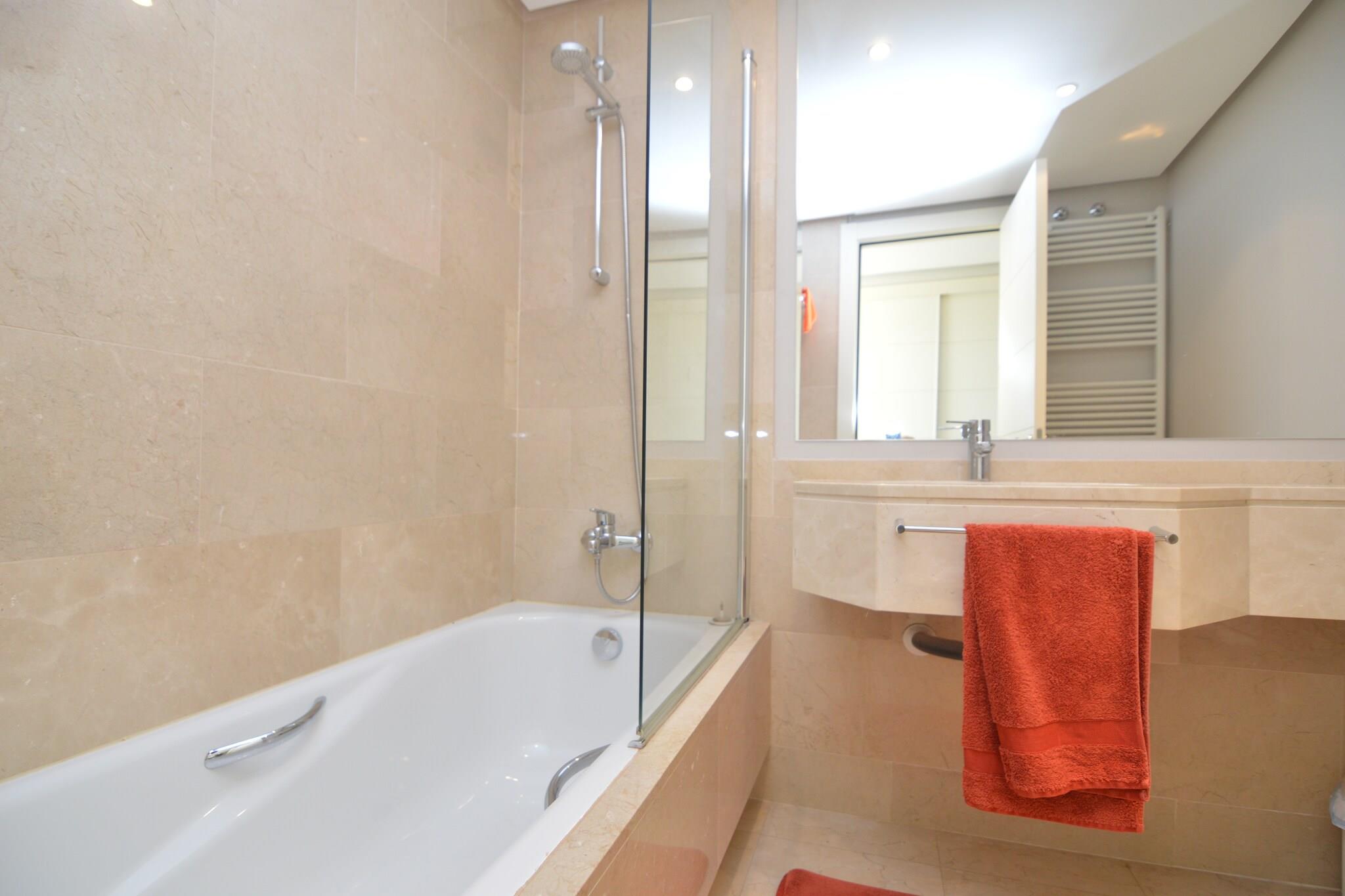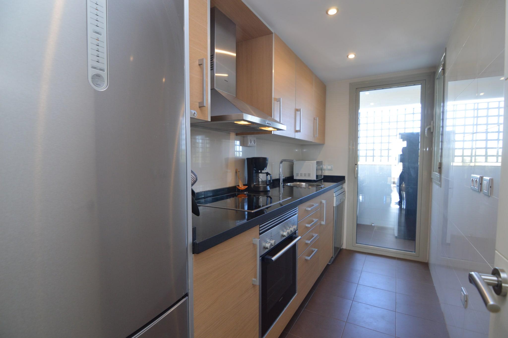 På 2. etage: (Køkken(komfur(glaskeramisk), emhætte, kaffemaskine, ovn, mikrobølgeovn, opvaskemaskine , vaskemaskine), stue / spisestue(Fjernsyn(Internationale TV-kanaler), spisebord, sofahjørne, klimaanlæg), soveværelse(2x enkeltseng, klimaanlæg), Soveværelse med badeværelse(2x enkeltseng, Fjernsyn, badekar med bruser, håndvask, toilet, klimaanlæg), badeværelse(bruser(Walk-in-bruser), håndvask, toilet), balkon) fitnessrum(deles med andre gæster), sauna(deles med andre gæster), have(deles med andre gæster), havemøbler, solstole, parkering, swimmingpool(deles med andre gæster), legeredskaber, elevator