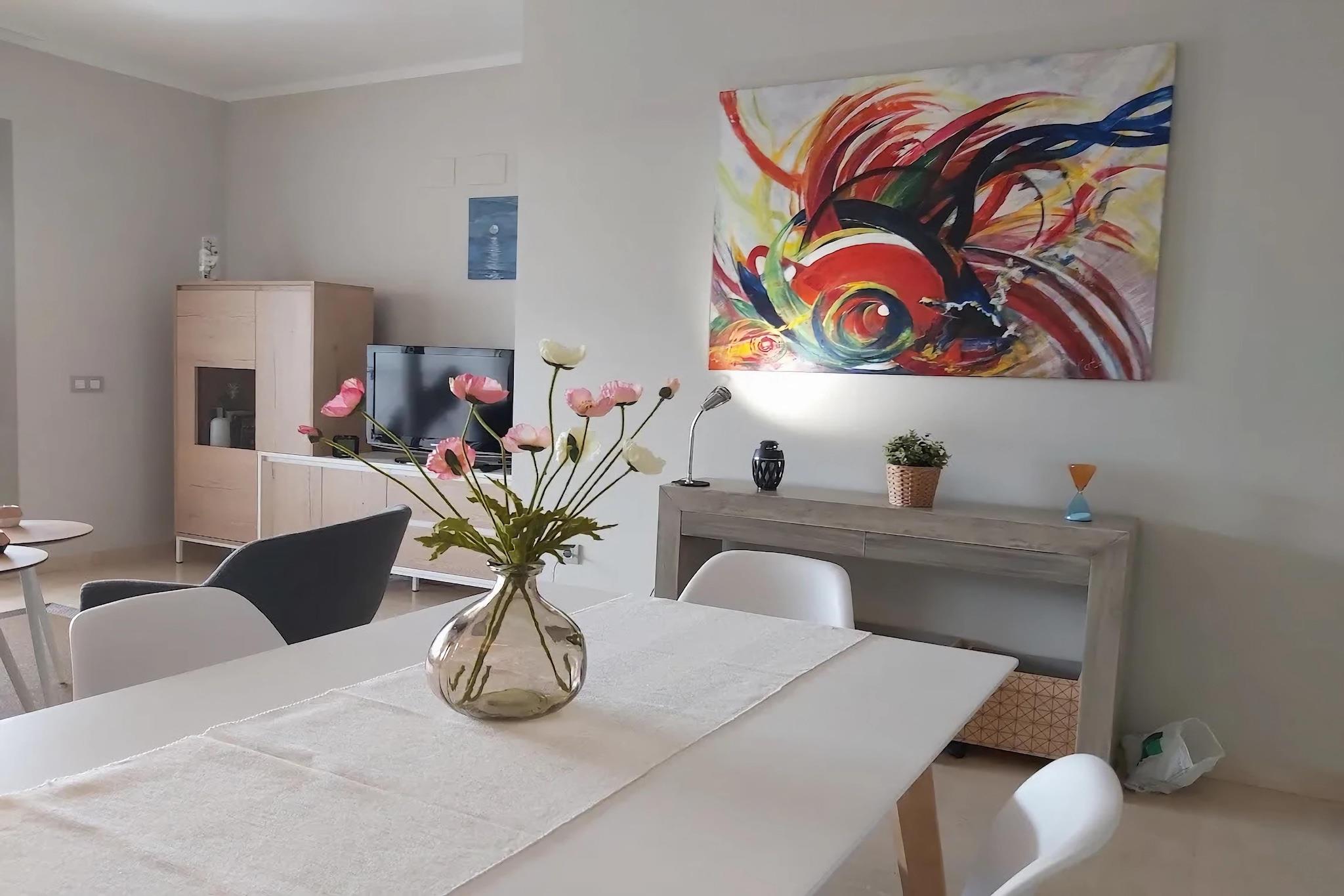 Beliggende i den prestigefyldte Las Colinas Golf & Country Club, tilbyder denne elegante 2-værelses lejlighed en fredfyldt flugt for op til 4 gæster. Beliggende på 2. sal med elevator adgang, det har to moderne badeværelser, aircondition og en privat terrasse med betagende udsigt over havet og frodige grønne fairways, perfekt til morgenmad ved solopgang. Gæsterne kan nyde en smukt anlagt fælles pool og adgang til faciliteter i verdensklasse kun 500 meter væk, herunder et sports- og sundhedscenter med tennis, padel, fitnesscenter og wellness-faciliteter. Spisning er en fornøjelse med tre internationale restauranter i nærheden, herunder italienske og sushi-muligheder. Lejligheden har WiFi og internationale tv-kanaler til din underholdning. Udforsk nærliggende byer som Alicante, Cartagena og Torrevieja, eller slap blot af i denne eksklusive enklave, hvor natur, luksus og fritid mødes.