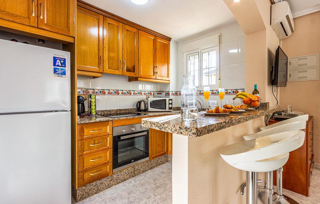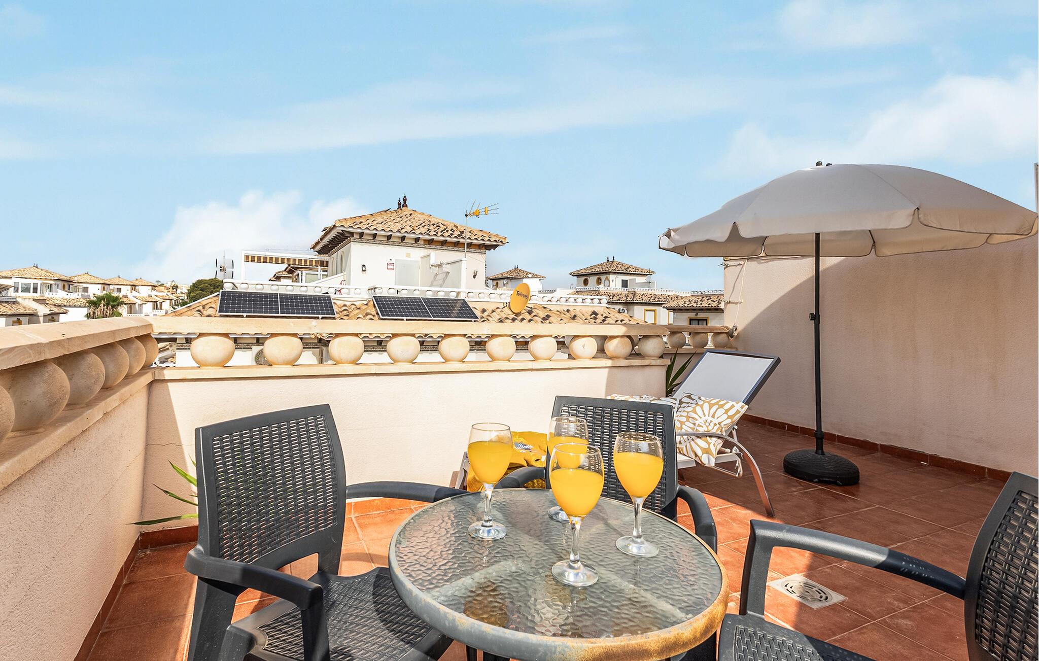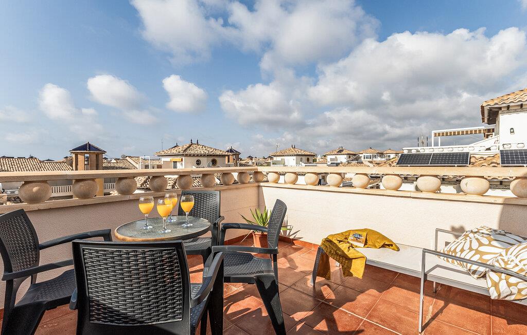 Velkommen til dette stilfulde rækkehus på Orihuela Costa, som skaber en indbydende atmosfære med sin varme farvesammensætning og vellykkede kombination af traditionel og moderne indretning. De komfortable møbler, flere balkoner og en tagterrasse lægger op til at solbade, spise udendørs eller blot nyde udsigten. Her finder I det ideelle sted til afslappende dage med familien eller venner. En fælles swimmingpool giver jer mulighed for at køle ned og giver børnene mulighed for at knytte ferievenskaber med nabolagets børn.