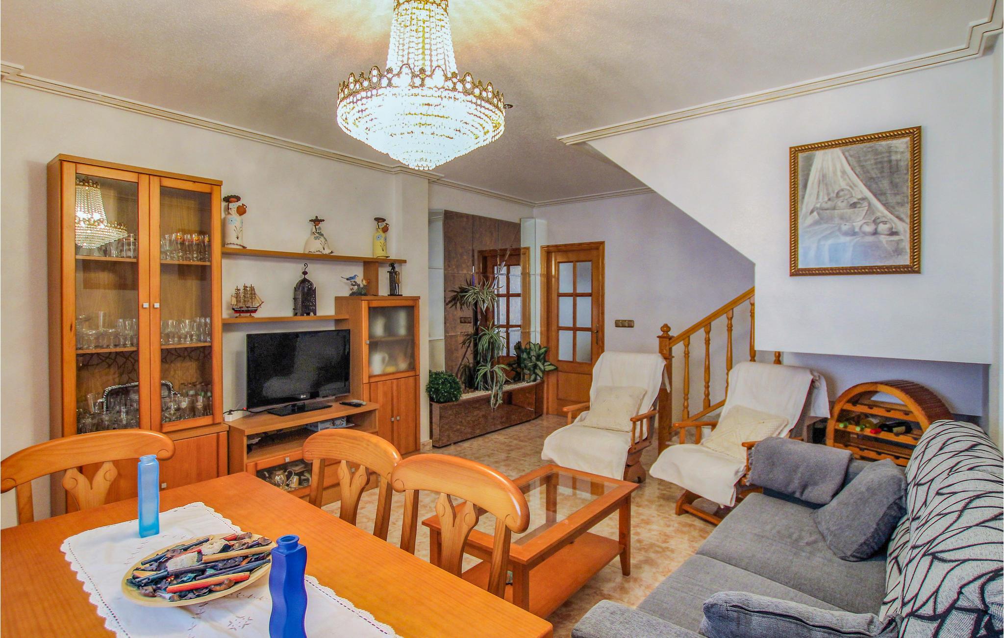 I Orihuela Costa ligger dette skønne feriehus i kvarteret La Zenia, ca. 900 m fra Costa Blancas strand. Huset er fordelt på tre etager med den hyggelige stue, et separat køkken med spiseafdeling og et badeværelse. To soveværelser og et yderligere badeværelse ligger på første sal og på øverste etage ligger det tredje soveværelse helt privat. Fra to af de tre soveværelser er der udgang til balkon. På den store terrasse står en muret grill og i anlæggets fælles pool kan I svømme uanset årstid. På få minutter kan I gå til de nærmeste restauranter og butikker og der er tre km til nærmeste golfbane hvor I kan gå en runde eller to.