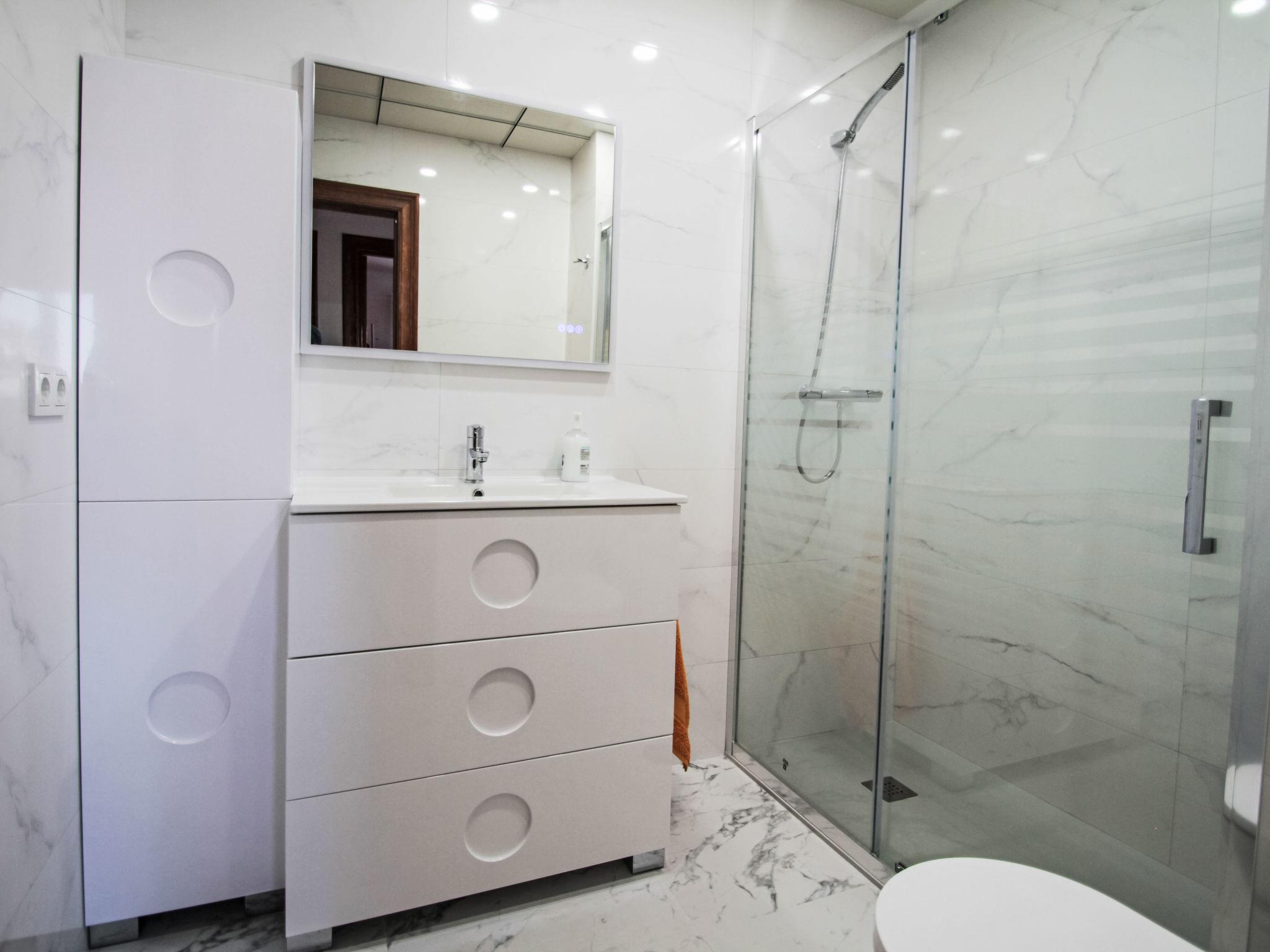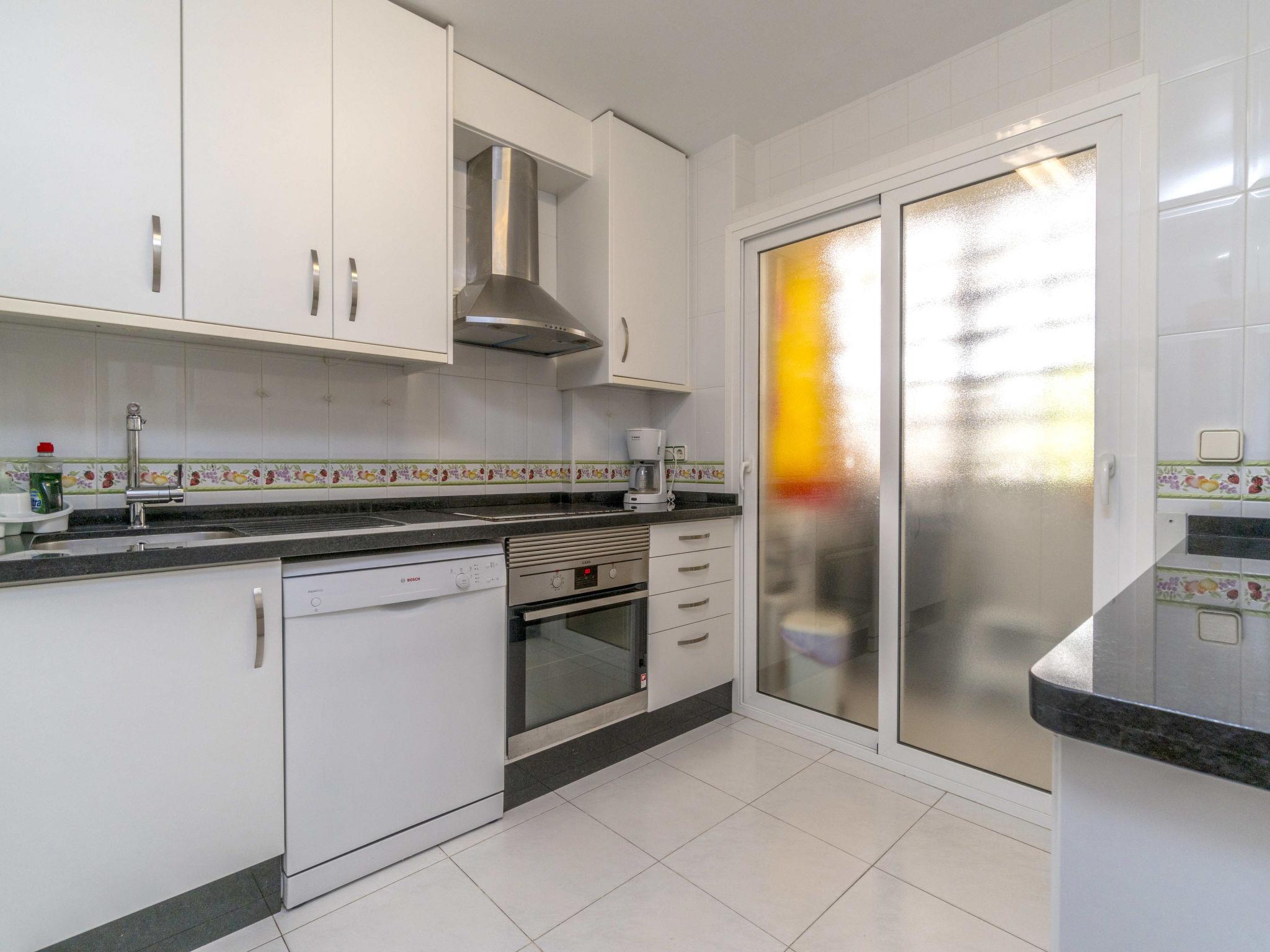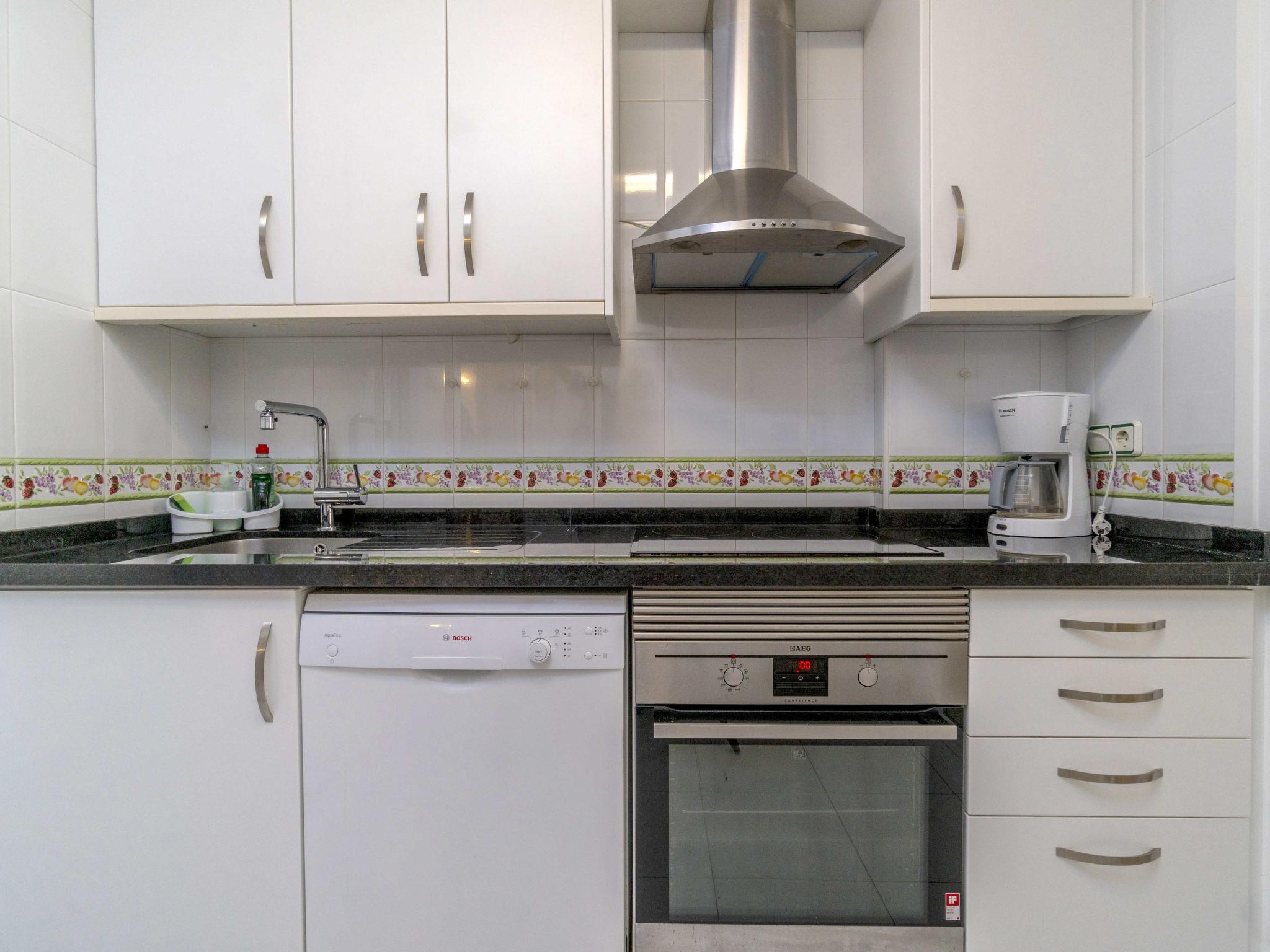3-room apartment 67 m2. Bright, comfortable furnishings: living/dining room with dining table, international TV channels, flat screen, radio, hi-fi system, air conditioning and forced-air heating. Exit to the terrace. 1 room with 1 french bed (150 cm, length 190 cm), electric heating and fan. 1 room with 1 pull-out bed (2 x 90 cm, length 190 cm), fan. Kitchen (oven, dishwasher, 4 ceramic glass hob hotplates, toaster, microwave, freezer, electric coffee machine). Shower/bidet/WC. Electric heating. Terrace. Terrace furniture. Very beautiful view of the sea. Facilities: washing machine, dryer, iron, hair dryer. Internet (WiFi, free). Parking. Please note: suitable for families. Non-smokers only. Private entrance, smoke alarm. VT-467042-A // Reg. Nr.: ESFCTU00000304800056836300000000000000000VT-467042-A0