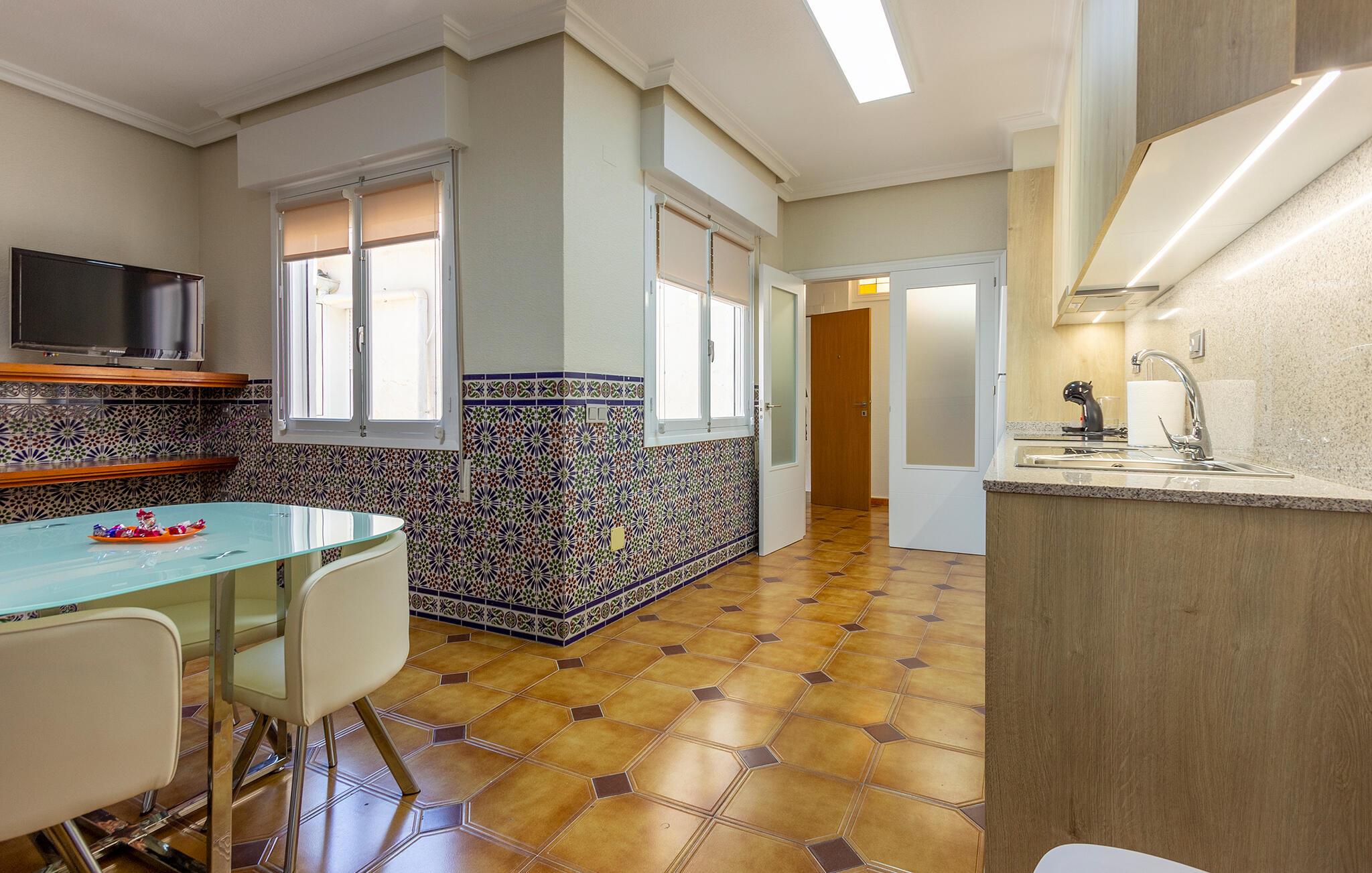 Velkommen til denne rummelige lejlighed, der ligger i et roligt kvarter og byder på godt med plads til en ferie med en større familie eller venneflok. Her får I en herlig base for mange fine udflugter og badeture i en lejlighed, der er lyst og smagfuldt indrettet. Nyd godt af det hjemlige interiør, der prydes af traditionelle vægfliser, moderne komfort og et veludstyret køkken, hvor familiens kokke kan kræse om livretterne efter en skøn dag på farten.