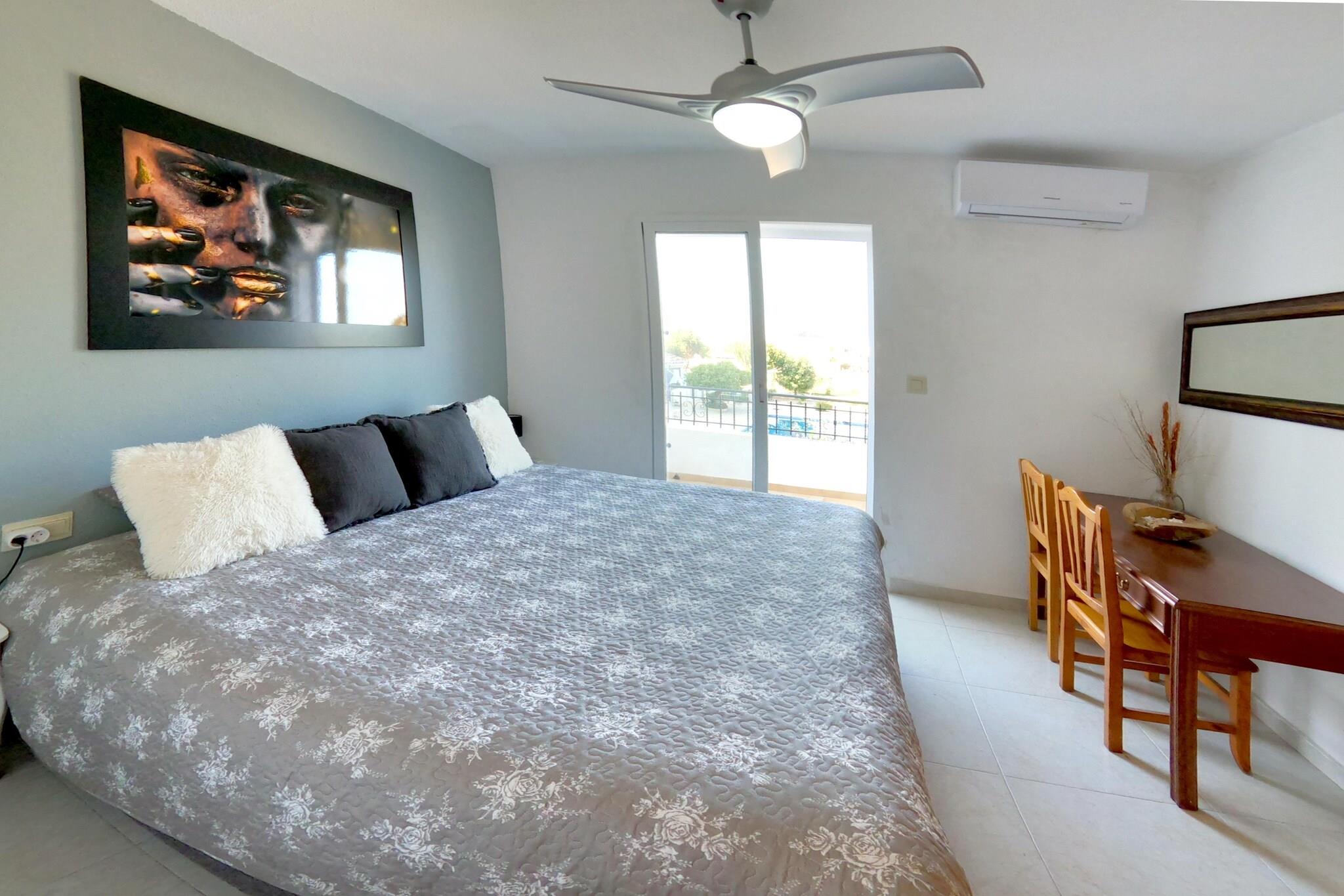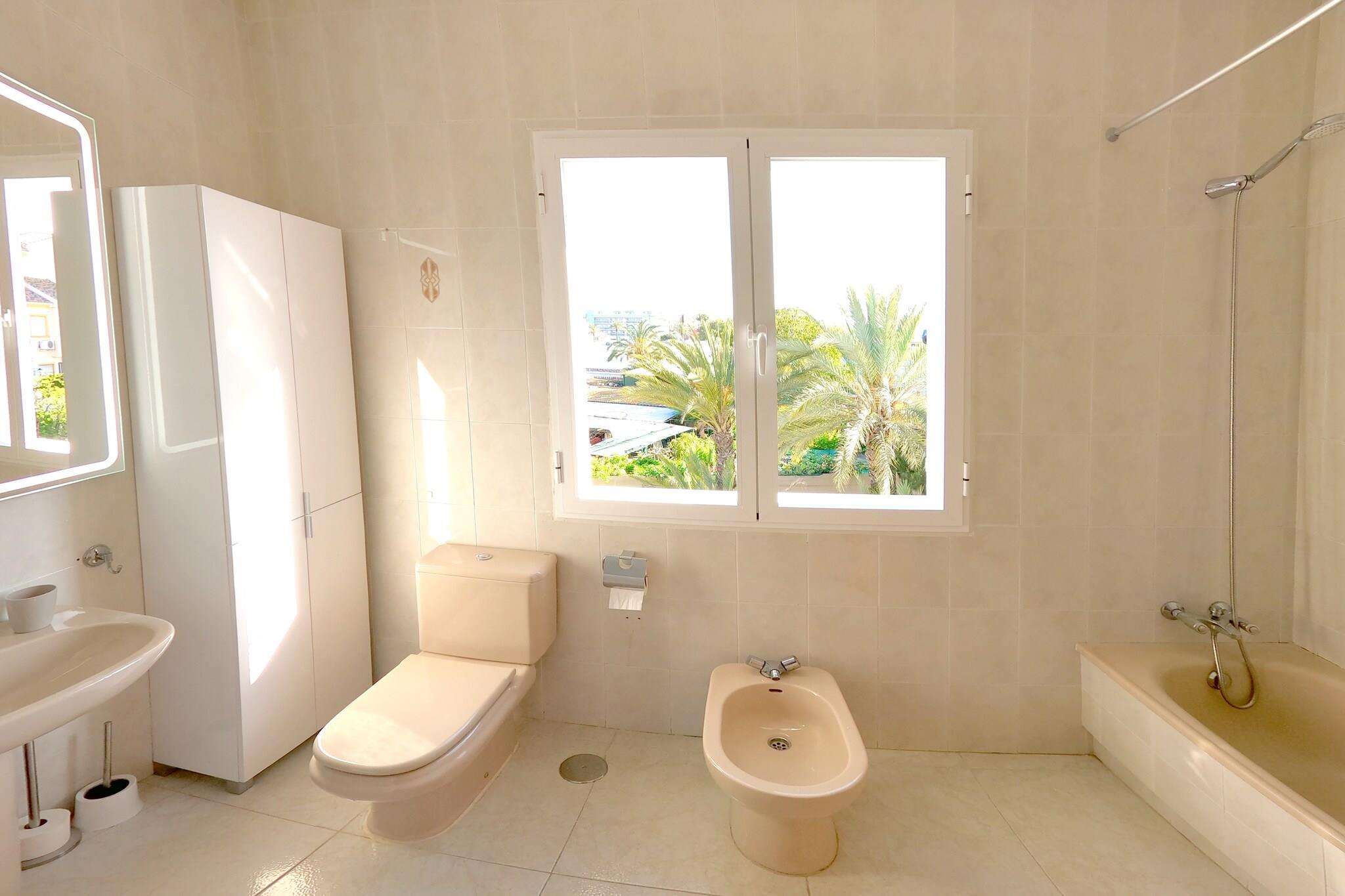 Stueetage: (Stue(Fjernsyn, hyggepejs, sofahjørne, klimaanlæg), åbent køkken(kogeplade(glaskeramisk), elkedel, kaffemaskine(kaffepude), ovn, mikrobølgeovn, køle-fryseskab), toilet(toilet)) På 1. etage: (soveværelse(dobbeltseng, balkon, klimaanlæg), soveværelse(dobbeltseng, klimaanlæg), badeværelse(bruser(Walk-in-bruser), håndvask, toilet)) På 2. etage: (soveværelse(dobbeltseng, balkon, klimaanlæg), badeværelse(badekar med bruser, håndvask, toilet, bidet)) vaskemaskine, havedøre, have, havemøbler, solstole, grill, Parasol, swimmingpool(deles med andre gæster), cykler til rådighed, barneseng, barnestol, strygebræt, strygejern