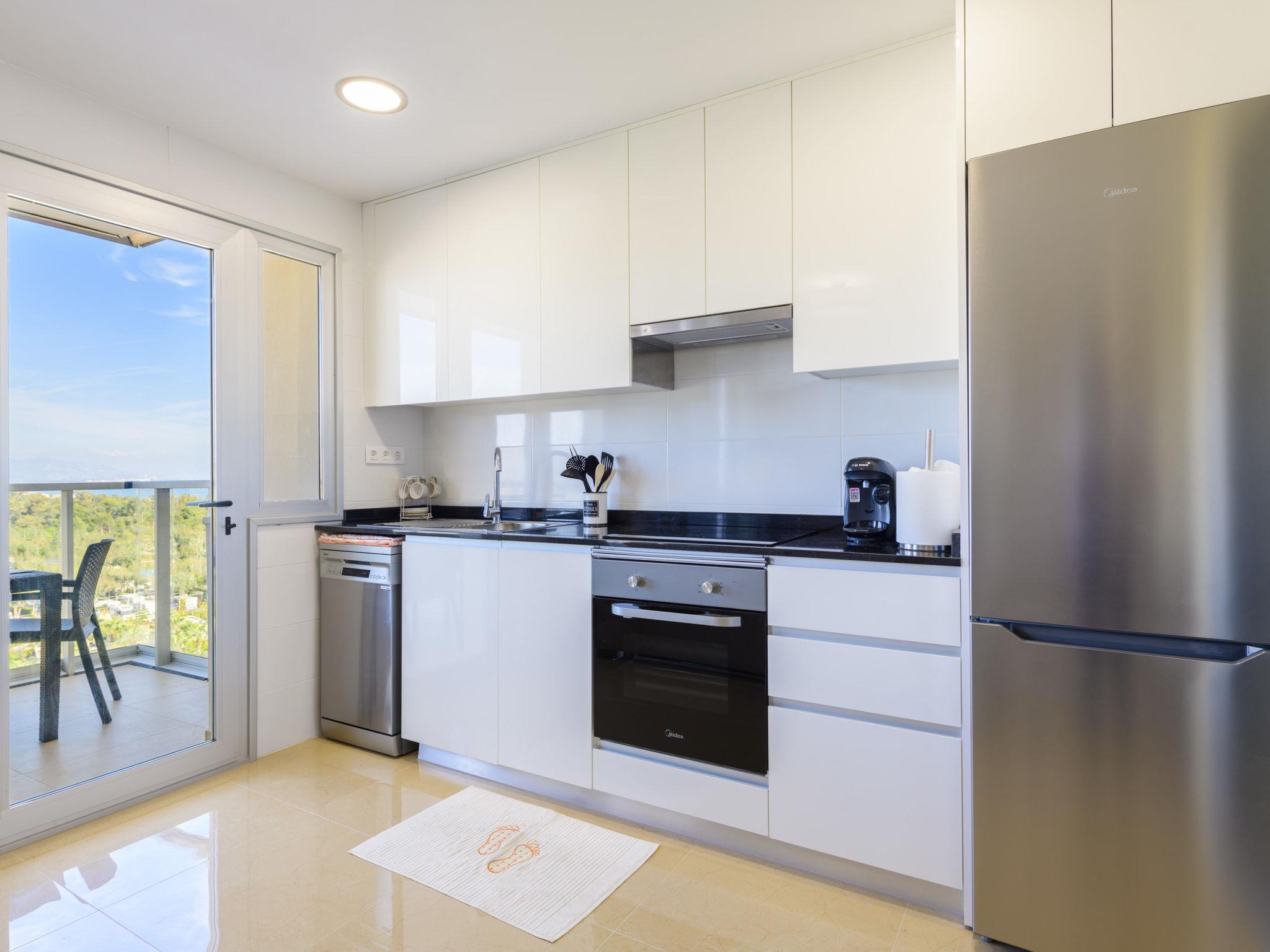 "Ciudad Jardin", 3-room apartment 80 m2 on 8th floor. Practical and comfortable furnishings: living/dining room with dining table, digital TV, flat screen, air conditioning and forced-air heating. Exit to the terrace. 1 room with 1 french bed (150 cm, length 200 cm), bath/bidet/WC, air conditioning and forced-air heating. 1 room with 2 beds (90 cm, length 200 cm), air conditioning and forced-air heating. Kitchen (oven, dishwasher, 3 induction hot plates, toaster, microwave, freezer). Shower/bidet/WC. Large terrace 19 m2. Terrace furniture. View of the sea and the resort. Facilities: washing machine, iron, hair dryer. Internet (WiFi, free). Parking space n 154 (roofed) at the house. Please note: non-smokers only. VT-44531-CS