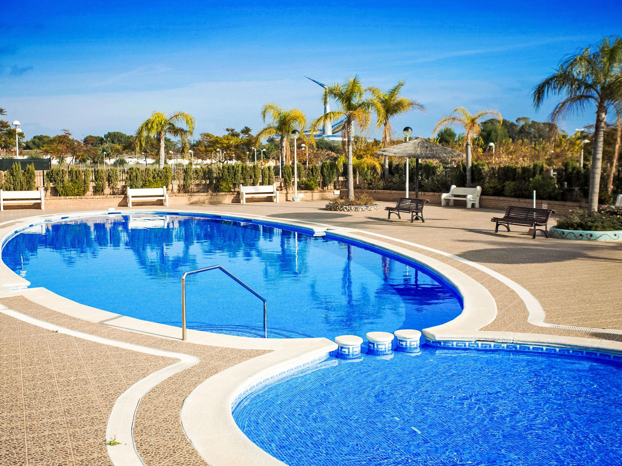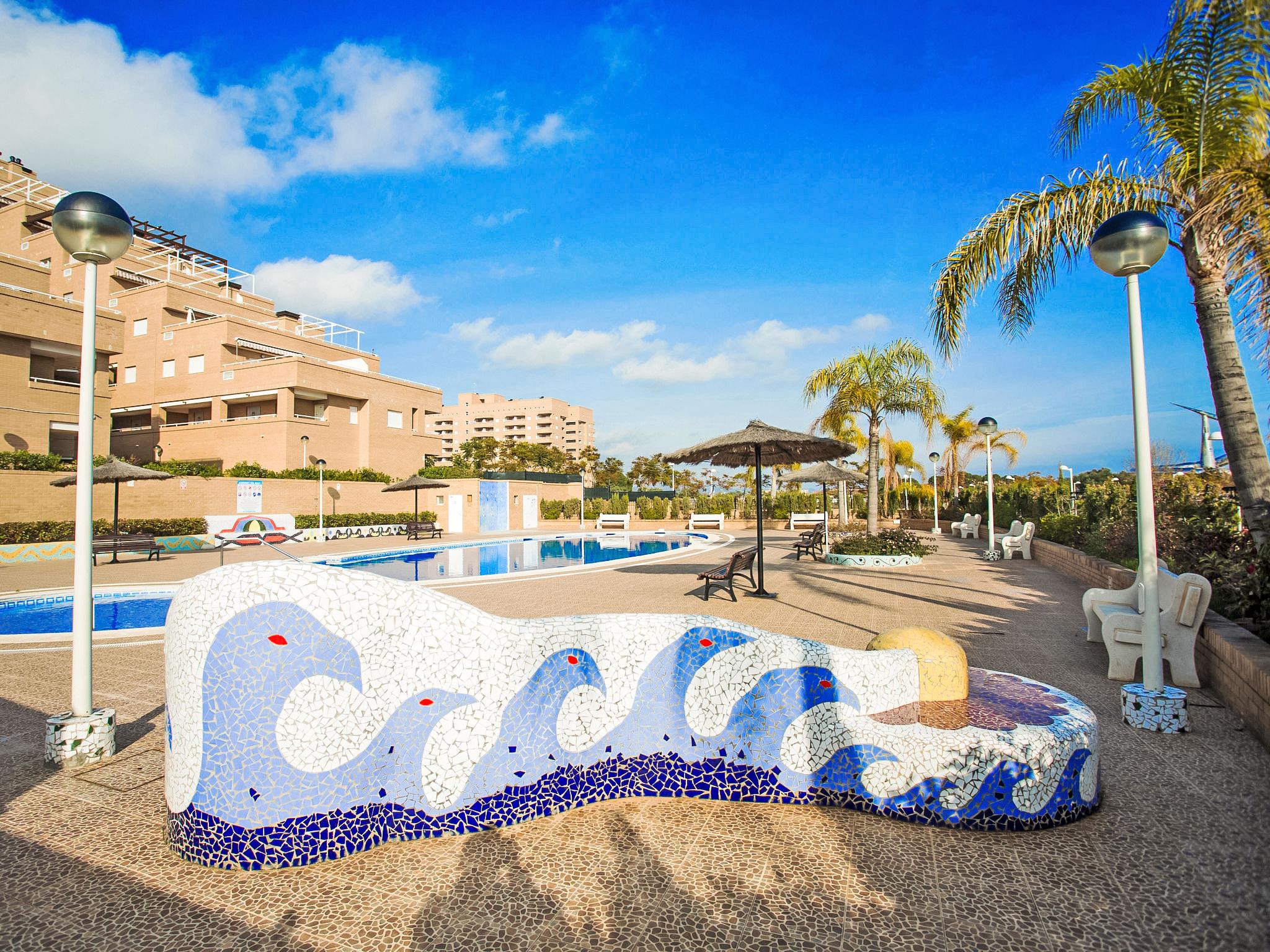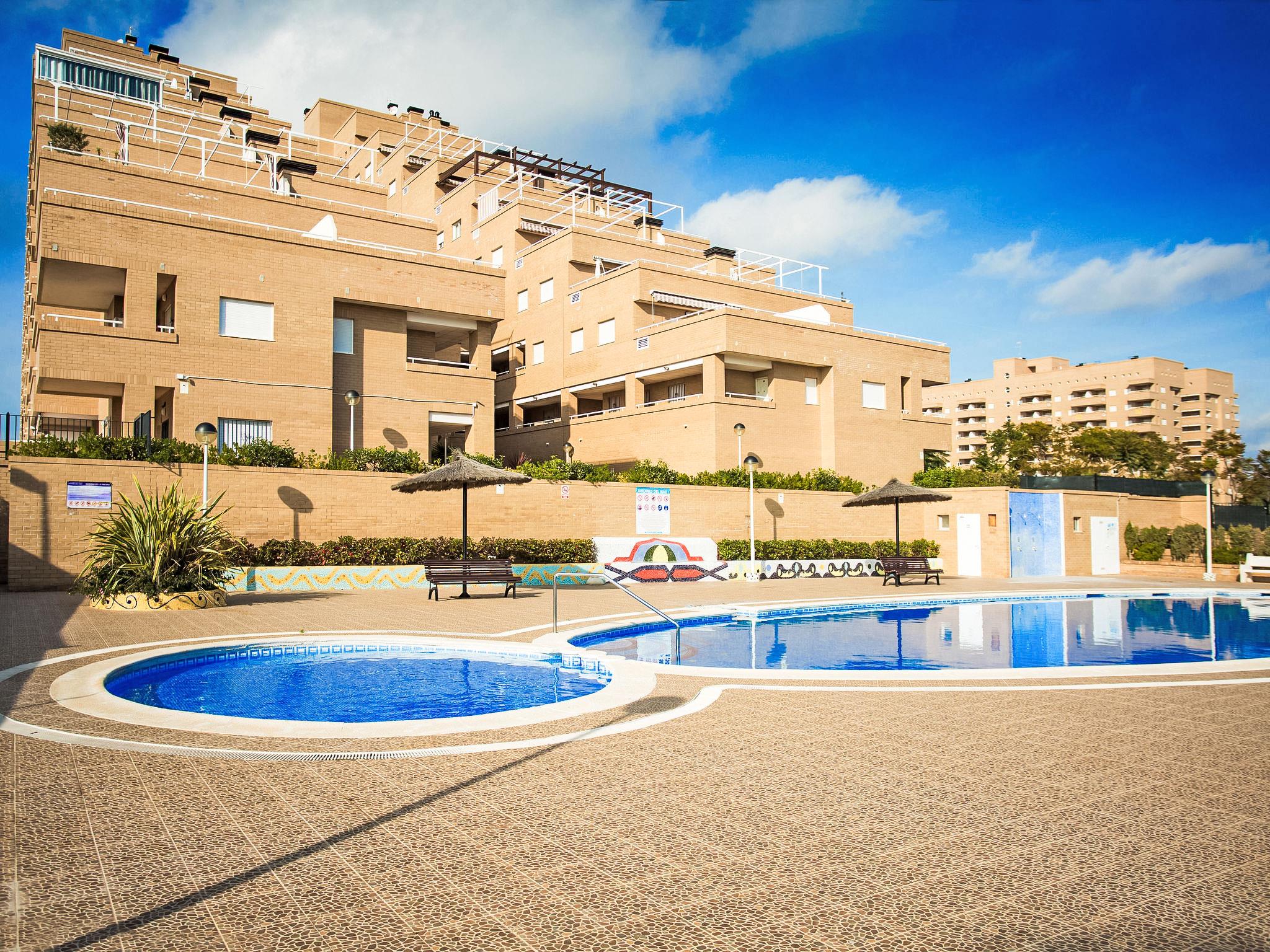 La Mar Bella: Cosy apartment block "Jardines del Mar I". On the outskirts Oropesa del Mar, in the district Marina D'Or, in a busy, sunny position, 300 m from the sea, 300 m from the beach, on a main road. For shared use: swimming pool (20 x 10 m, depth 70 - 230 cm, seasonal availability: 01.May. - 01.Oct.). In the house: lift. Roofed, parking. Supermarket 1 km, restaurant 400 m, bus stop 1.9 km, railway station 4 km, sandy beach 400 m. Please note: suitable for families, suitable for seniors. Motorway 900 m from the property. Main road 300 m from the property. Railway line 3 km from the property. Nightclub/disco 300 m from the property. Additional accommodations can be booked.