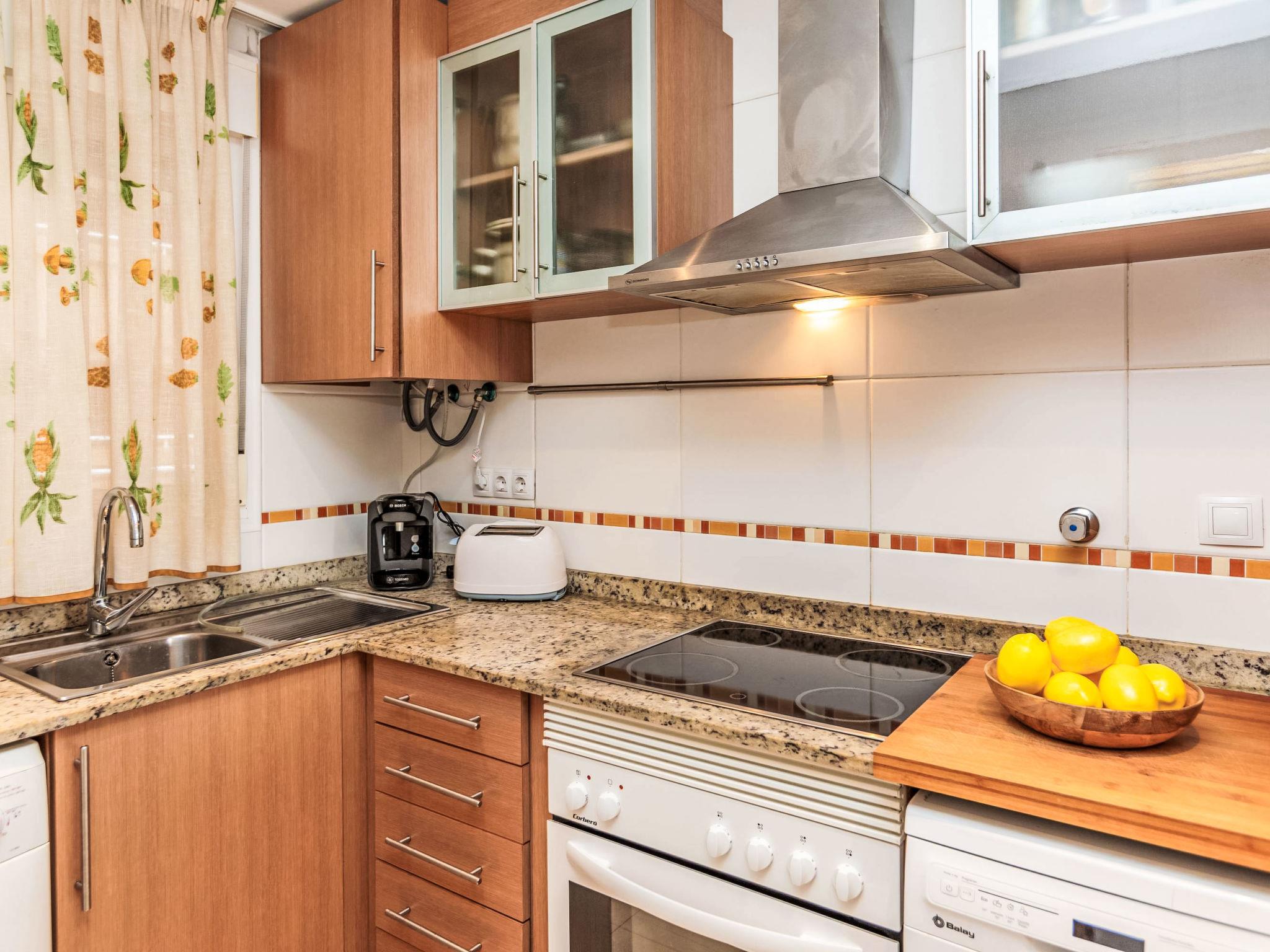 "La Mar Bella", 3-room apartment 65 m2. Bright, comfortable and cosy furnishings: living/dining room with 1 double sofabed, digital TV, flat screen, radio, hi-fi system and air conditioning. Exit to the terrace. 1 room with 1 double bed, electric heating and fan. 1 room with 2 beds and fan. Kitchen (dishwasher, 4 ceramic glass hob hotplates, toaster, kettle, microwave, freezer, grill, electric coffee machine). Bath/shower/bidet/WC, hydro massage shower. Electric heating. Heating not available in all rooms. Terrace. Terrace furniture. View of the sea, the mountains and the countryside. Facilities: washing machine, iron, baby cot for up to 2 year olds, hair dryer. Internet (WiFi, free). Parking space n 143. Suitable for families. 1 small pet/ dog allowed. AT-36789-CS