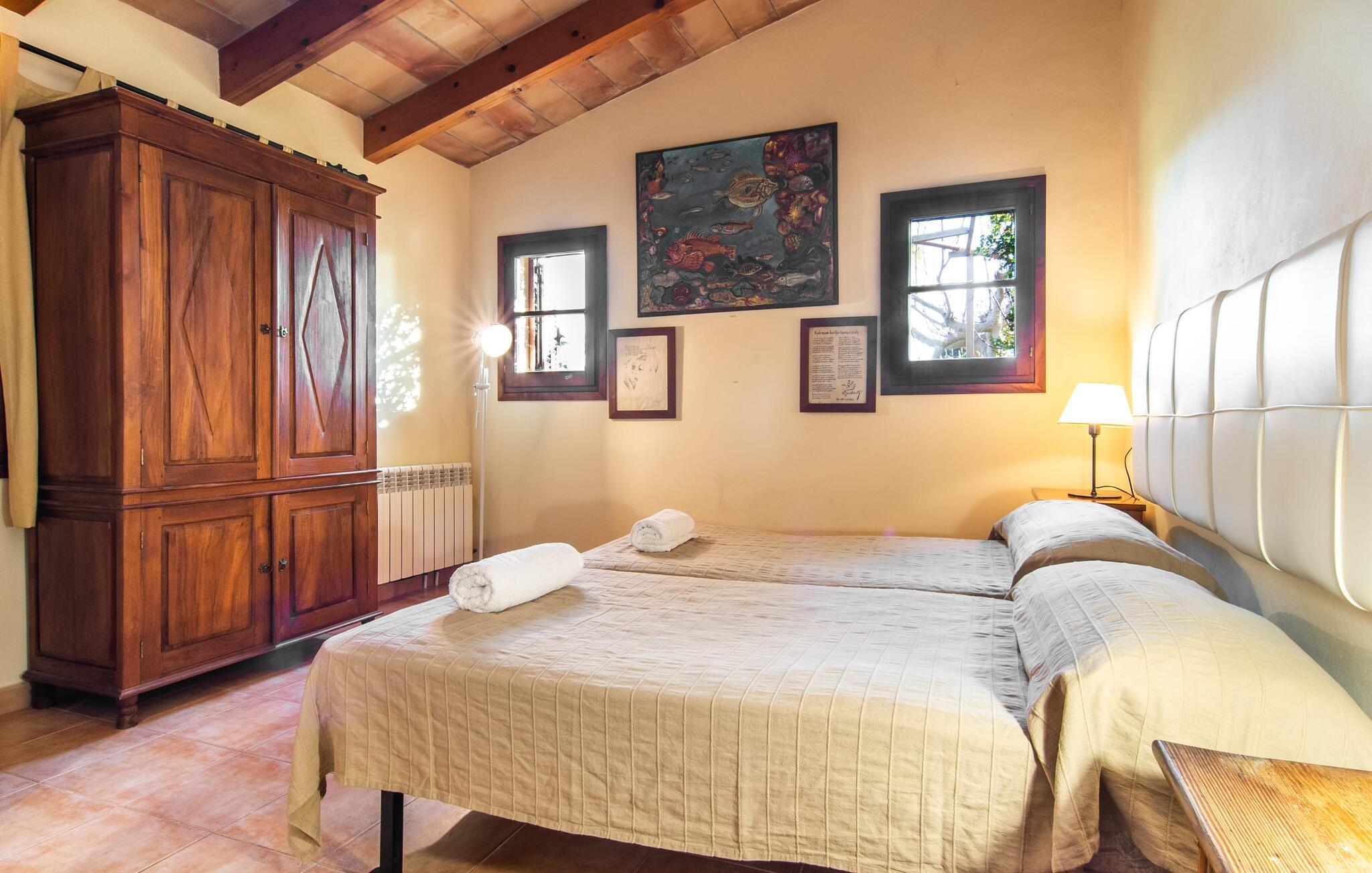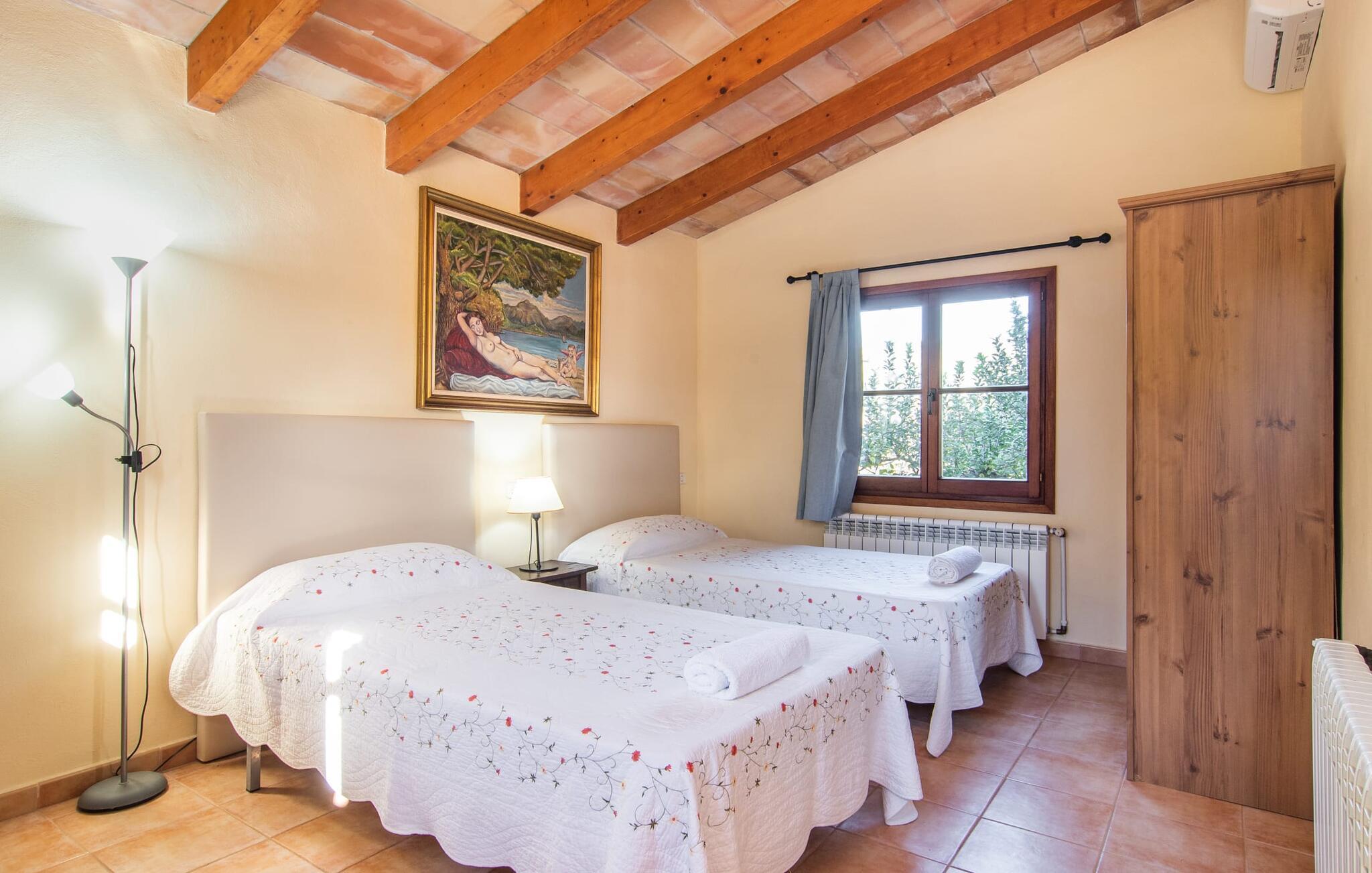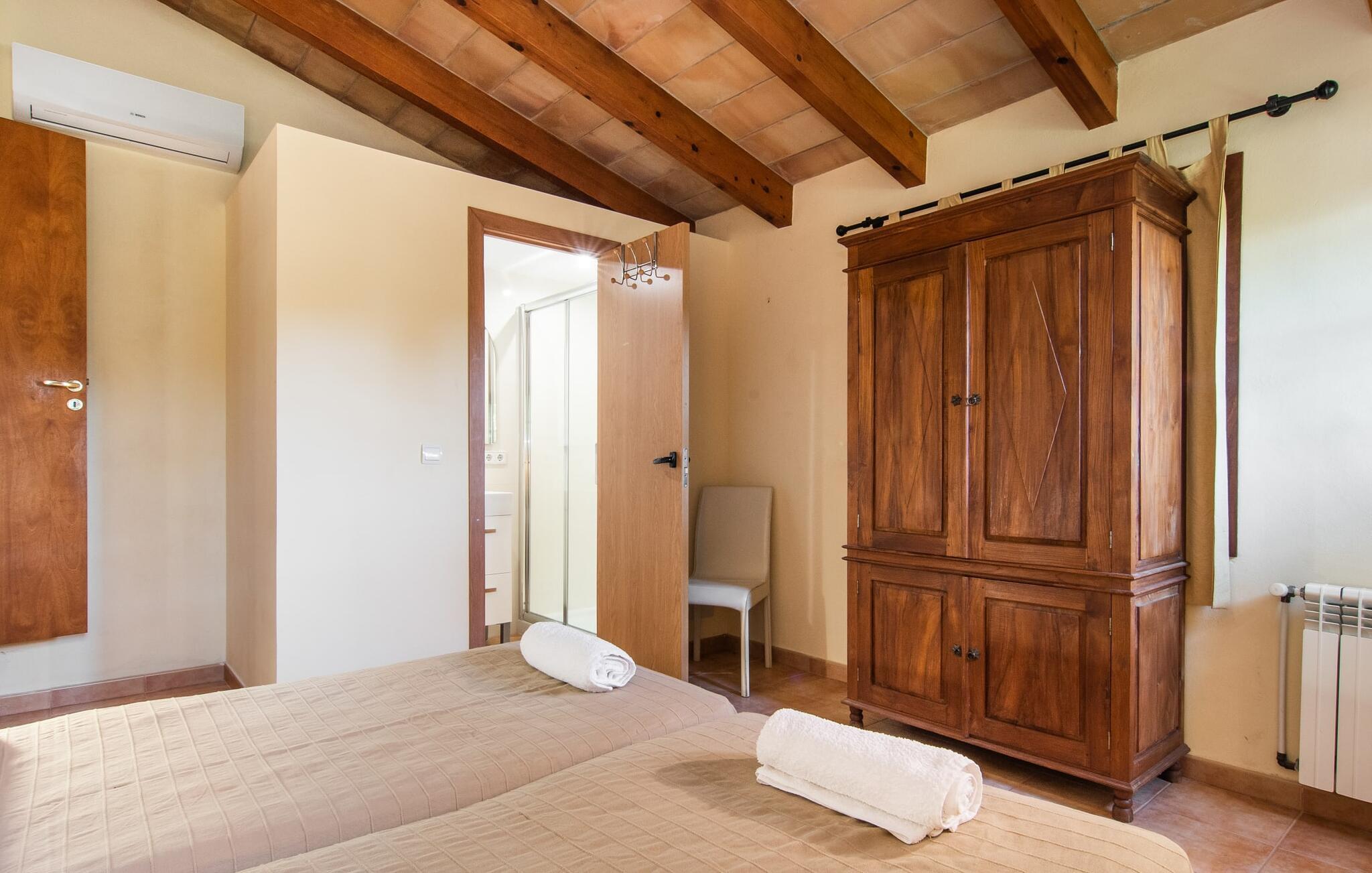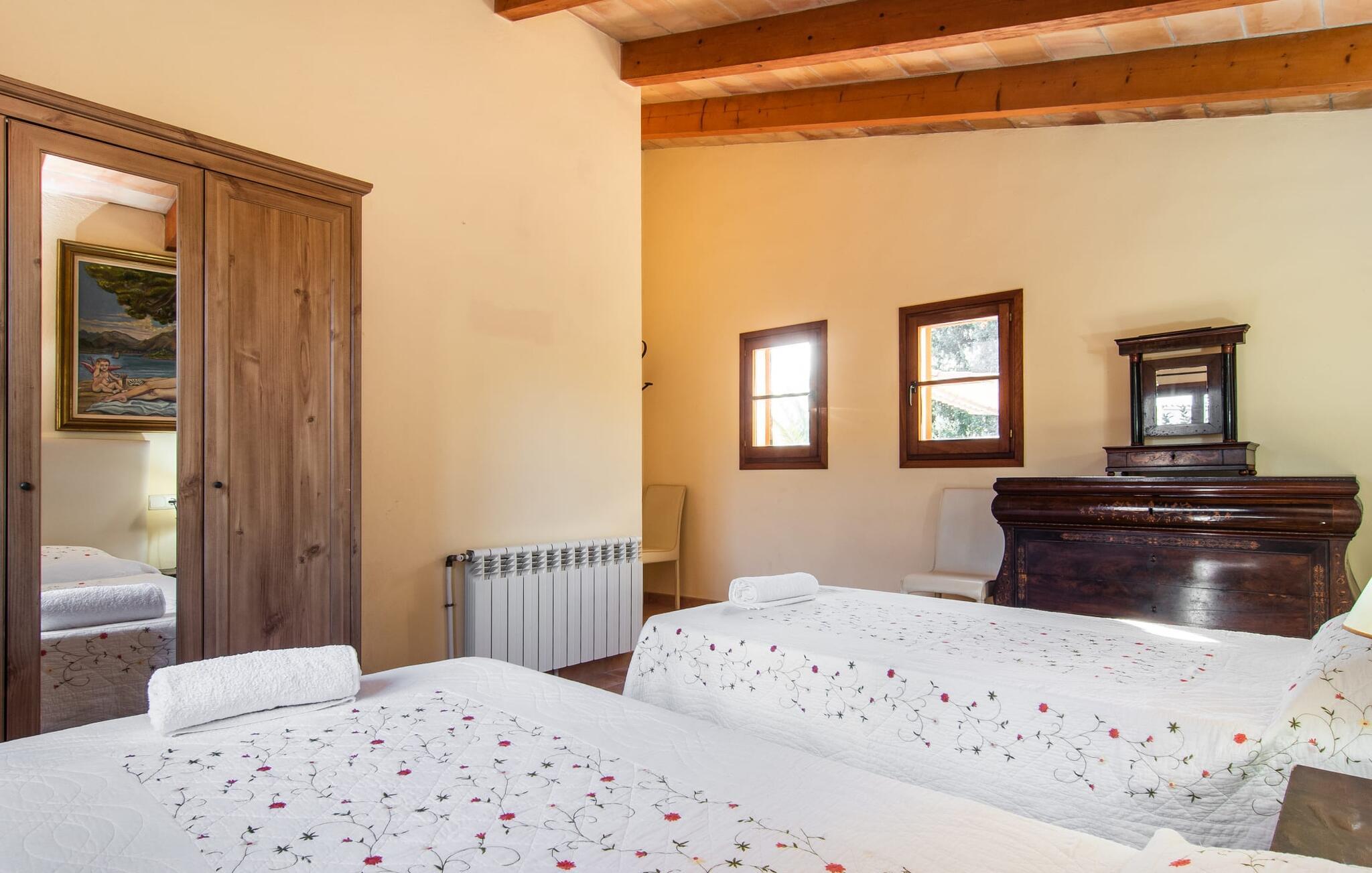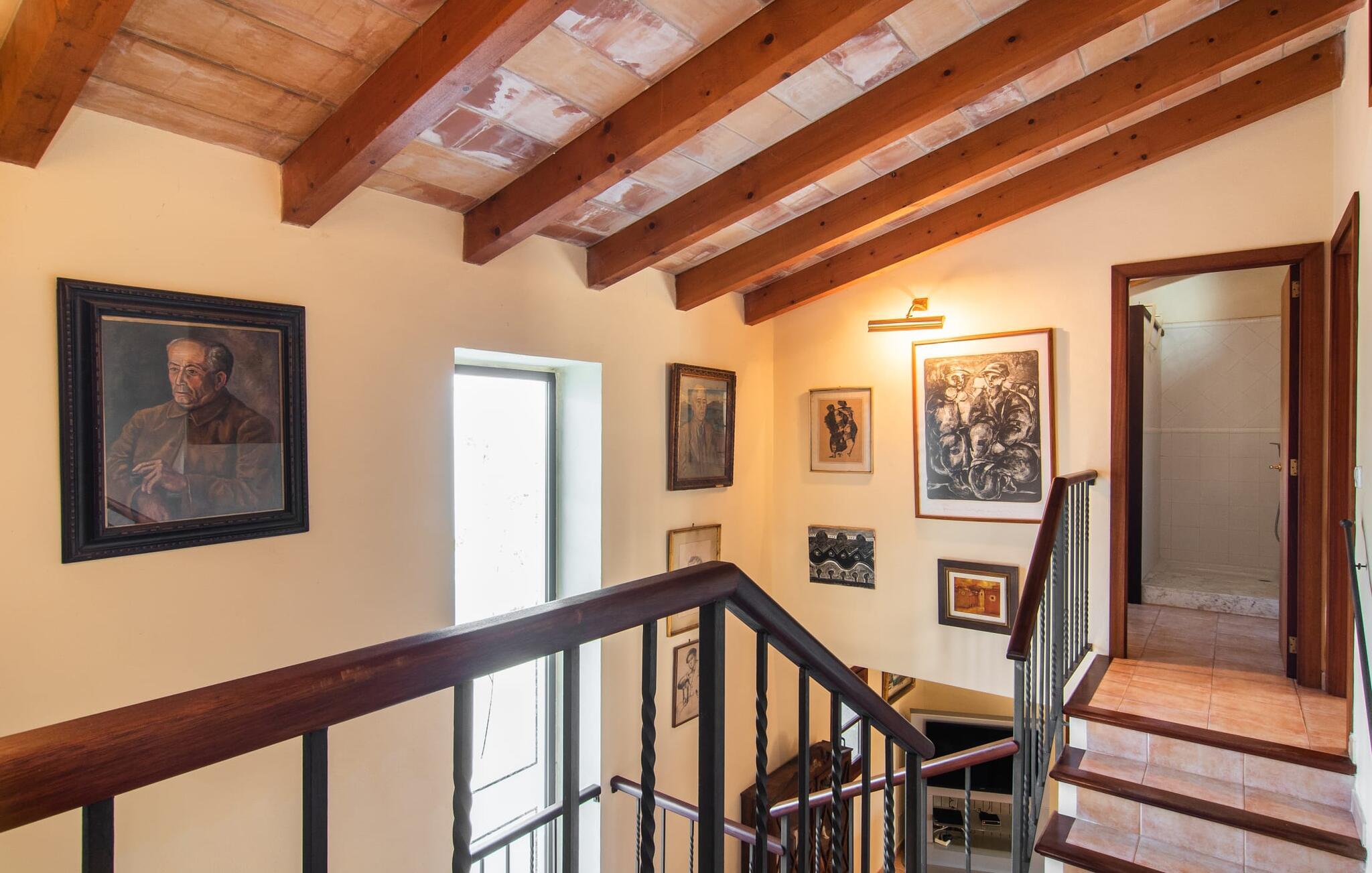 Dette smukke, veludstyrede landsted på Mallorca er ideelt for familier, der søger fred og ro og ønsker at være tæt på havet. I bor her i et varieret landskab og nyder en moden ejendom med middelhavsvegetation og nogle gamle træer. Plænen er et attraktivt lege- og boltreområde for børn, der rejser med jer. Poolen er naturligvis ikke kun tilgængelig til sporty omgange, men også til at plaske rundt. Om nødvendigt kan adgangen låses børnesikkert. Poolen er særlig nem at nå via trapper. Der er nok liggestole på den tilstødende terrasse til afslappende timer under middelhavshimlen. Den delvist overdækkede veranda er let forhøjet og indbyder til socialt samvær med et spisebord og en lounge. Grillen inviterer jer til at tilbringe det meste af jeres tid udenfor i den varme årstid. Det indre af huset byder på en række faciliteter. Teracotta-fliser, lette vægge, et delvist åbent rumdesign og nænsomt arrangeret tilbehør sikrer en høj komfort. Opholds- og spiseområdet flyder problemfrit ind i hinanden. Pejsen er centralt placeret mellem disse områder og giver ekstra komfort på kølige aftener. Det fuldt udstyrede køkken er ideelt til selvforplejning og tilbyder endda plads til endnu et bord. Lemmen til den anden spiseplads er særlig praktisk. I stueetagen er der også to soveværelser med dobbeltsenge og to badeværelser, hvoraf det ene er en suite. På øverste etage er der yderligere to soveværelser med dobbeltsenge og to badeværelser. Det betyder, at I kan nyde det højeste niveau af privatliv i "Osfort"-gården. Alle værelser er udstyret med aircondition, så behageligt varme nætter er garanteret selv om midsommer. Poolbordet på øverste etage giver variation. Det landlige og rolige bondehus "Osfort" ligger mellem Pollença og Port de Pollença i det attraktive nordlige Mallorca. Det er omgivet af et vidunderligt grønt, privat område. Port de Pollença med sin smukke lystbådehavn og hvide sandstrand ligger kun omkring 8 minutter væk i bil. I vil også finde flere restauranter, barer og mange fritidsaktiviteter.