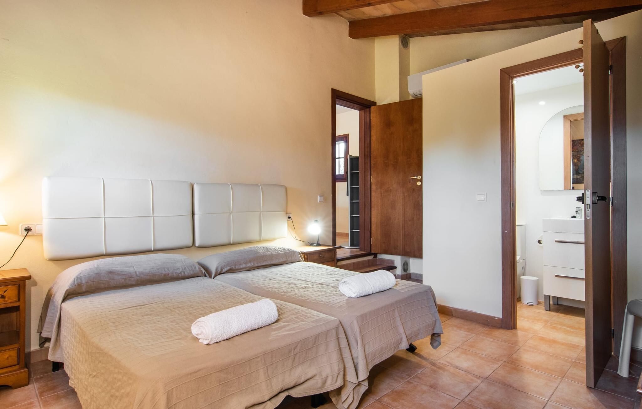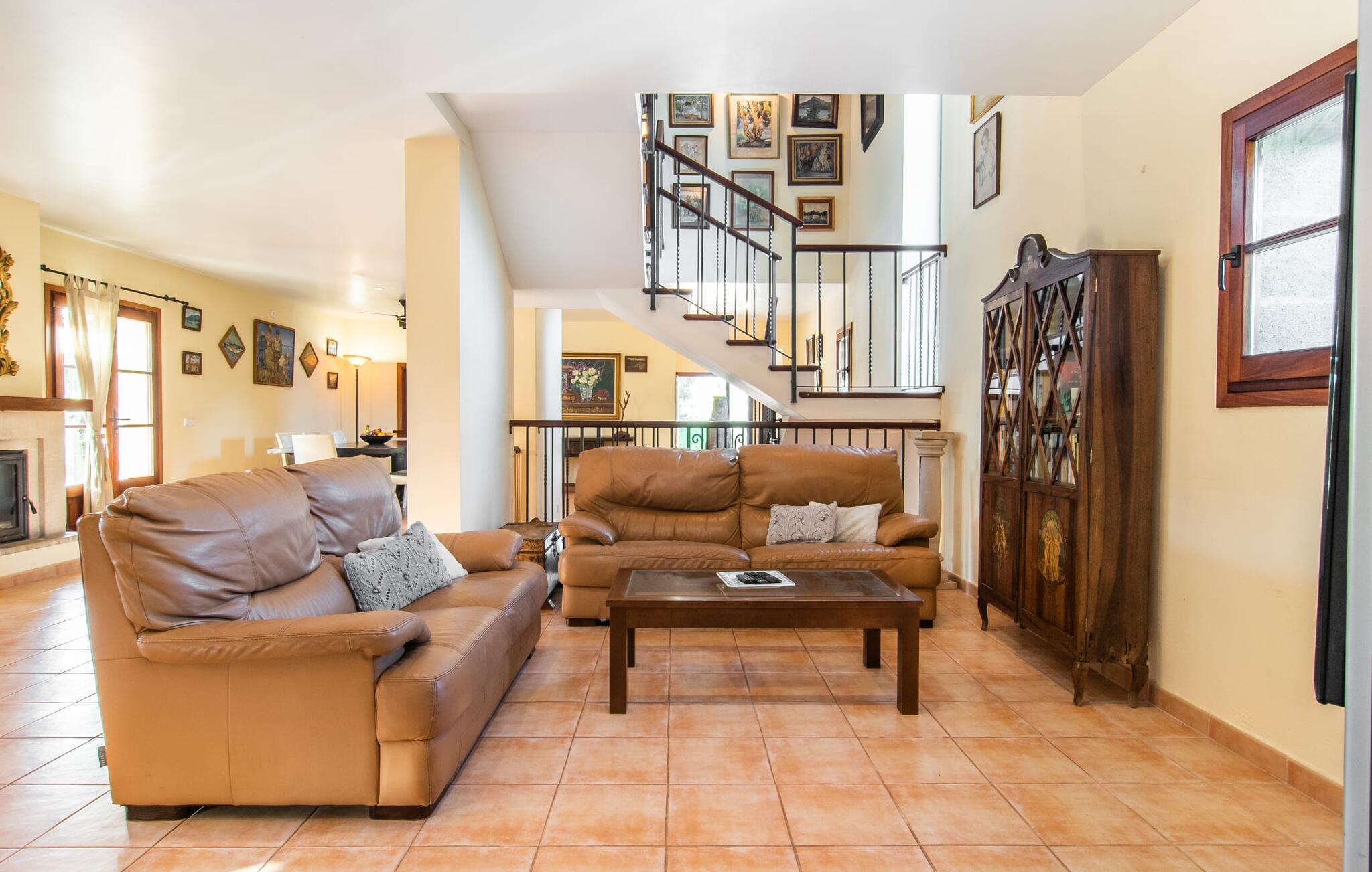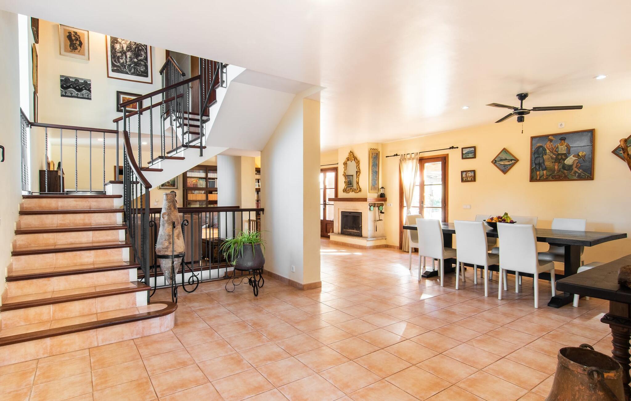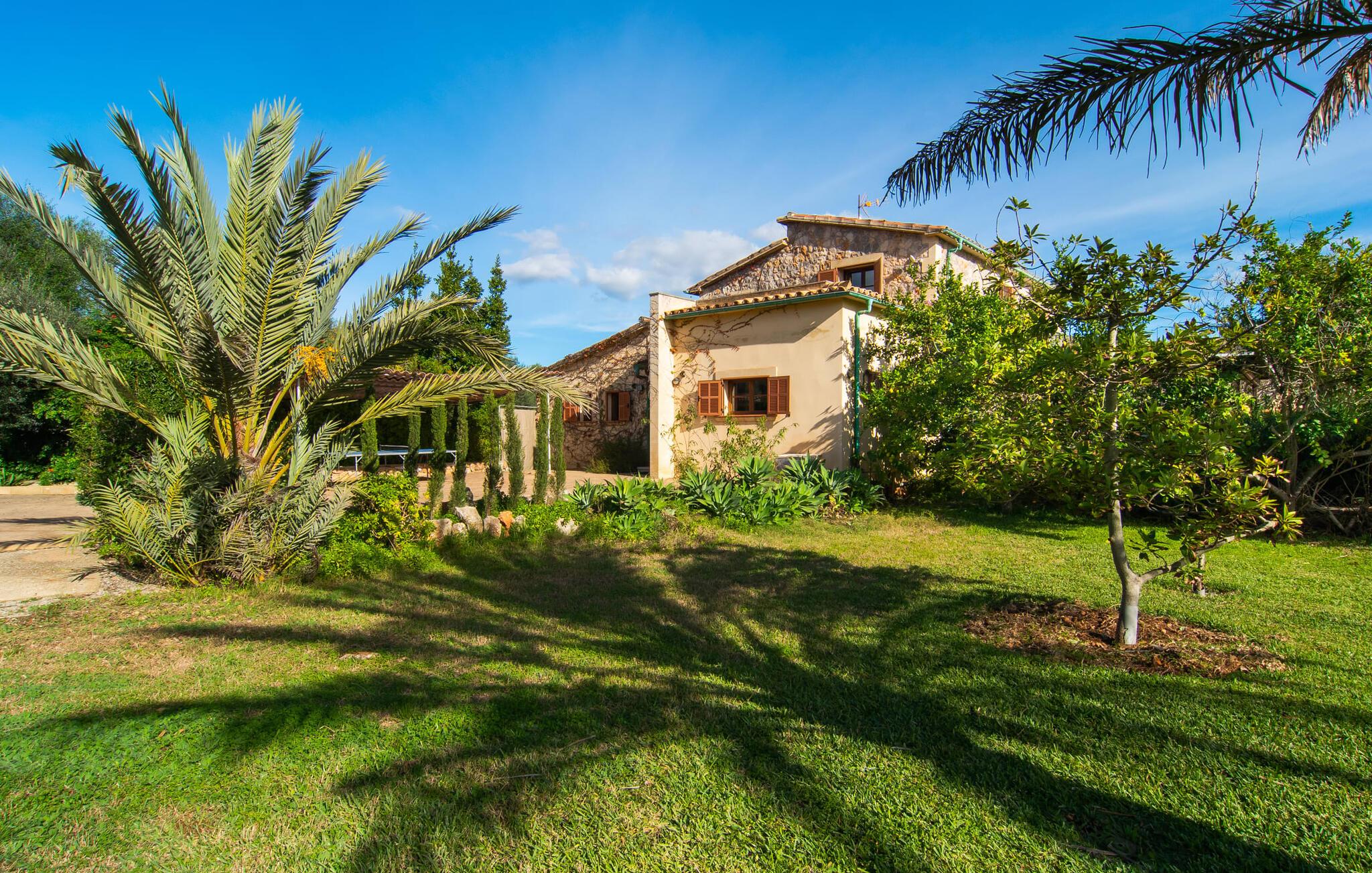 Dette smukke, veludstyrede landsted på Mallorca er ideelt for familier, der søger fred og ro og ønsker at være tæt på havet. I bor her i et varieret landskab og nyder en moden ejendom med middelhavsvegetation og nogle gamle træer. Plænen er et attraktivt lege- og boltreområde for børn, der rejser med jer. Poolen er naturligvis ikke kun tilgængelig til sporty omgange, men også til at plaske rundt. Om nødvendigt kan adgangen låses børnesikkert. Poolen er særlig nem at nå via trapper. Der er nok liggestole på den tilstødende terrasse til afslappende timer under middelhavshimlen. Den delvist overdækkede veranda er let forhøjet og indbyder til socialt samvær med et spisebord og en lounge. Grillen inviterer jer til at tilbringe det meste af jeres tid udenfor i den varme årstid. Det indre af huset byder på en række faciliteter. Teracotta-fliser, lette vægge, et delvist åbent rumdesign og nænsomt arrangeret tilbehør sikrer en høj komfort. Opholds- og spiseområdet flyder problemfrit ind i hinanden. Pejsen er centralt placeret mellem disse områder og giver ekstra komfort på kølige aftener. Det fuldt udstyrede køkken er ideelt til selvforplejning og tilbyder endda plads til endnu et bord. Lemmen til den anden spiseplads er særlig praktisk. I stueetagen er der også to soveværelser med dobbeltsenge og to badeværelser, hvoraf det ene er en suite. På øverste etage er der yderligere to soveværelser med dobbeltsenge og to badeværelser. Det betyder, at I kan nyde det højeste niveau af privatliv i "Osfort"-gården. Alle værelser er udstyret med aircondition, så behageligt varme nætter er garanteret selv om midsommer. Poolbordet på øverste etage giver variation. Det landlige og rolige bondehus "Osfort" ligger mellem Pollença og Port de Pollença i det attraktive nordlige Mallorca. Det er omgivet af et vidunderligt grønt, privat område. Port de Pollença med sin smukke lystbådehavn og hvide sandstrand ligger kun omkring 8 minutter væk i bil. I vil også finde flere restauranter, barer og mange fritidsaktiviteter.