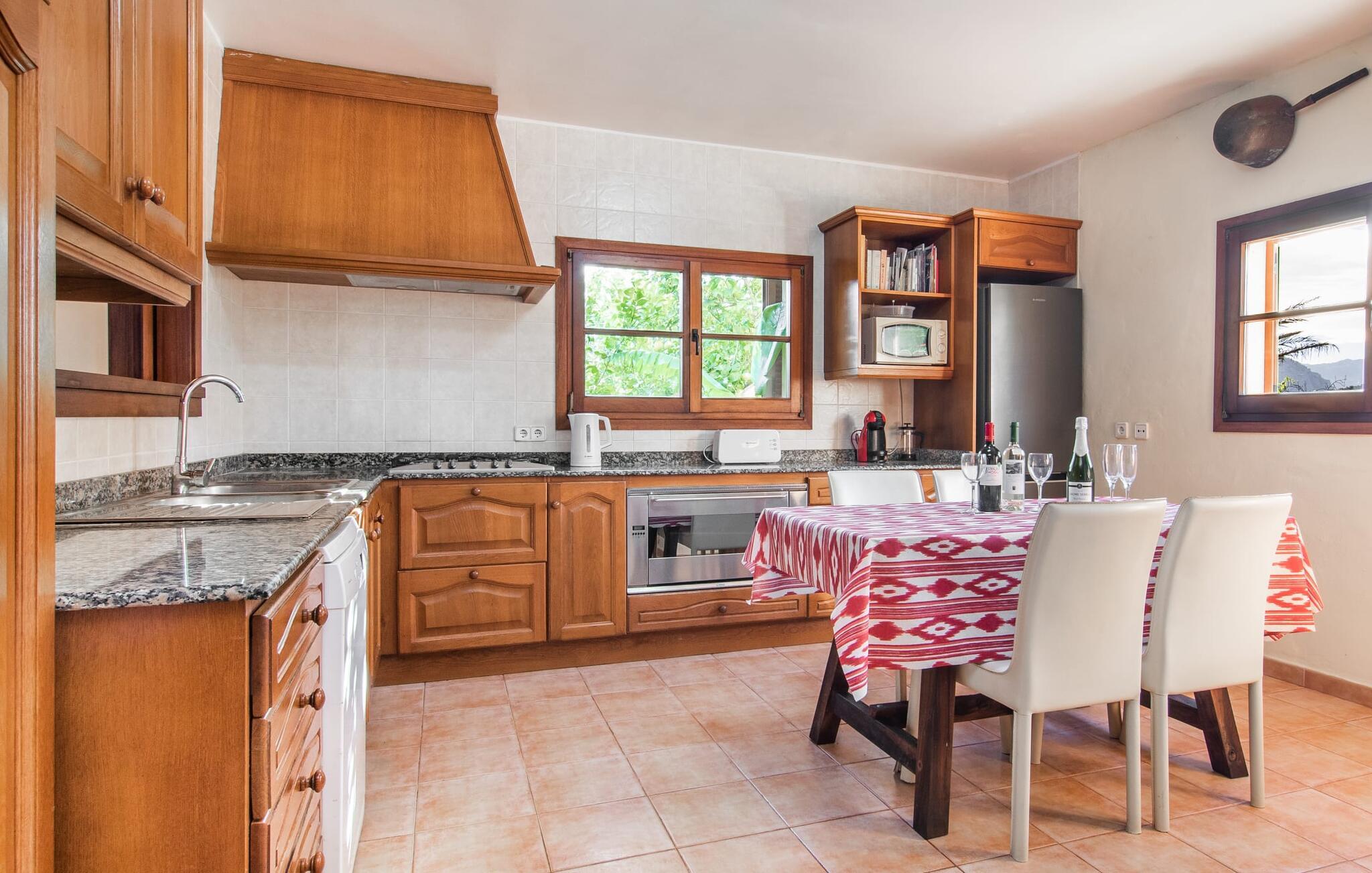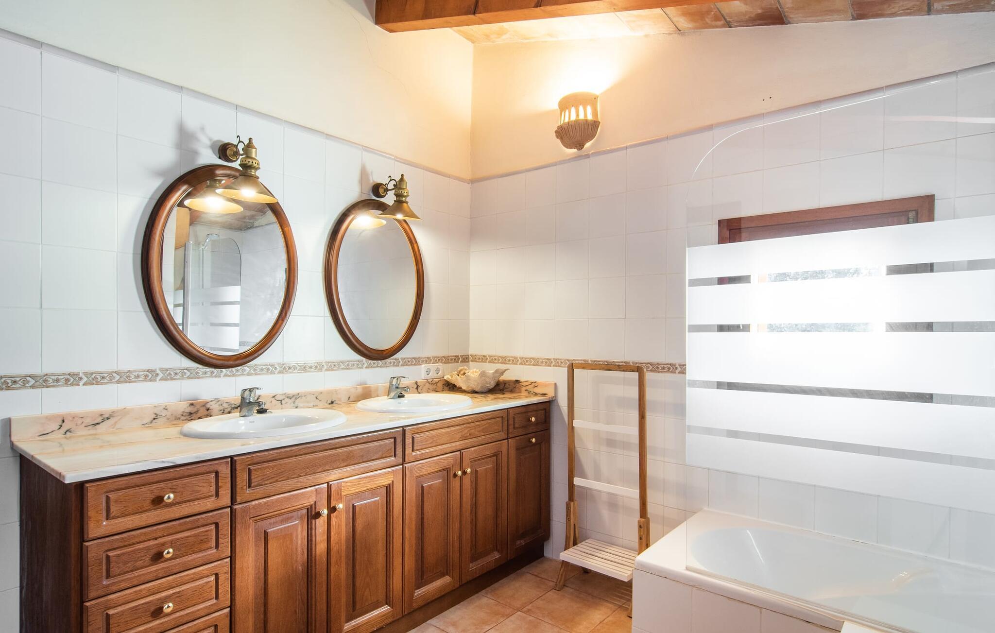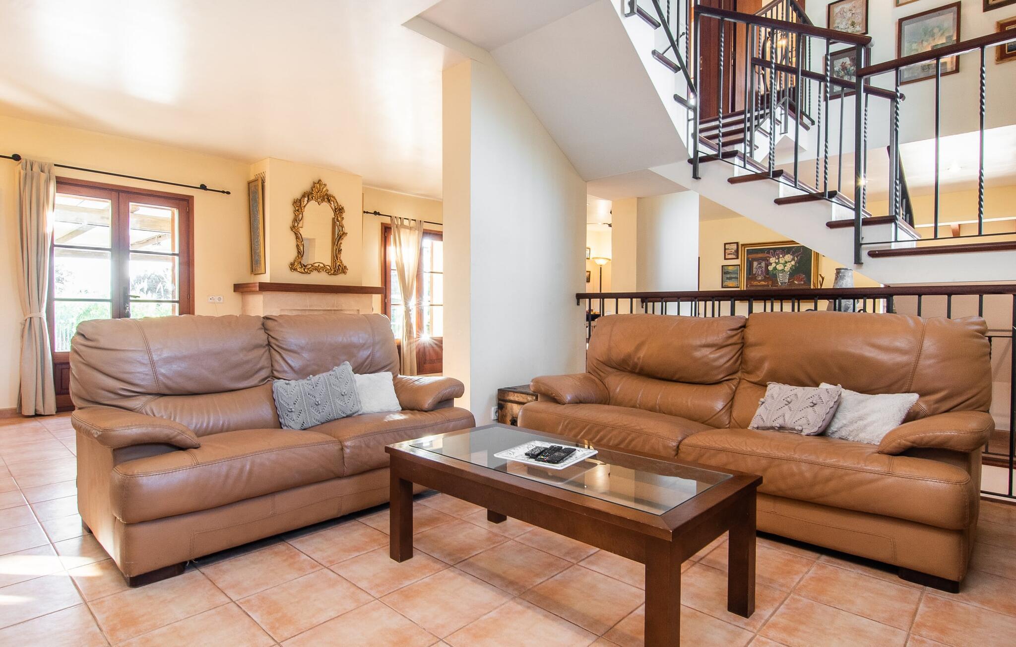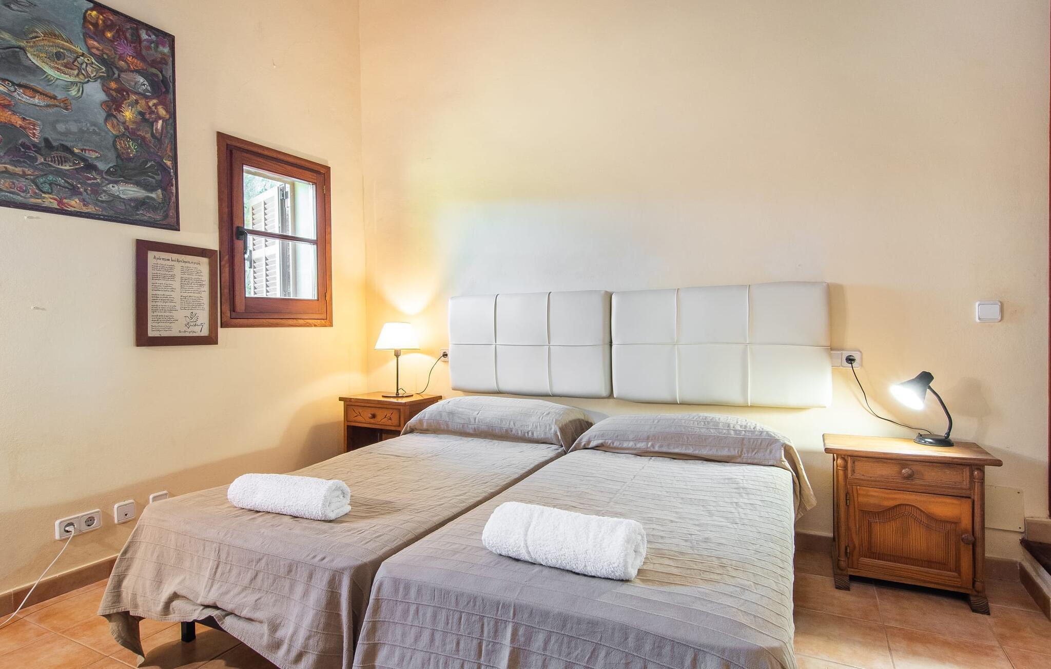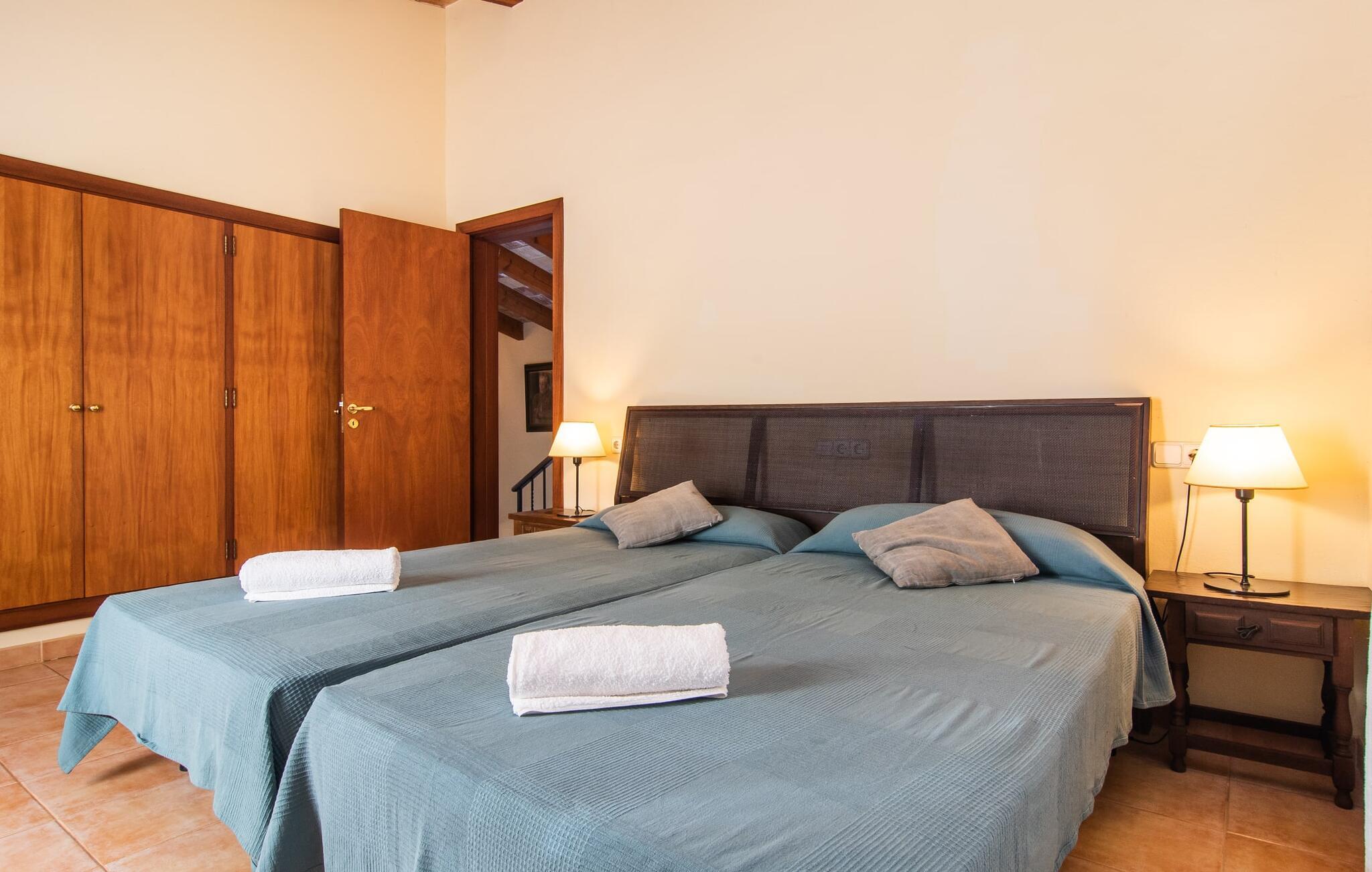Dette smukke, veludstyrede landsted på Mallorca er ideelt for familier, der søger fred og ro og ønsker at være tæt på havet. I bor her i et varieret landskab og nyder en moden ejendom med middelhavsvegetation og nogle gamle træer. Plænen er et attraktivt lege- og boltreområde for børn, der rejser med jer. Poolen er naturligvis ikke kun tilgængelig til sporty omgange, men også til at plaske rundt. Om nødvendigt kan adgangen låses børnesikkert. Poolen er særlig nem at nå via trapper. Der er nok liggestole på den tilstødende terrasse til afslappende timer under middelhavshimlen. Den delvist overdækkede veranda er let forhøjet og indbyder til socialt samvær med et spisebord og en lounge. Grillen inviterer jer til at tilbringe det meste af jeres tid udenfor i den varme årstid. Det indre af huset byder på en række faciliteter. Teracotta-fliser, lette vægge, et delvist åbent rumdesign og nænsomt arrangeret tilbehør sikrer en høj komfort. Opholds- og spiseområdet flyder problemfrit ind i hinanden. Pejsen er centralt placeret mellem disse områder og giver ekstra komfort på kølige aftener. Det fuldt udstyrede køkken er ideelt til selvforplejning og tilbyder endda plads til endnu et bord. Lemmen til den anden spiseplads er særlig praktisk. I stueetagen er der også to soveværelser med dobbeltsenge og to badeværelser, hvoraf det ene er en suite. På øverste etage er der yderligere to soveværelser med dobbeltsenge og to badeværelser. Det betyder, at I kan nyde det højeste niveau af privatliv i "Osfort"-gården. Alle værelser er udstyret med aircondition, så behageligt varme nætter er garanteret selv om midsommer. Poolbordet på øverste etage giver variation. Det landlige og rolige bondehus "Osfort" ligger mellem Pollença og Port de Pollença i det attraktive nordlige Mallorca. Det er omgivet af et vidunderligt grønt, privat område. Port de Pollença med sin smukke lystbådehavn og hvide sandstrand ligger kun omkring 8 minutter væk i bil. I vil også finde flere restauranter, barer og mange fritidsaktiviteter.