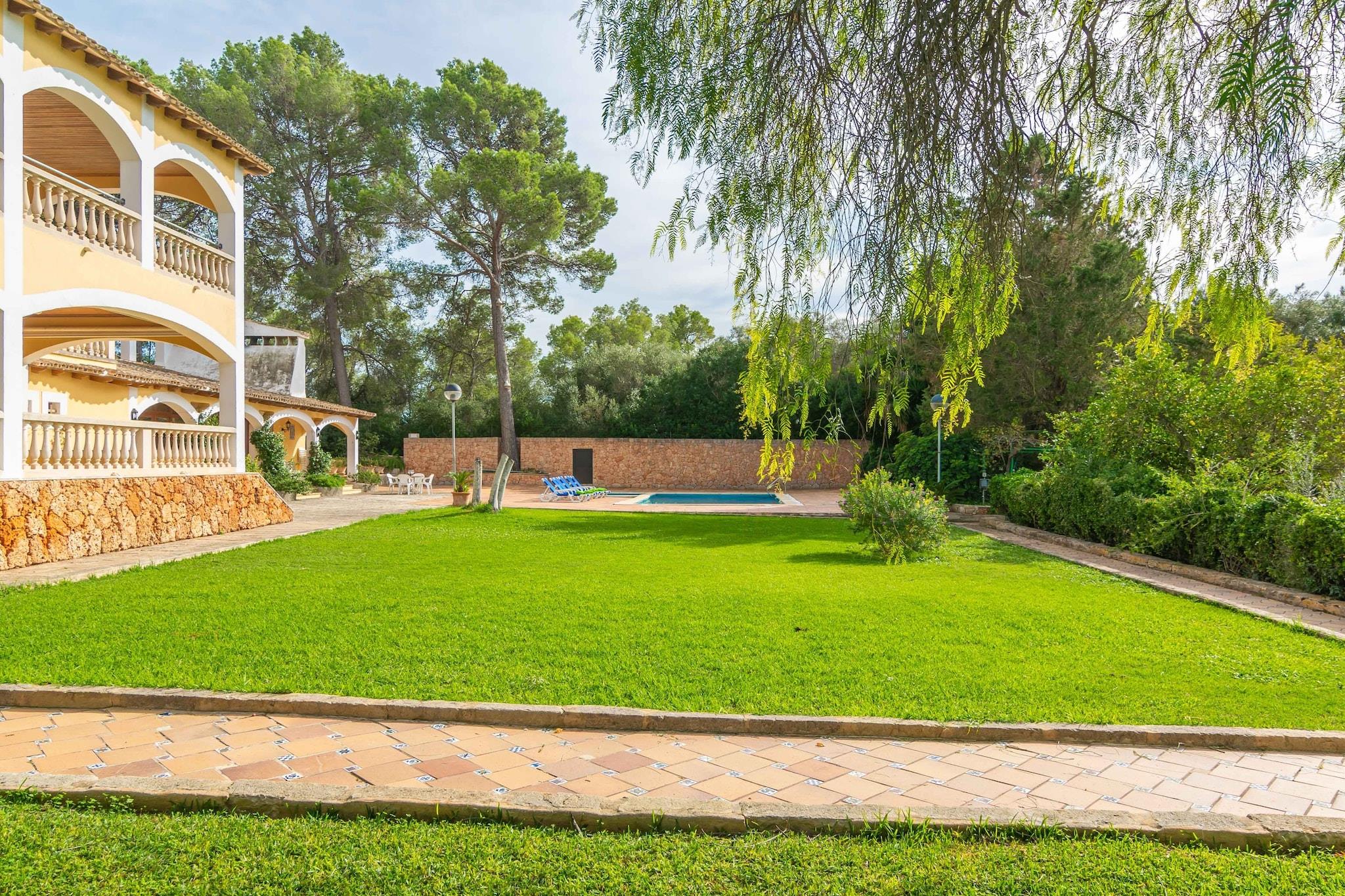 Denne imponerende herregård tilbyder et varmt, indbydende miljø for op til 12 gæster fordelt på seks soveværelser, hver udstyret med aircondition og rigelig opbevaring. De ekspansive opholdsrum inkluderer en stor stue-spisestue med pejs, tv og adgang til en af ??verandaerne, plus et andet opholdsområde med billard. De to fuldt udstyrede køkkener gør madlavning let, mens flere badeværelser - inklusive tre en-suiter - sikrer komfort og privatliv. Børnesenge og høje stole er tilgængelige efter anmodning, og central olievarme holder hjemmet hyggeligt året rundt. Træd udenfor for at opdage en privat klor-swimmingpool med en dedikeret børneafdeling, omgivet af ni liggestole og store græsklædte områder perfekt til leg eller solbadning. Flere terrasser og verandaer, en grill og havemøbler inviterer til udendørs spisning. Sportsentusiaster kan nyde paddle-tennisbanen, basketballbanen og bordtennis, som alle er tilgængelige på ejendommen. En rolig sø og frodige haver skaber fredfyldte rammer for afslapning og sjov for alle aldre. ' Villaen er beliggende kun 5,9 km fra Sant Jordi og tæt på Son Gual golfbanen og har gode forbindelser via Palma-Manacor motorvejen. Lokale faciliteter, herunder restauranter, barer og supermarkeder, er inden for rækkevidde, mens Palma by – med sin ikoniske katedral La Seu og charmerende gamle bydel – er perfekt til dagsture. Strandene i Cala Blava, Can Pastilla og Es Trenc er kun en kort køretur væk.