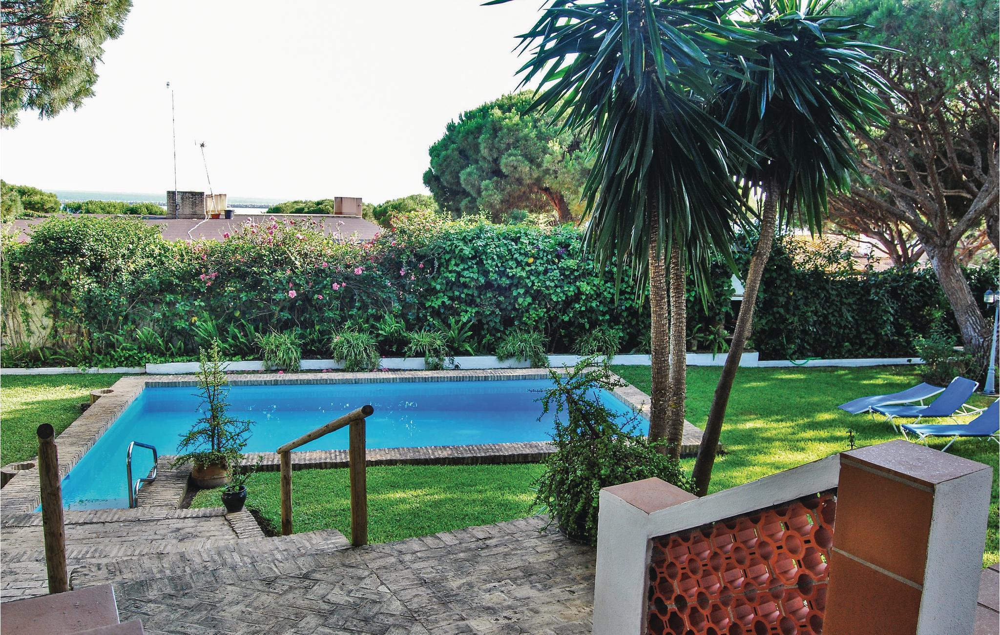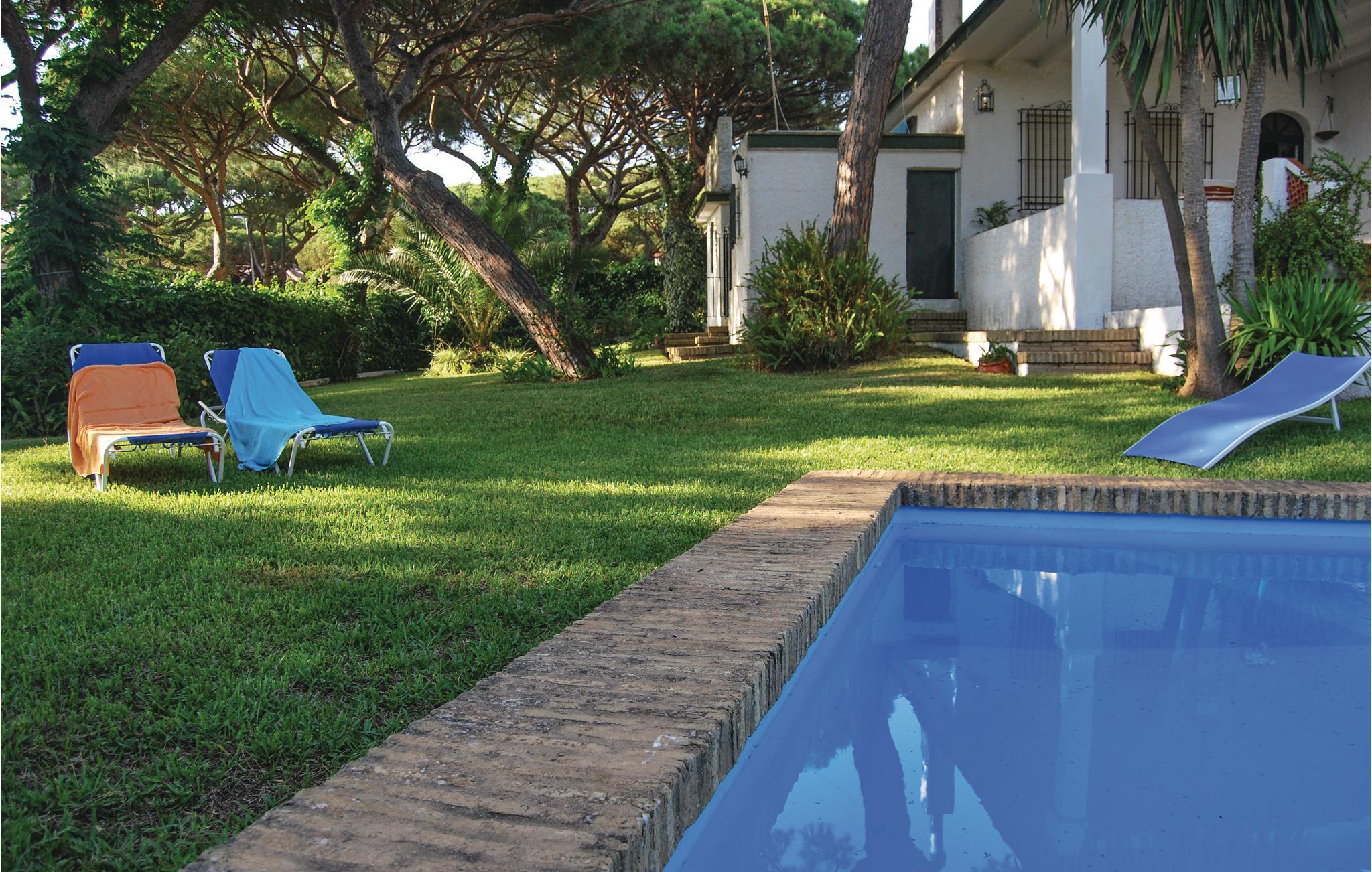 Tilbring ferien i dette feriechalet beregnet til syv personer med pool. Grunden er på hele 1.200 m² og ligger på stranden Ciparsa i Mazagón. Det kønne hus er perfekt til familier, og har fire soveværelser, to badeværelser, og et wc med brucer beregnet til poolområdet. Indvendigt er huset dejligt svalt, hvilket er en stor fordel på de varme sommerdag. Indretningen er rustik og sammen med det kønne hus er det med til at skabe en dejlig atmosfære. Soveværelserne har udsigt til den velholdte have og fordi de er afskærmet fra opholdsrummene kan børnene sagtens sove mens de voksne hygger sig i stuen med kamin. Fra det veludstyrede køkken er der adgang til haven med de smukke pinjer og i opholdsstuen er der en kamin. Fra den overdækkede terrasse er der adgang til poolen som er omgivet af plæne. Hert er der liggestole og enhavesofa hvorfra I kan holde øje med børnene mens de leger på grunden. Mazagon er en lille populær fiskerby. Kun 150 m fra jeres hus kan I fiske, sejle eller besøge nogle af de fantastiske spisesteder som ligger på egnen. Brænde til kaminen sørger husets ejer for.