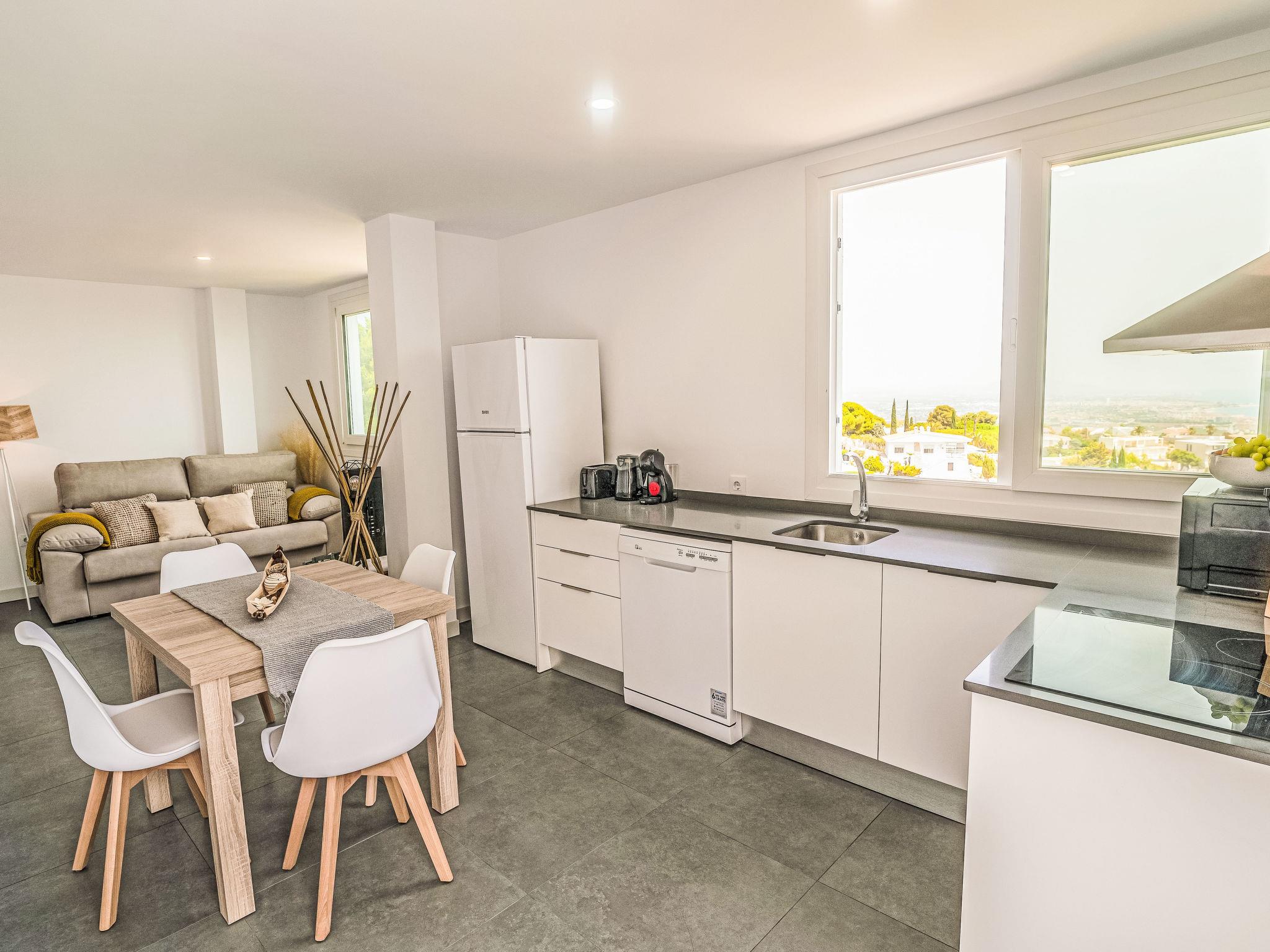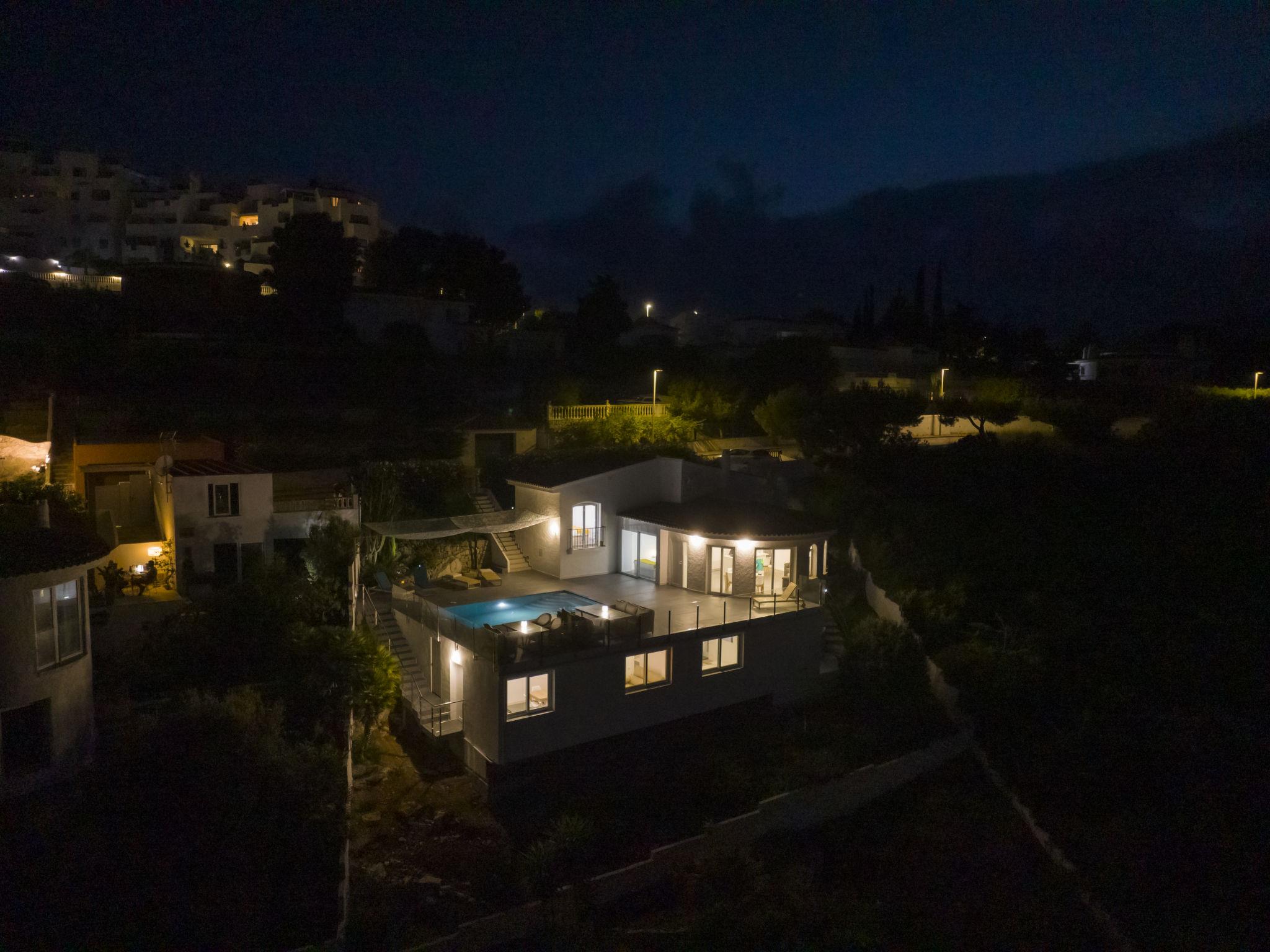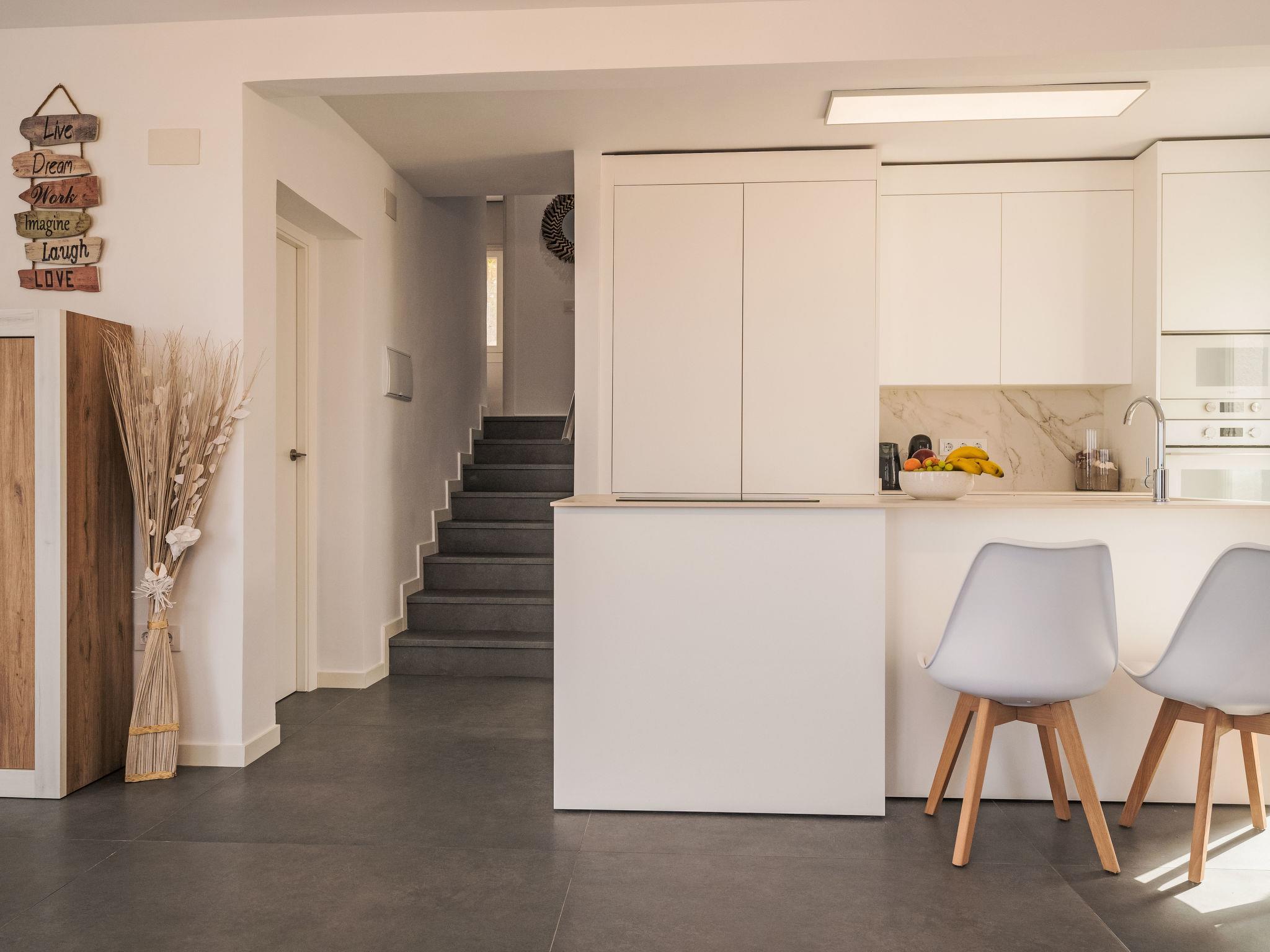 "Calam de Luna", 7-room villa 236 m2 on 3 levels. Object suitable for 8 adults + 4 children. Fully renovated in 2024, comfortable and modern furnishings: living/dining room with dining table, digital TV, air conditioning and forced-air heating. Exit to the terrace, to the swimming pool. 1 room with 1 french bed (150 cm, length 190 cm), air conditioning and forced-air heating. Exit to the terrace, to the swimming pool. Large, open kitchen (oven, dishwasher, 3 ceramic glass hob hotplates, toaster, kettle, microwave, freezer, electric coffee machine, Capsules for coffee machine (Dolce Gusto) extra) with air conditioning, forced-air heating and boiler (70 litres). Exit to the terrace, to the swimming pool. Shower/bidet/WC. On the lower ground floor: 1 room with 1 french bed (135 cm, length 190 cm), digital TV, air conditioning and forced-air heating. 1 room with 1 french bed (150 cm, length 190 cm), air conditioning and forced-air heating. Open kitchen (oven, dishwasher, 3 ceramic glass hob hotplates, toaster, microwave, electric coffee machine, Capsules for coffee machine (Dolce Gusto)) with boiler (45 litres). Shower/WC. Upper floor: 1 room with 1 french bed (150 cm, length 190 cm). 2 rooms, each room with 2 beds (90 cm, length 190 cm), digital TV, air conditioning and forced-air heating. 2 showers/WC. Large terrace 150 m2. Terrace furniture, barbecue, deck chairs (5). Panoramic view of the sea, the mountains and the town. Facilities: washing machine, iron, children's high chair, baby cot for up to 2 year olds, hair dryer. Internet (WiFi, free). Parking (2 cars). Please note: non-smoking house. Maximum 1 pet/ dog allowed. TV only ES. No lift. VT-47889-CS // Reg. Nr.: ESFCNT00001200900077446600000000000000000000000000005