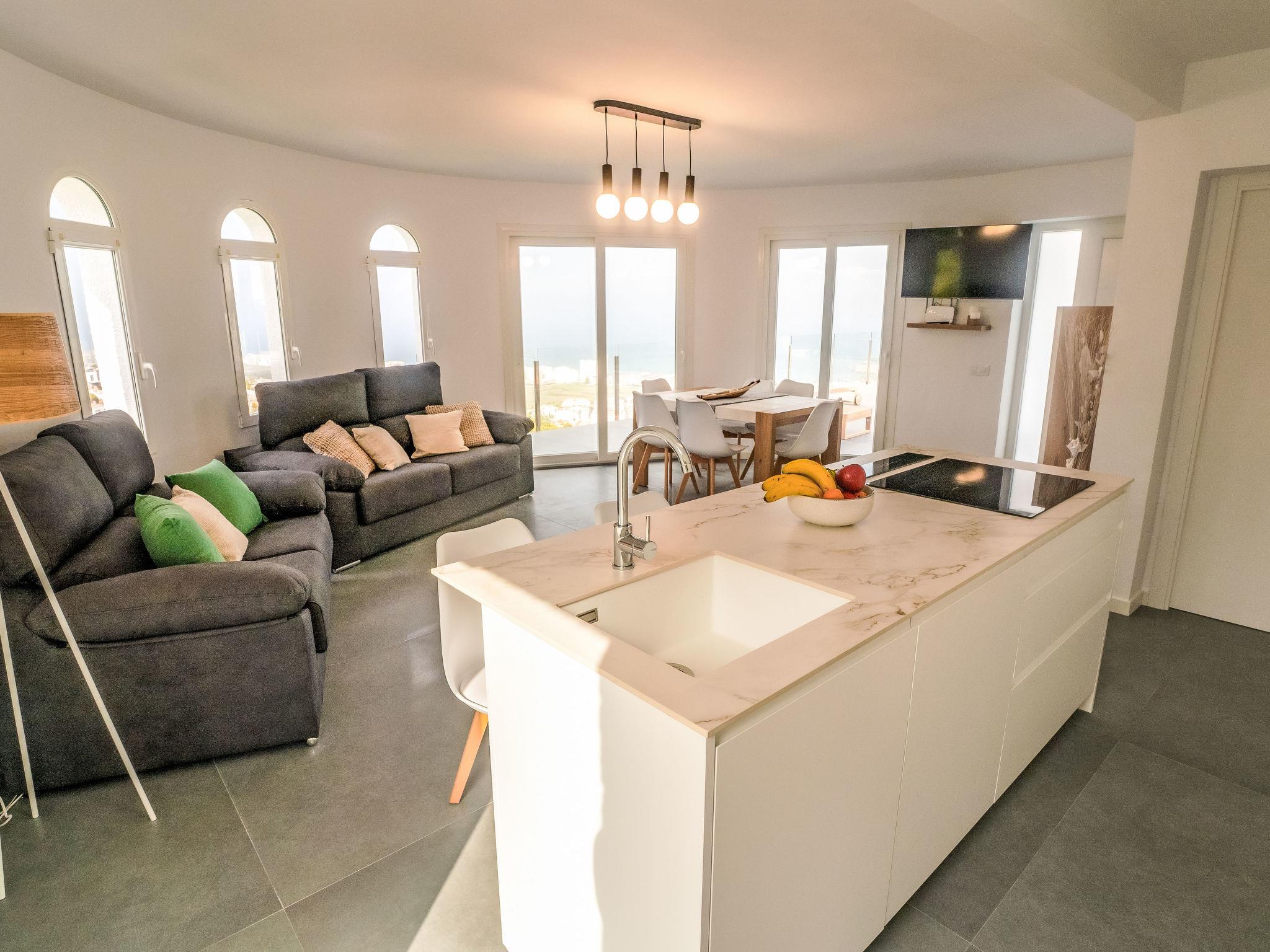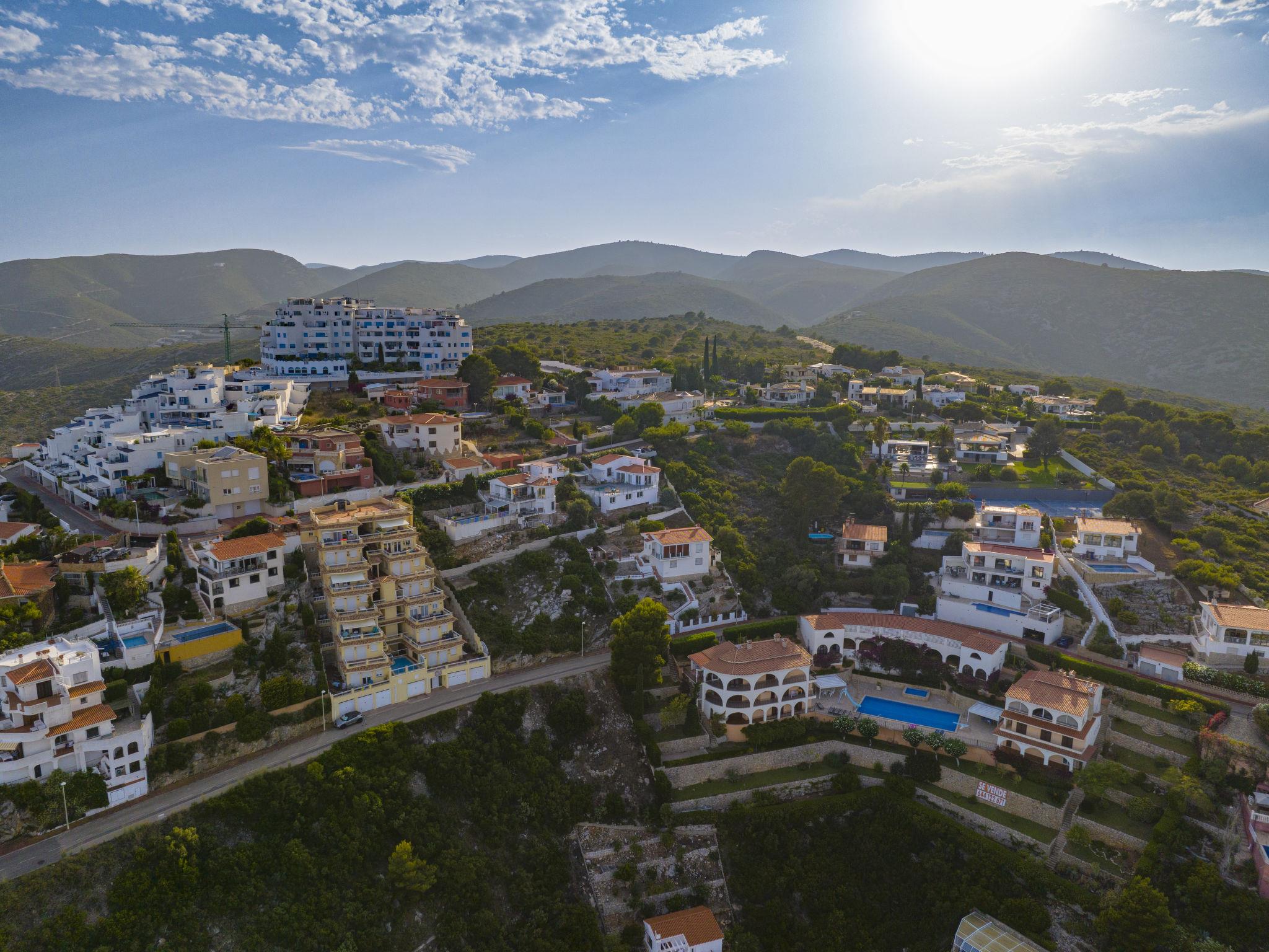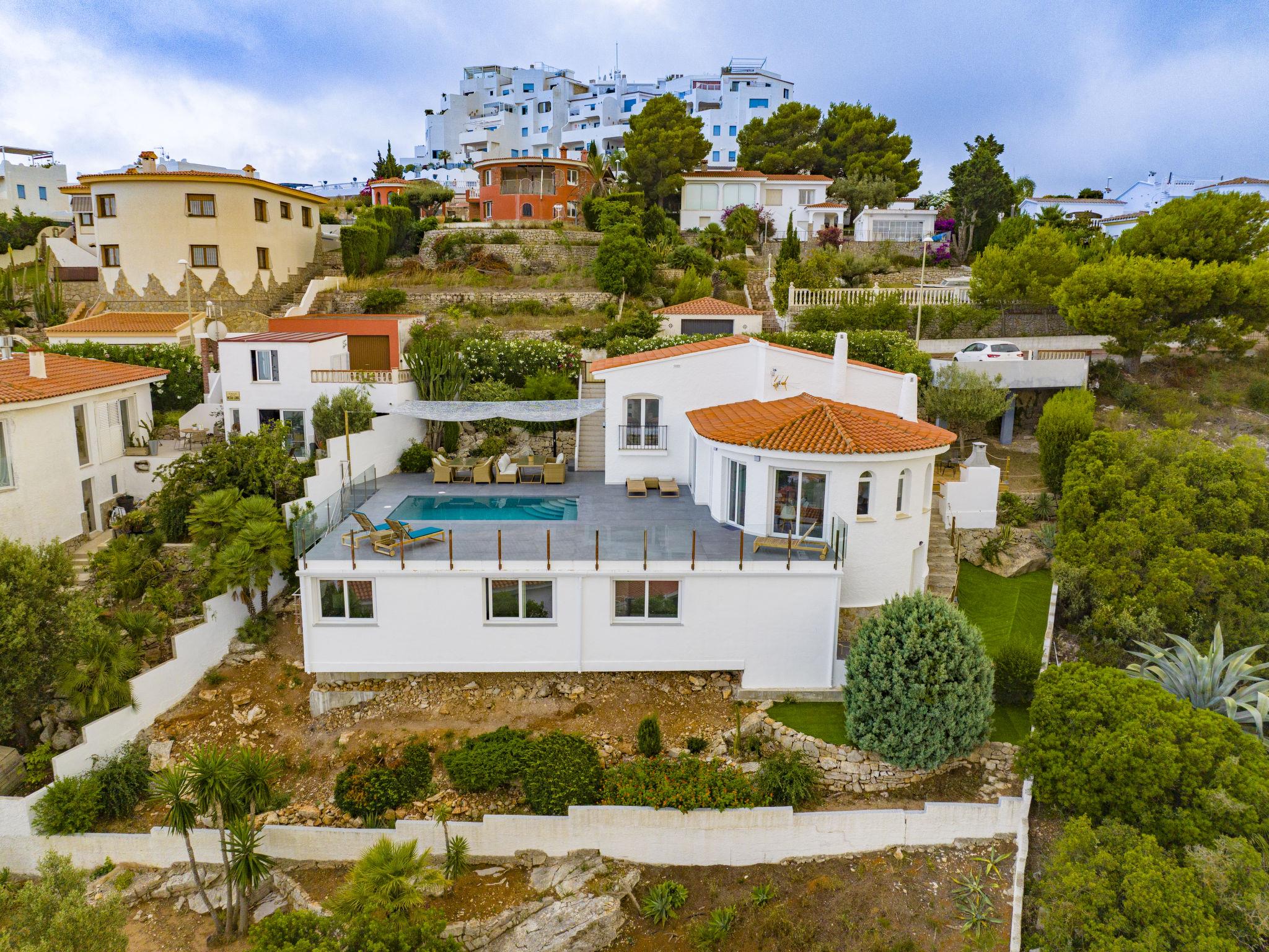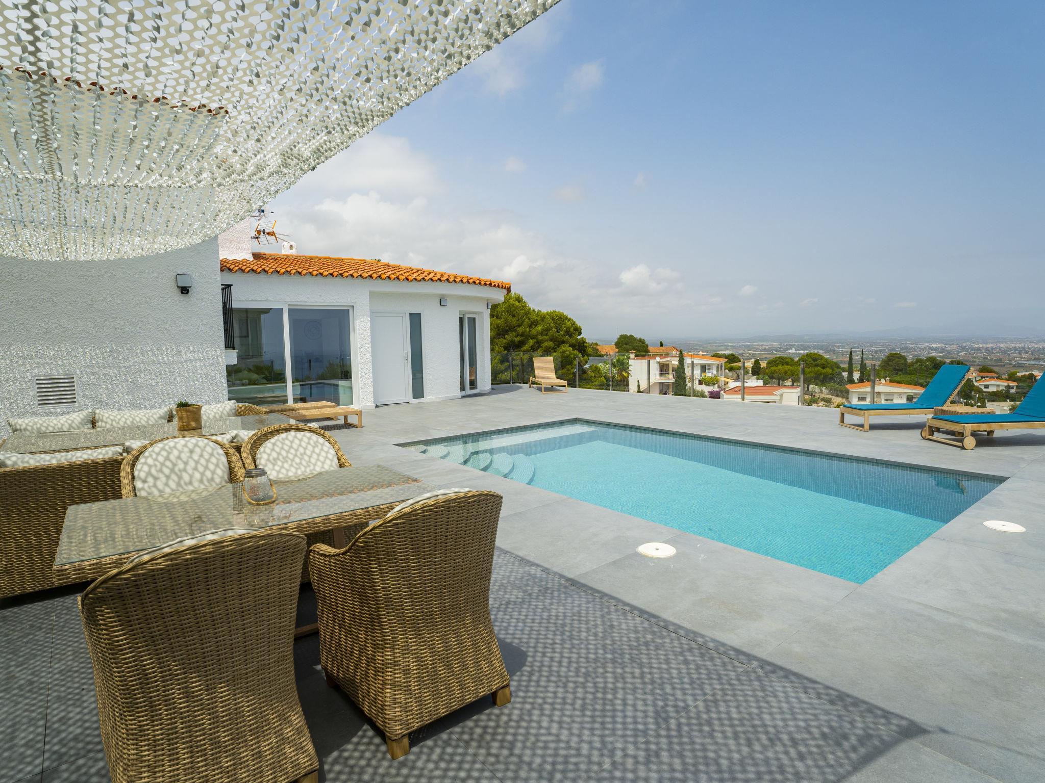 Large, modern, cosy villa "Calam de Luna", 3 storeys, renovated in 2024. 2.5 km from the centre of Peñiscola, in the district Atalayas, on top of a hill, residential area (villas), 2.7 km from the sea, 2.7 km from the beach. Private: terraced garden, swimming pool (5 x 3 m, depth 70 - 180 cm, seasonal availability: 01.Apr. - 31.Oct.). Outdoor shower, terrace (150 m2), barbecue. In the house: WiFi, air conditioning, washing machine. (18 steps). Parking (for 2 cars). Supermarket 2.2 km, shopping centre 9 km, restaurant 2 km, bar 2 km, café 1.8 km, bicycle rental 2.5 km, bus stop "Plaza Constitución" 2.5 km, railway station "Benicarló-Peñíscola" 11 km, sandy beach "Playa Norte-Playa Sur" 2.5 km. Golf course (18 hole) 35 km. Nearby attractions: Castillo Peñiscola 3.5 km, Laberinto Peñiscola más grande Europa 8 km, Delta del Ebro 45 km, Morella 75 m, Ciutat de les Arts i les Ciències 145 km, Port Aventura 120 km. Hiking paths: Parque Natural Sierra de Irta 6 km. Please note: car recommended, no lift. Object suitable for 8 adults + 4 children groups of teenagers on request only. On request: airport transfer to the holiday accommodation.