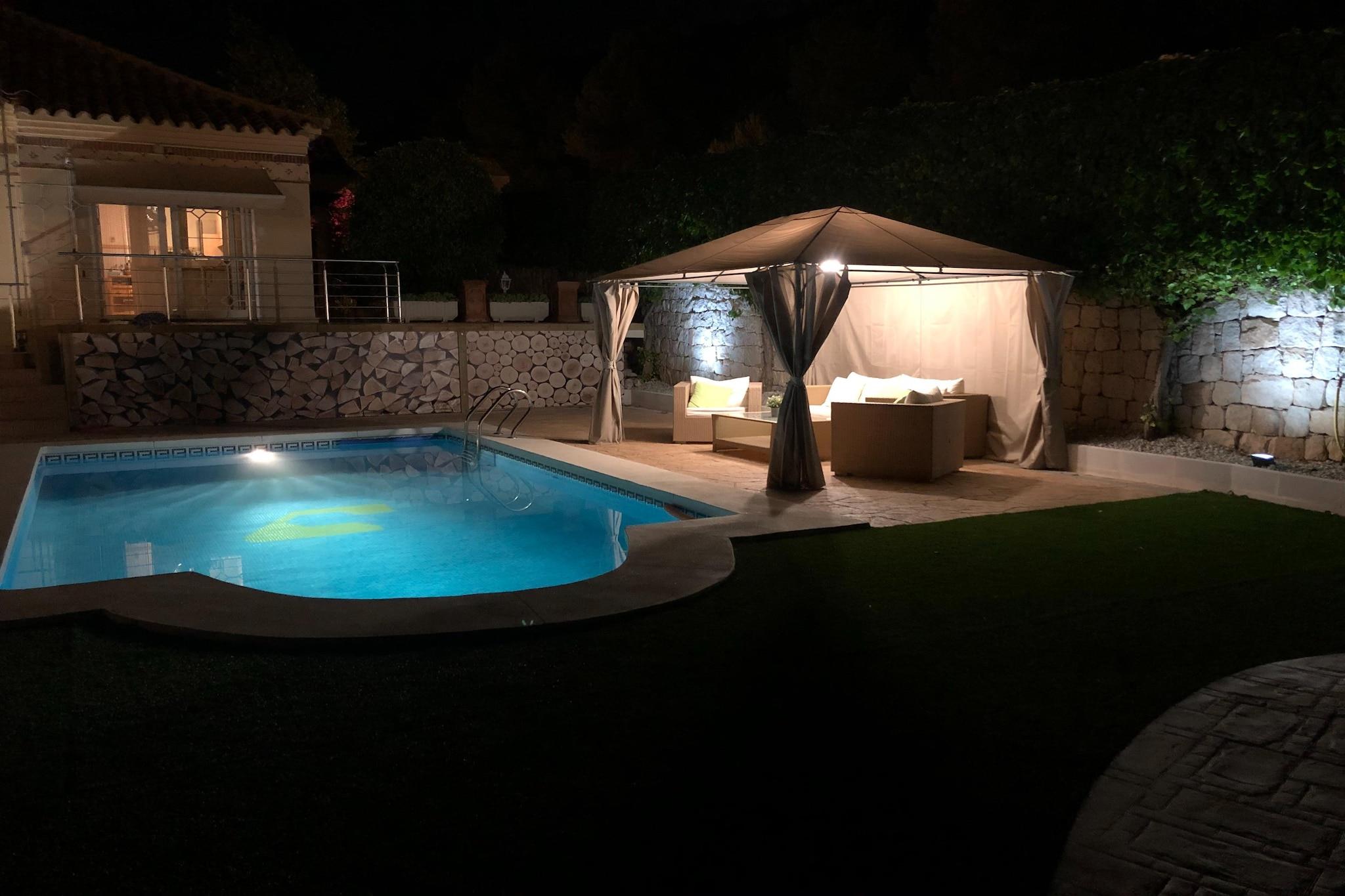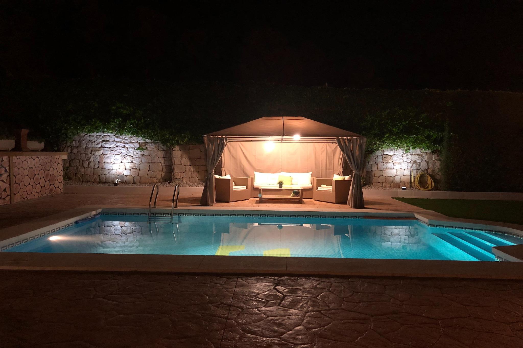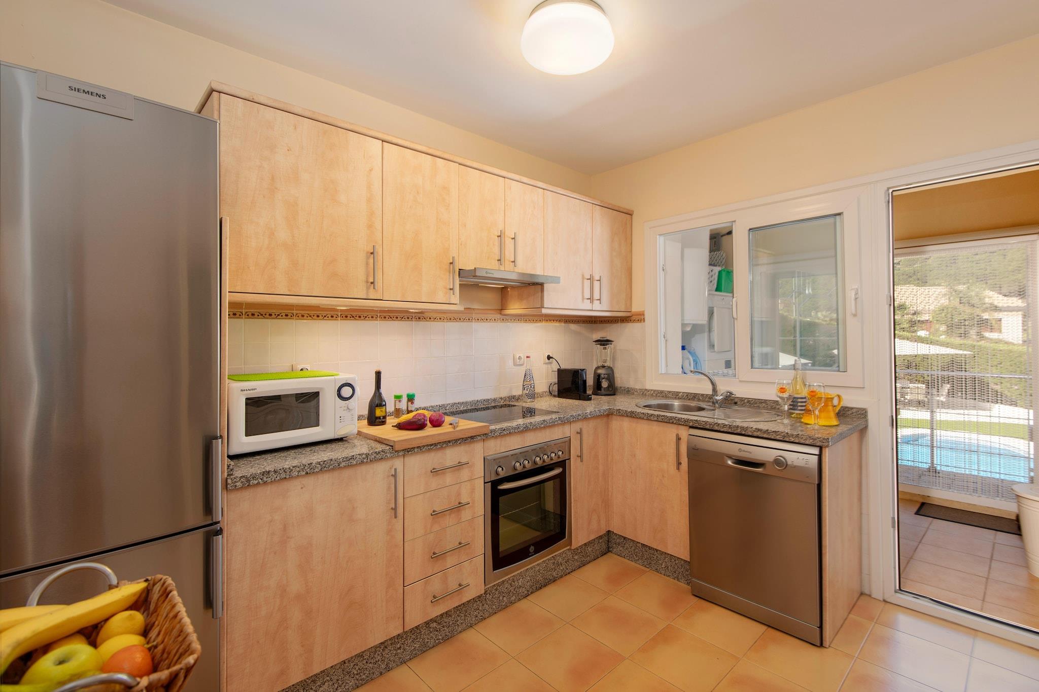 Stueetage: (Stue(Internetadgang, dobbeltsovesofa, Fjernsyn(Smart-TV), spisebord, kakkelovn(pille), sofahjørne, klimaanlæg), åbent køkken(kogeplade, emhætte, kaffemaskine, ovn, mikrobølgeovn, opvaskemaskine , køle-fryseskab, elektriske kogeplader, , ), soveværelse(dobbeltseng), soveværelse(dobbeltseng), soveværelse(dobbeltseng), badeværelse(bruser, håndvask, toilet), badeværelse(bruser, håndvask, toilet)) Internetadgang, tørretumbler, vaskemaskine, terrasse, have(privat), grill, parkering, swimmingpool(privat, opvarmet)