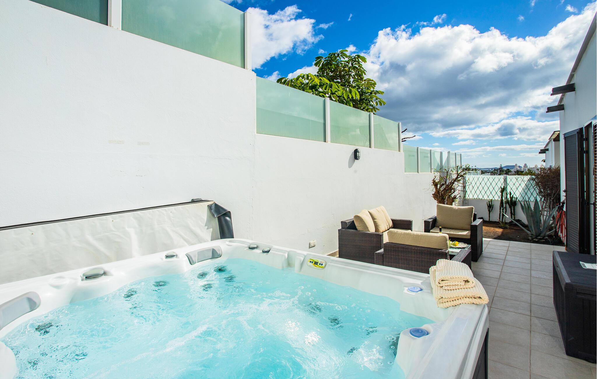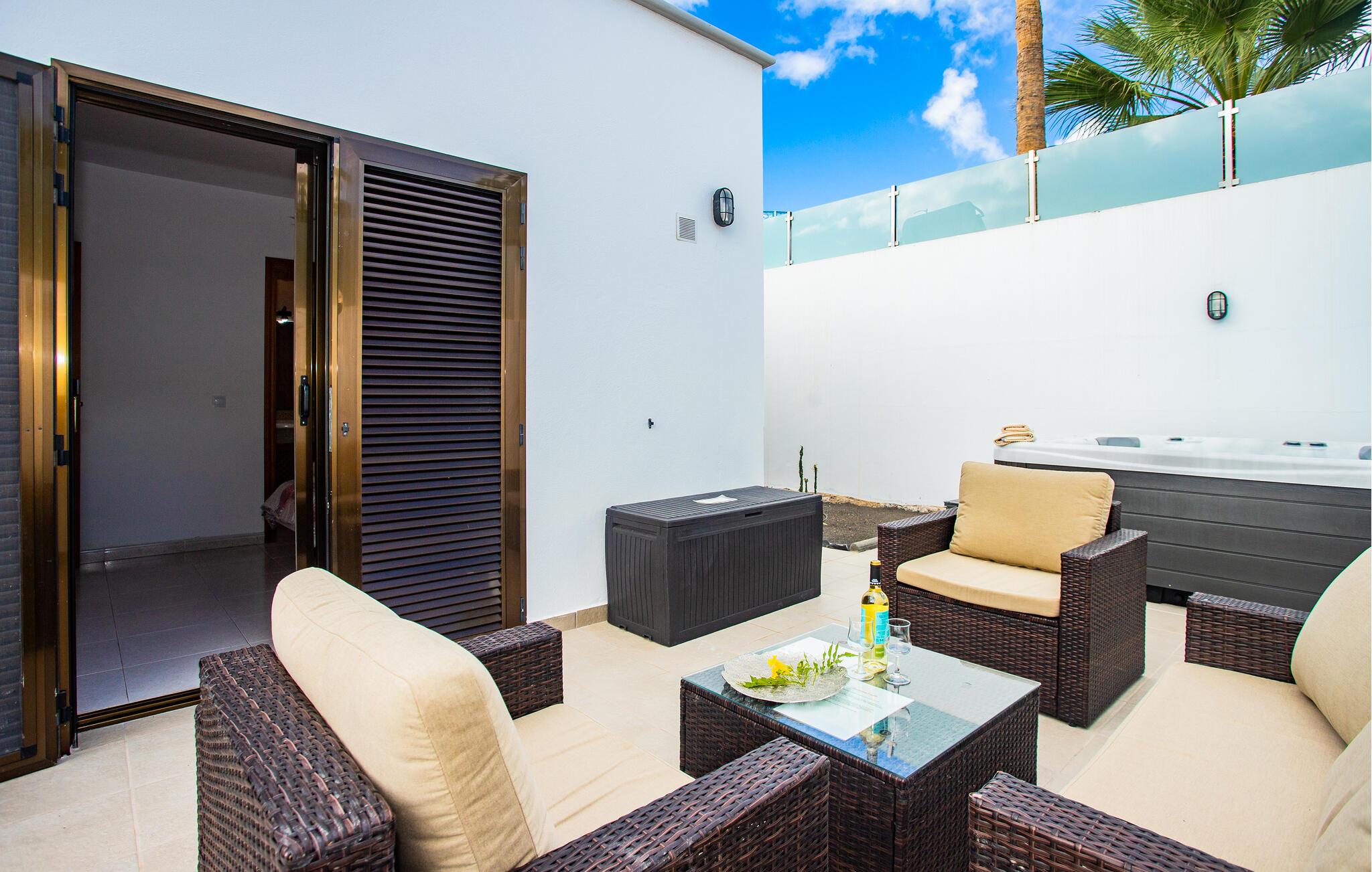 Udeområdet er ideelt til fuldt ud at nyde det vidunderlige klima på Lanzarotes sydligste spids. Snup en frisk dukkert i den glitrende pool, når I har lyst, forkæl jer selv med afslappende siestaer på liggestolene, nyd solnedgangene med et beroligende bad i spabadet, og snak timerne væk med vin og stearinlys, mens de varme aftener skrider frem.