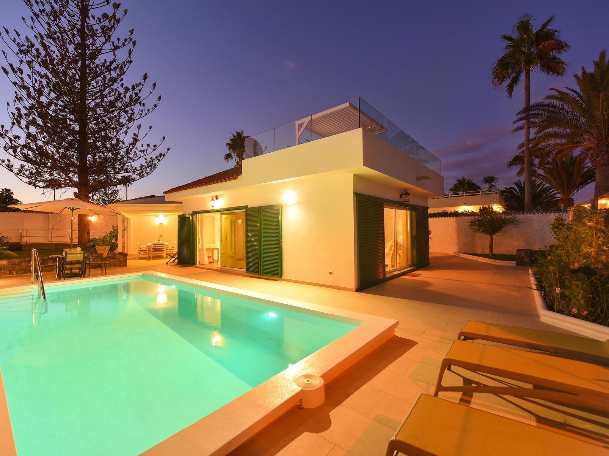 Modern, cosy single-family house "Chalet Golden Sahara". In the centre of Playa del Inglés, in a central, sunny position, 300 m from the sea, 300 m from the beach, direct access to the beach. Private: property (fenced), swimming pool (7 x 3 m, depth 170 - 120 cm, seasonal availability: 01.Jan. - 31.Dec.). Outdoor shower. In the house: air conditioning. Public parking on the road. Shop, grocery, supermarket, restaurant 500 m, bus stop "Plaza de Agaete" 650 m, sandy beach 300 m. The owner does not accept any youth groups. Neighbourhood highly sensitive to noise. Quietness and good behaviour expected.
