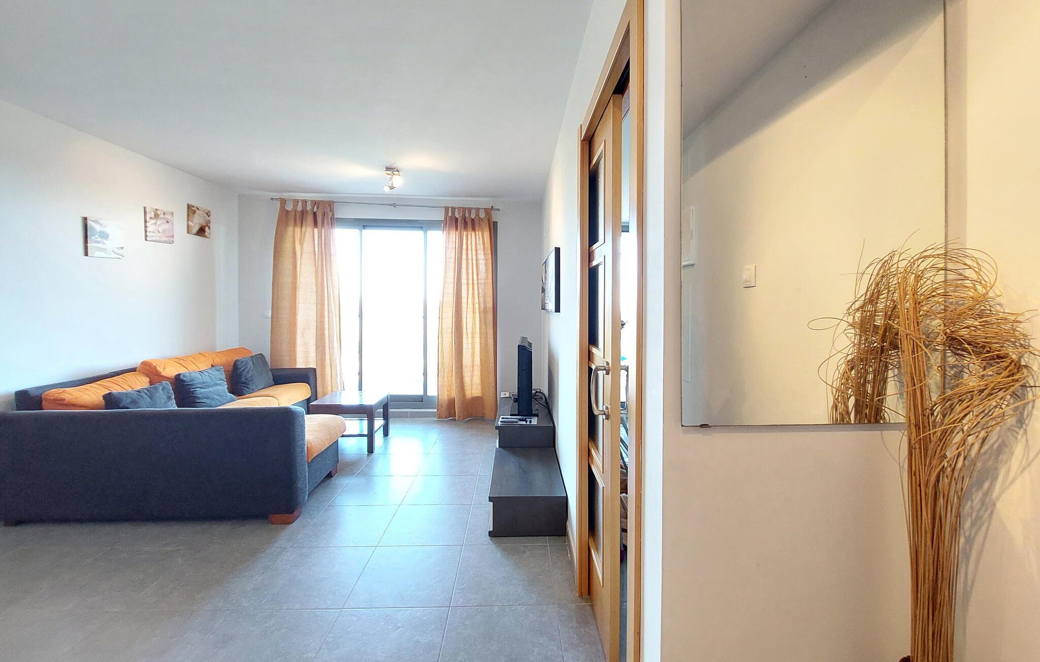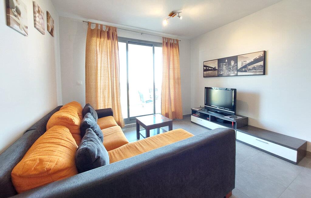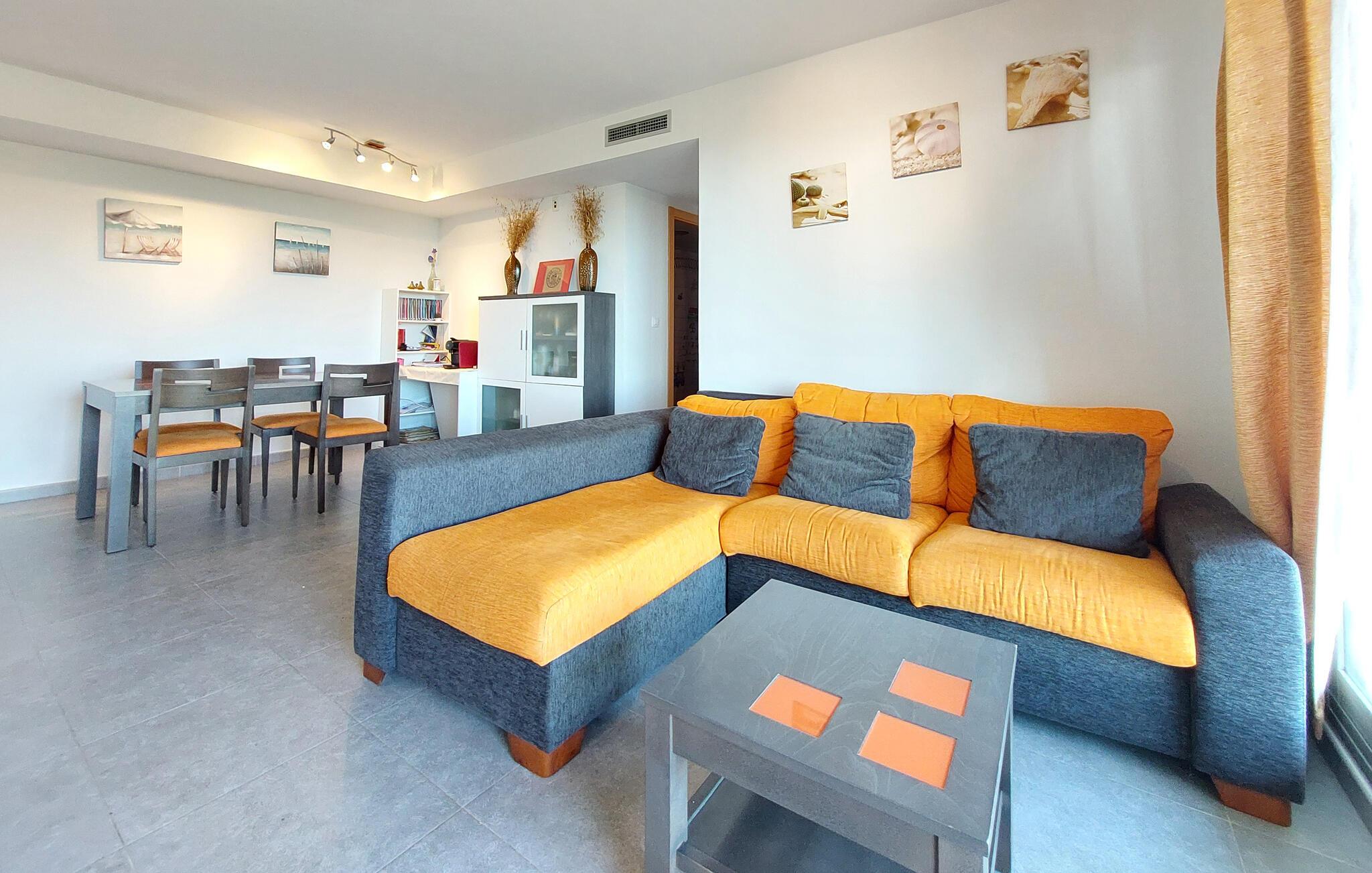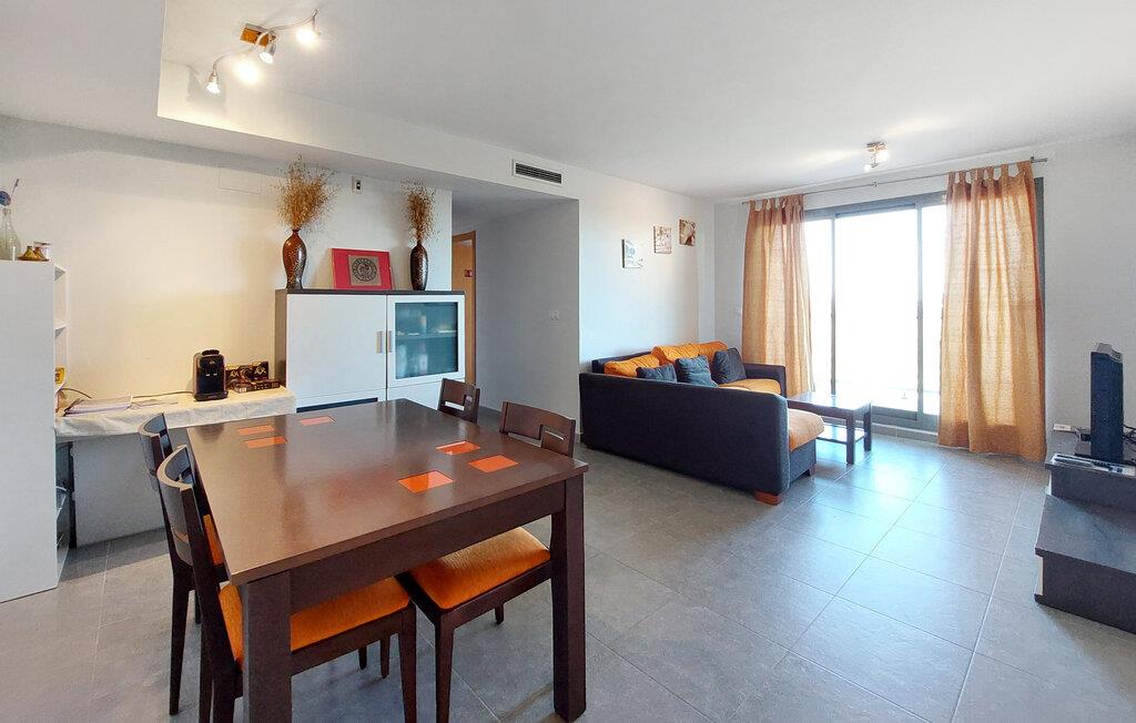 Kun en kort gåtur fra den lange sandstrand inviterer denne velholdte ferielejlighed til en afslappende pause. Tilbered middelhavsdelikatesser i det lyse, veludstyrede køkken og nyd dagens måltider ved det indbydende spisebord. Efter en begivenhedsrig dag kan I synke ned i den komfortable sofa og tilbringe værdifuld tid sammen over en spilleaften.