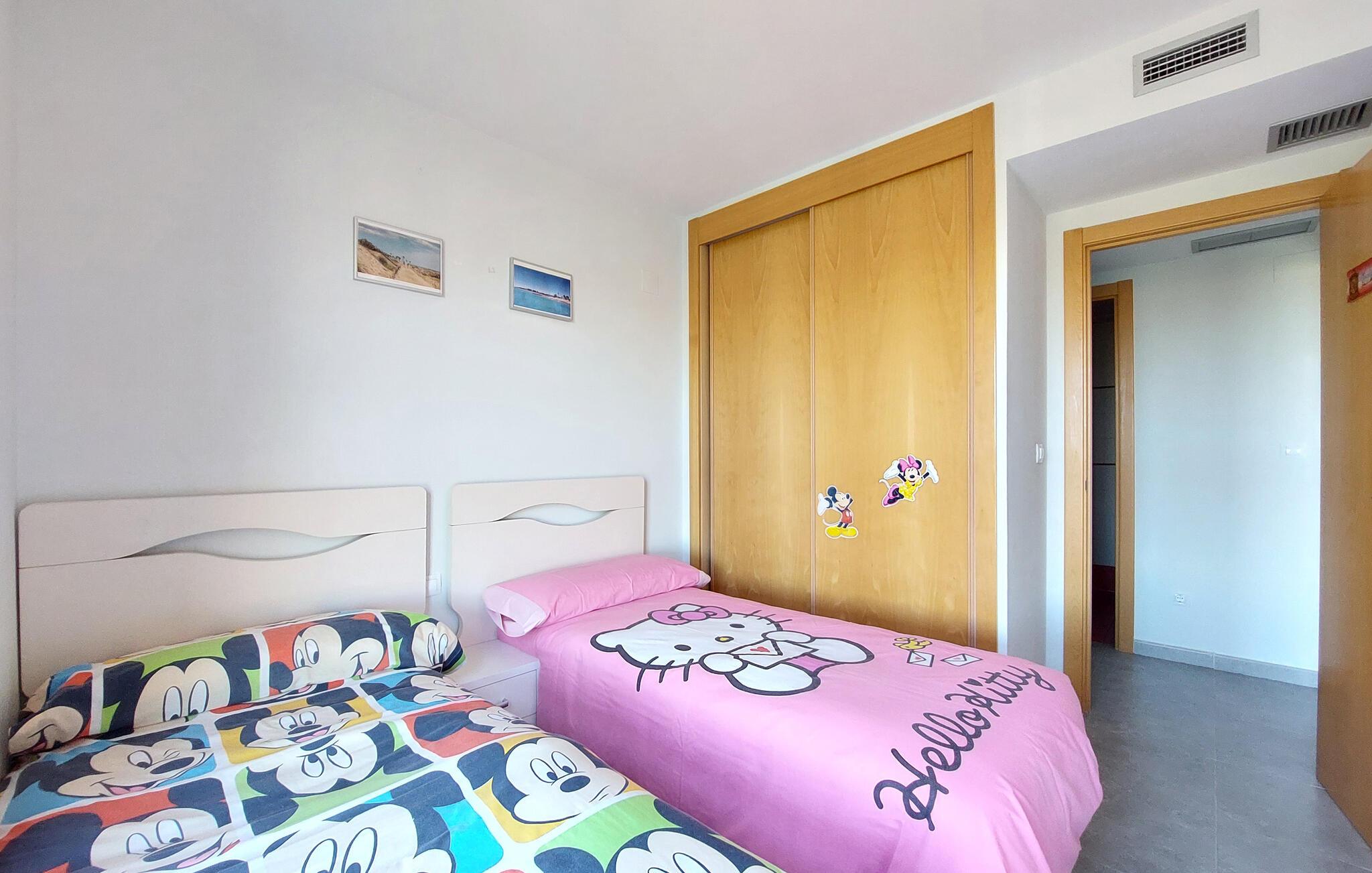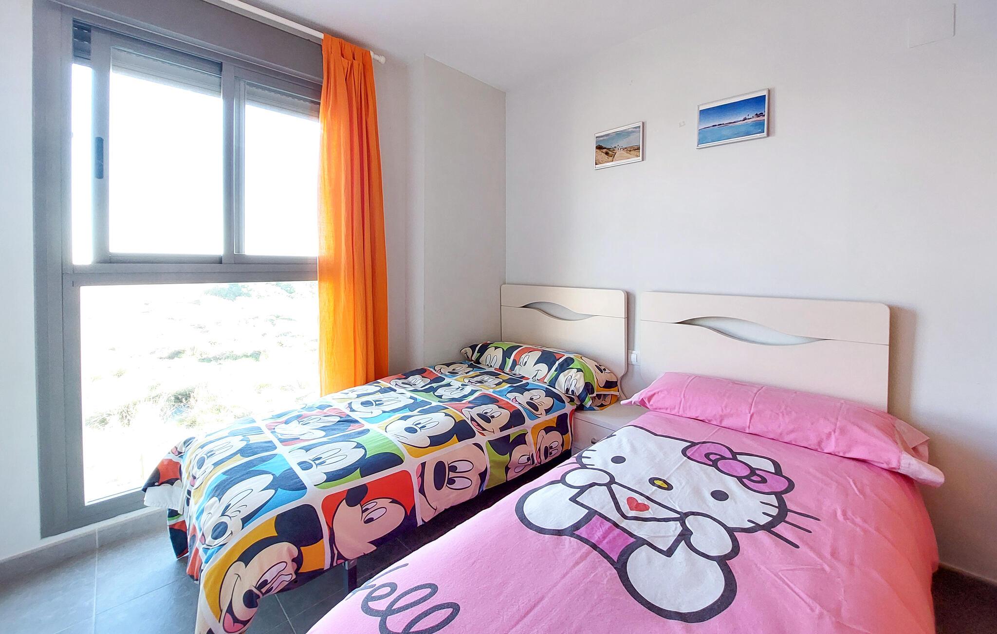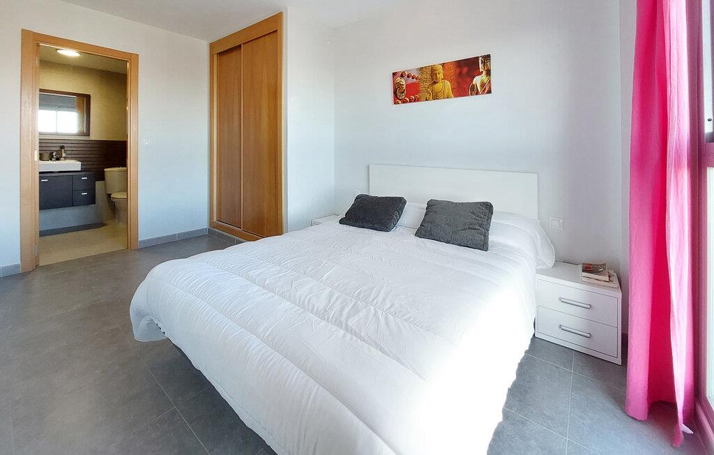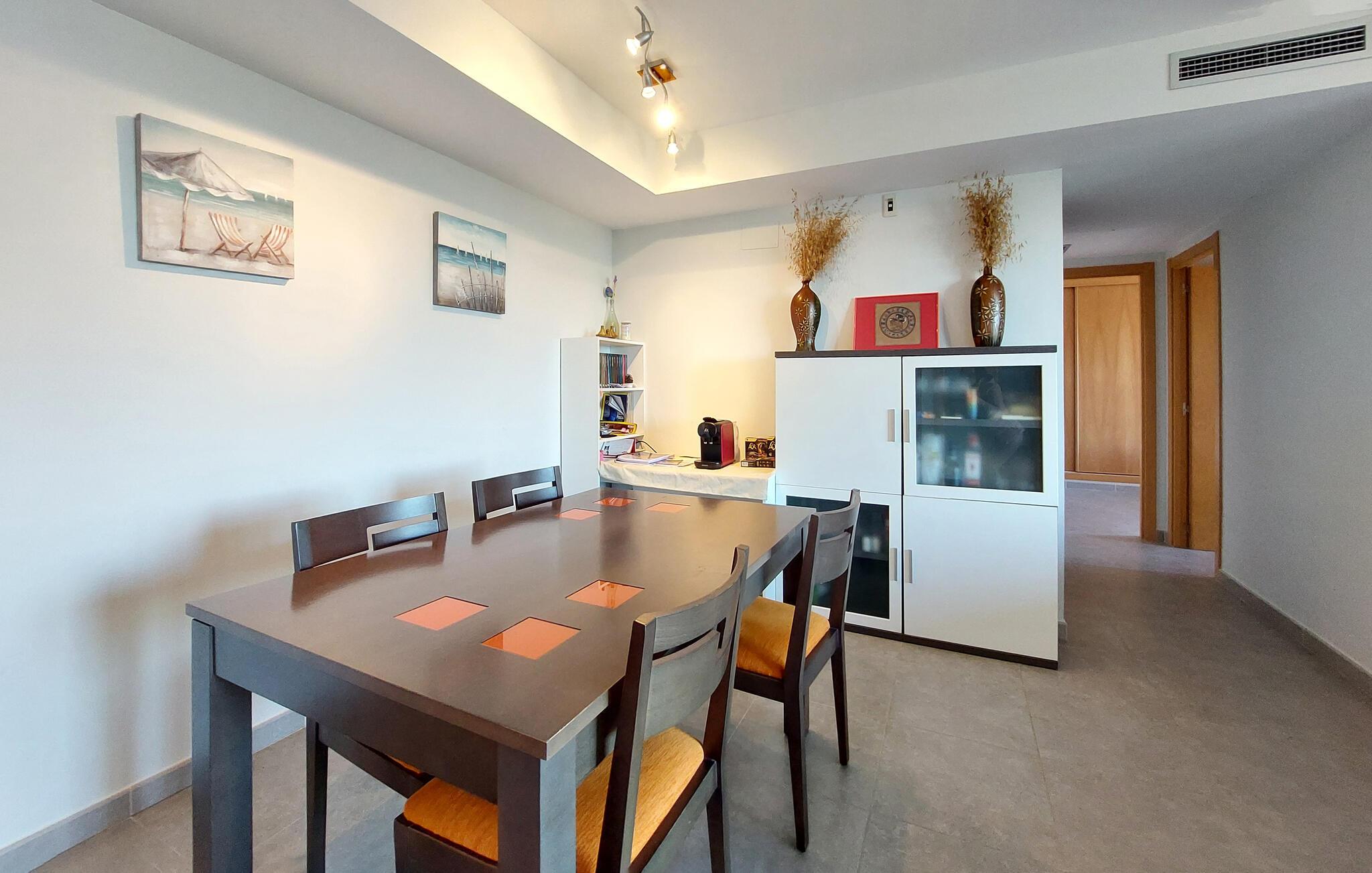 Kun en kort gåtur fra den lange sandstrand inviterer denne velholdte ferielejlighed til en afslappende pause. Tilbered middelhavsdelikatesser i det lyse, veludstyrede køkken og nyd dagens måltider ved det indbydende spisebord. Efter en begivenhedsrig dag kan I synke ned i den komfortable sofa og tilbringe værdifuld tid sammen over en spilleaften.
