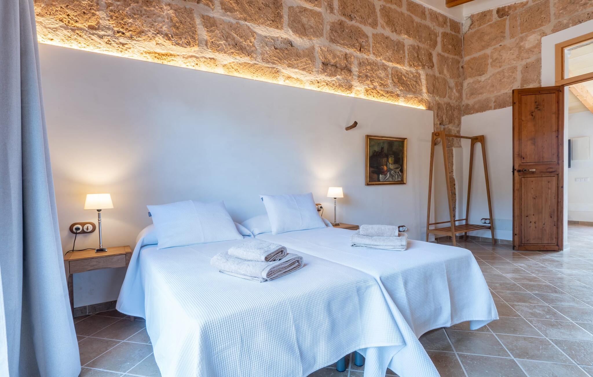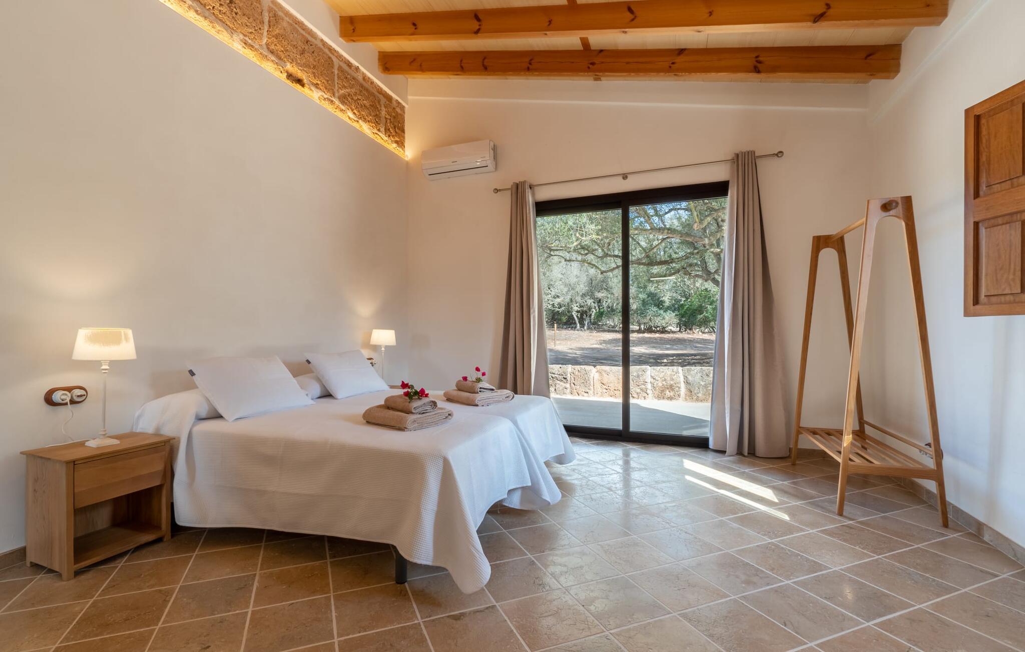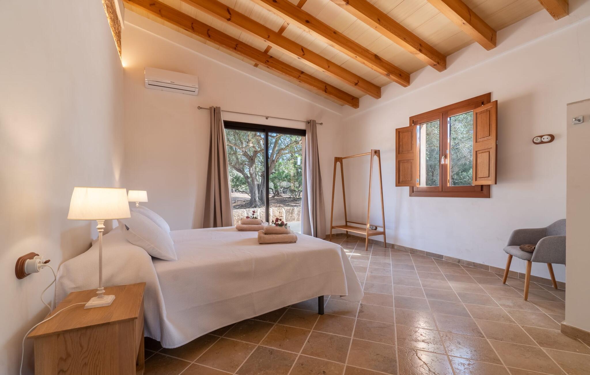Fincaen "Pleta de Son Delabau" ligger på en stor, landlig ejendom i det sydlige Mallorca. En fyrreskov og velplejede marker omgiver huset og den usædvanligt store 22 x 10 m pool. Den tidligere kunstvandingspool er blevet omdannet til et vidunderligt, forfriskende højdepunkt i dette feriehus. Kvidren fra cikader og nogle får bidrager til en fredelig atmosfære her. Den overdækkede veranda ved siden af huset indbyder til hyggelige måltider og grillaftener i skyggen. I lavsæsonen kan dette feriehus varmt anbefales til cyklister og golfspillere: Fincaen ligger på en udpeget cykelrute og har opbevaringsfaciliteter til cykler. Son Antem-golfbanen ligger kun 7 minutter væk i bil. Inde i dette feriehus til 4 personer finder I et kærligt designet stueetage opholdsrum. Rustikke elementer som naturstensvægge, træbjælkelofter, terracottagulve og træskodder er blevet kombineret med moderne, komfortable møbler og hyggelig belysning. Fra opholds- og spiseafdelingen er der let adgang til udendørsområdet. Det fuldt udstyrede køkken i landlig stil er åbent til opholdsstuen. To rummelige dobbeltværelser med en-suite badeværelser og privat adgang til det udendørs område garanterer en afslappende nattesøvn. De er udstyret med aircondition og kan opvarmes i de køligere årstider. Anlægget drives udelukkende med solenergi. Feriehuset ligger i det landlige flade land i det sydlige Mallorca. Llucmajor ligger 10 minutter væk i bil og byder på gode indkøbsmuligheder. Den lange naturlige strand Sa Rápita og øens hovedstad Palma ligger 20 minutter væk i bil. Det er 7 minutters kørsel til Son Antem-golfbanen.