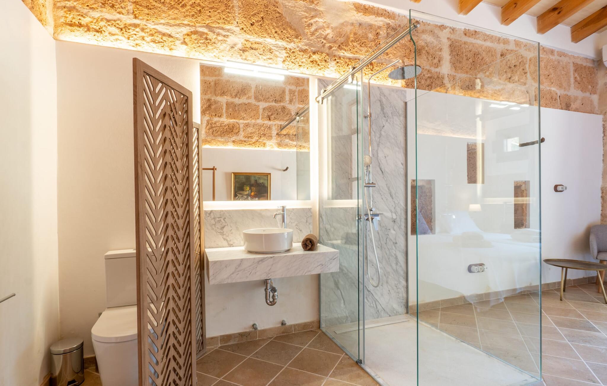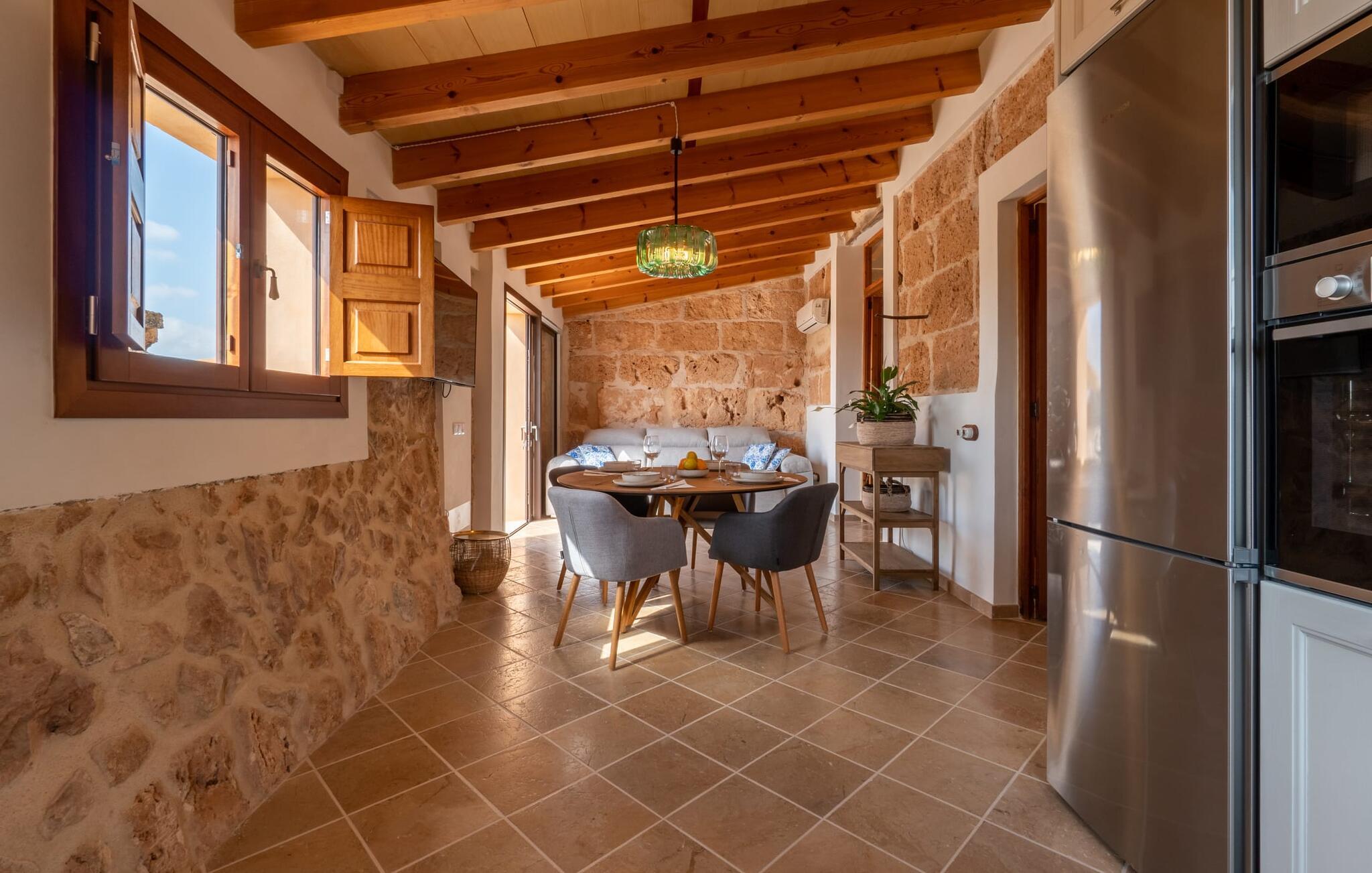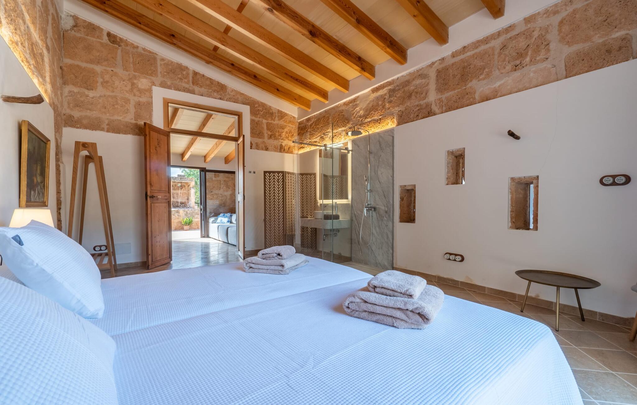 Fincaen "Pleta de Son Delabau" ligger på en stor, landlig ejendom i det sydlige Mallorca. En fyrreskov og velplejede marker omgiver huset og den usædvanligt store 22 x 10 m pool. Den tidligere kunstvandingspool er blevet omdannet til et vidunderligt, forfriskende højdepunkt i dette feriehus. Kvidren fra cikader og nogle får bidrager til en fredelig atmosfære her. Den overdækkede veranda ved siden af huset indbyder til hyggelige måltider og grillaftener i skyggen. I lavsæsonen kan dette feriehus varmt anbefales til cyklister og golfspillere: Fincaen ligger på en udpeget cykelrute og har opbevaringsfaciliteter til cykler. Son Antem-golfbanen ligger kun 7 minutter væk i bil. Inde i dette feriehus til 4 personer finder I et kærligt designet stueetage opholdsrum. Rustikke elementer som naturstensvægge, træbjælkelofter, terracottagulve og træskodder er blevet kombineret med moderne, komfortable møbler og hyggelig belysning. Fra opholds- og spiseafdelingen er der let adgang til udendørsområdet. Det fuldt udstyrede køkken i landlig stil er åbent til opholdsstuen. To rummelige dobbeltværelser med en-suite badeværelser og privat adgang til det udendørs område garanterer en afslappende nattesøvn. De er udstyret med aircondition og kan opvarmes i de køligere årstider. Anlægget drives udelukkende med solenergi. Feriehuset ligger i det landlige flade land i det sydlige Mallorca. Llucmajor ligger 10 minutter væk i bil og byder på gode indkøbsmuligheder. Den lange naturlige strand Sa Rápita og øens hovedstad Palma ligger 20 minutter væk i bil. Det er 7 minutters kørsel til Son Antem-golfbanen.