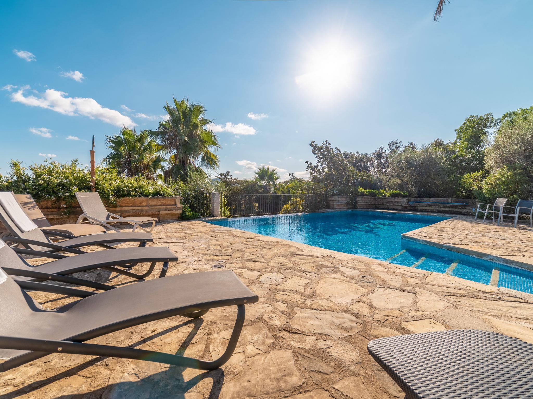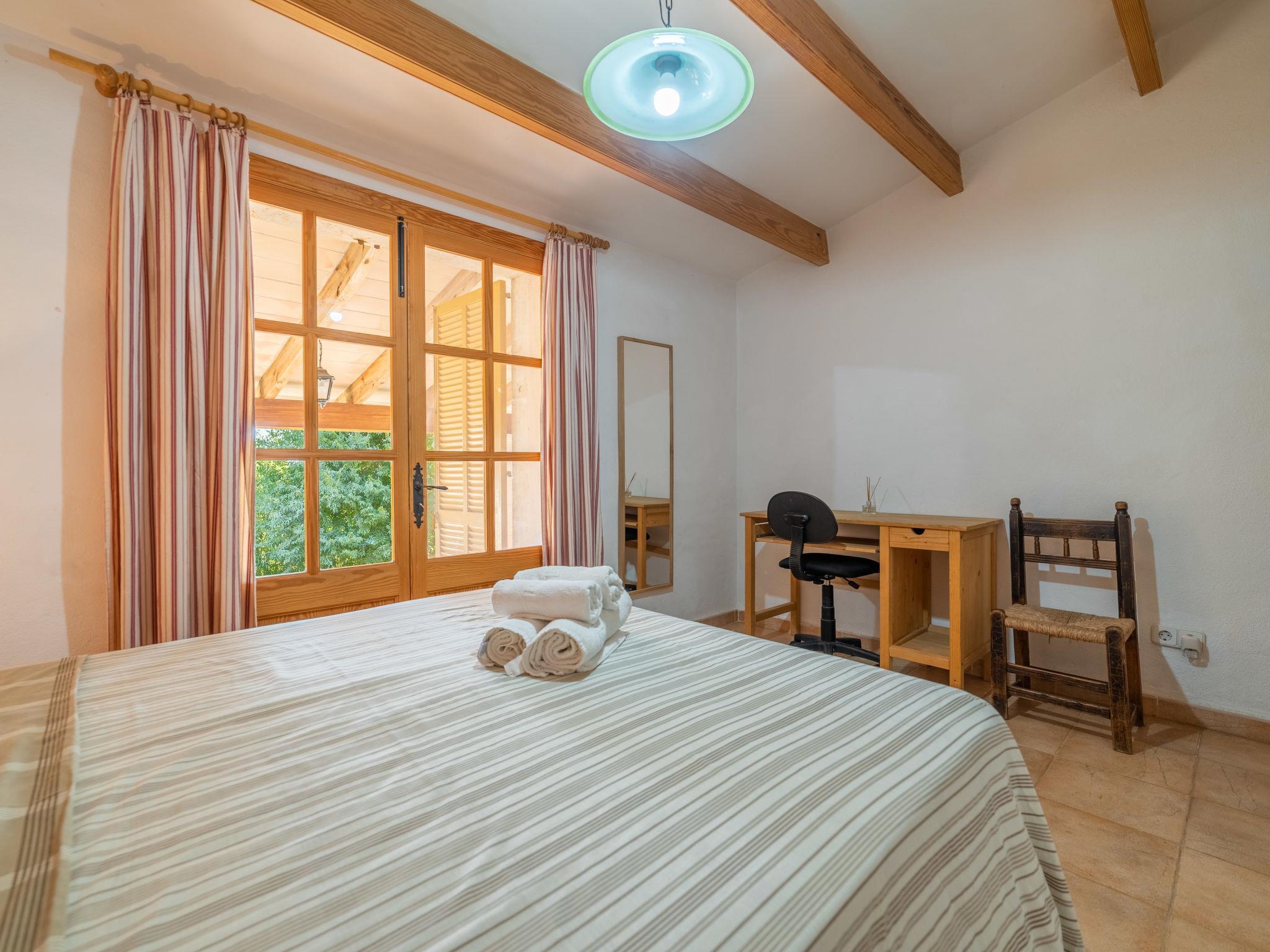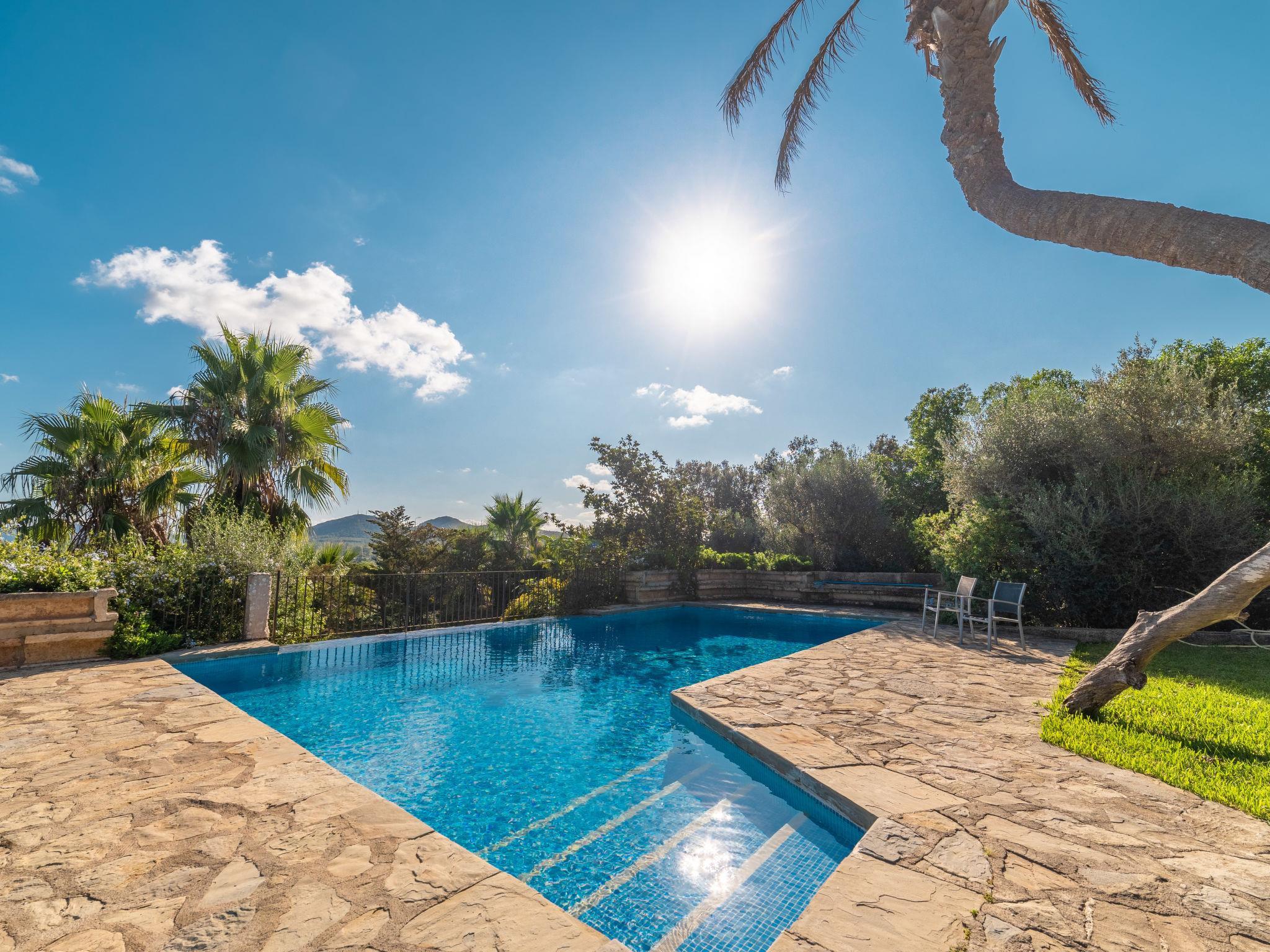 Beautiful farm estate "Can Ferre Nou", detached, surrounded by meadows and fields. 7 km from the centre of Pollensa, 13 km from the centre of Puerto Pollensa, 23 km from the centre of Inca, on top of a hill, 9 km from the sea. Private: property 2'500 m2 (fenced), beautiful garden with lawn and wildlife garden, swimming pool (10 x 5 m, seasonal availability: 01.Jan. - 31.Dec.). Shower/WC in the pool area, outdoor shower. Storeroom available. Stepped path (10 steps) to the house. Roofed, parking on the premises. Shop 6 km, bus stop 3 km, sandy beach "Puerto de Alcúdia" 9 km. Golf course (9 hole) 10 km. Please note: car recommended.
