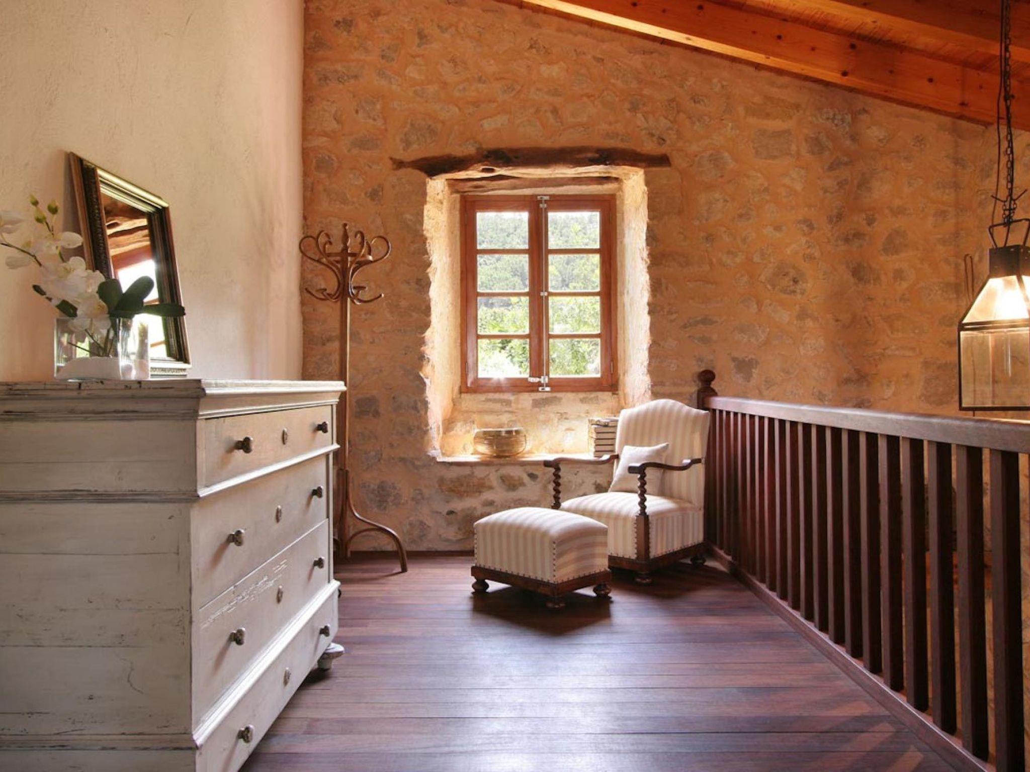 The two-storey house is decorated and furnished in a rustic style, as well as other traditional elements such as exposed stone walls, wooden beams, terracotta floors and so on. Old wooden doors give access to the interior of the house, which welcomes us with a spacious dining room. A few steps lead from the dining room to a small living room fully equipped with WIFI internet connection, TV and DVD. Behind the living room is the kitchen, equipped with electric oven, gas hob, fridge/freezer, microwave and dishwasher. The washing machine is located in a small laundry room just behind the house. A separate living room with stone walls, a fireplace and a shower room complete the ground floor of the house. A wooden staircase leads to the master bedroom, which has a double bed and an en suite bathroom. This room has a wooden floor and beautiful views of the mountains. A second staircase leads to the rest of the bedrooms (two double and one twin) which share a full bathroom with bath and shower. The swimming pool has steps for easy access, and is surrounded by terraces furnished with outdoor furniture.