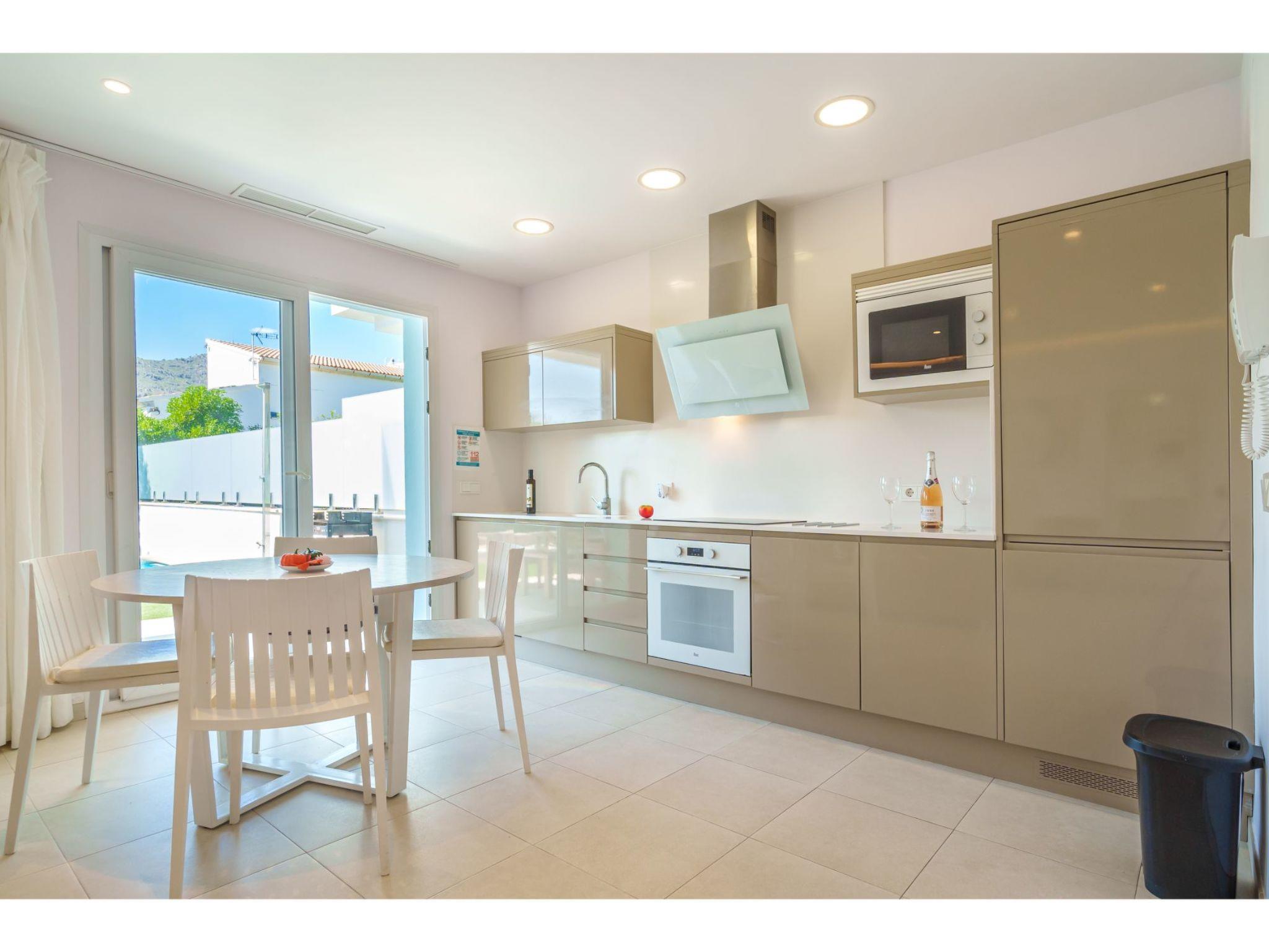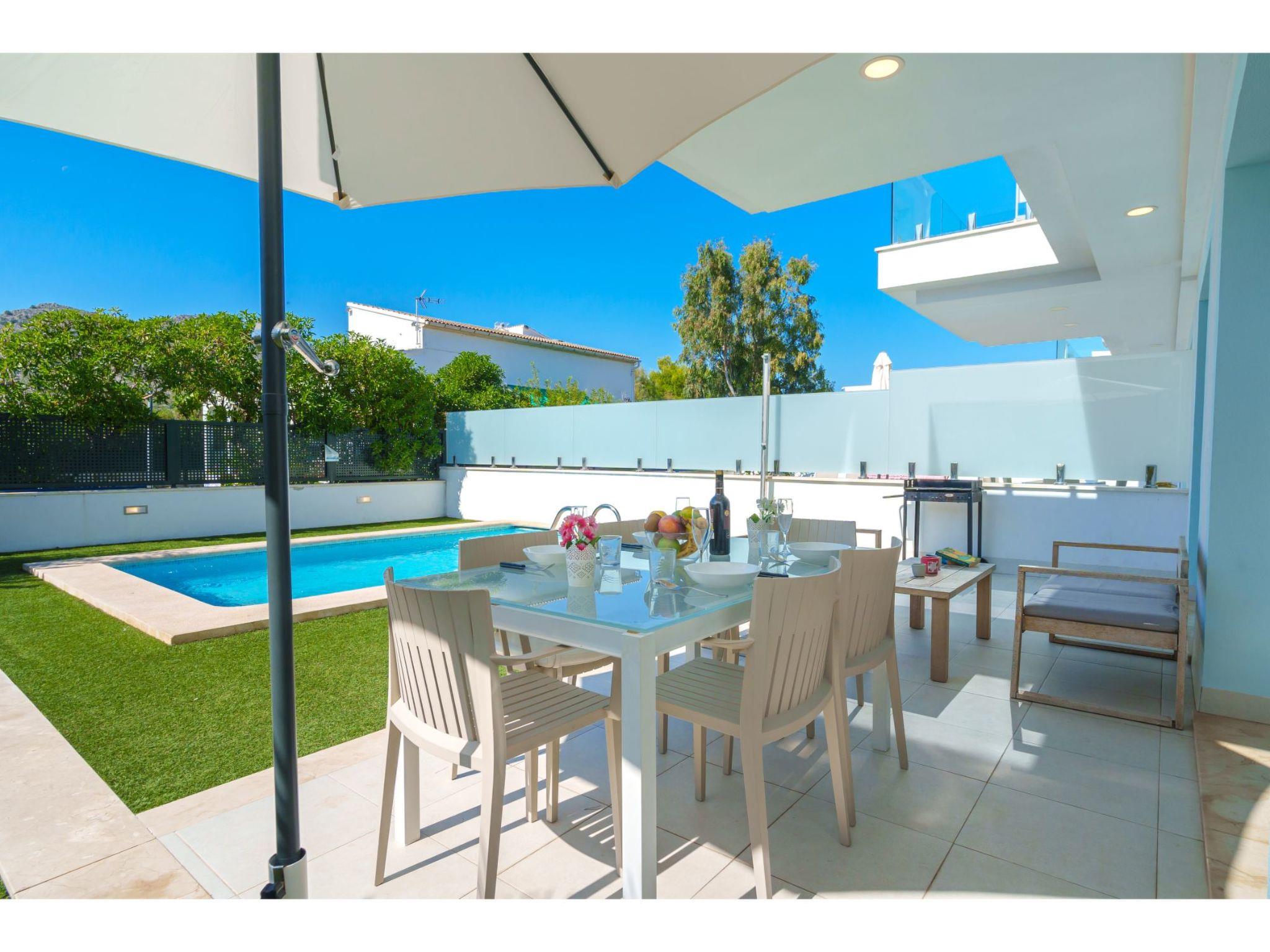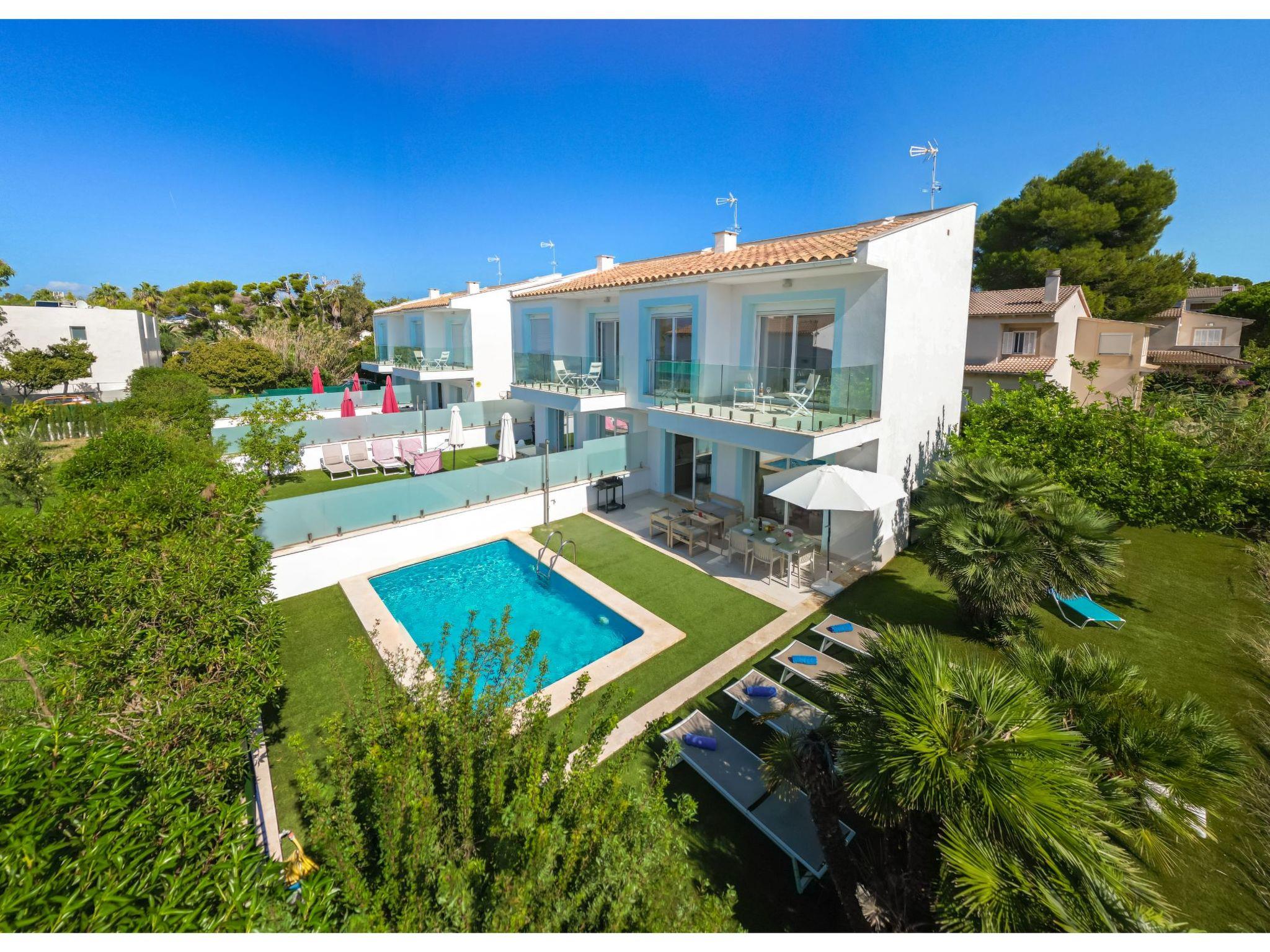 Port d'alcúdia: House for temporary rent, regulated by Law 29/1994, of November 24, on Urban Leases. In this house no tourist services are offered. Very modern, beautiful semi-detached house "Villa del Lago 4", 2 storeys, semi-detached, built in 2017. 4 houses in the resort. In the resort, in a quiet, sunny position, 900 m from the edge of the forest, 100 m from the sea, 3 m from the lake, 120 m from the beach, 1 m directly by the canal, direct access to the lagoon. Private: beautiful garden with lawn and wildlife garden, swimming pool angular (6 x 4 m, seasonal availability: 01.Jan. - 31.Dec.). Outdoor shower, patio, garden furniture. In the house: WiFi, central heating system, air conditioning, washing machine, tumble dryer. Shop 300 m, grocery, supermarket, restaurant, bar, 15 minute walk to the centre, bus stop 200 m, sandy beach 120 m, rocky beach 3 km, bathing lake 3 m. Sports harbour 4.5 km, marina 4.5 km, golf course (18 hole) 7 km, tennis 1 km, riding stable 2 km. Please note: suitable for families, suitable for seniors. Object suitable for 6 adults groups of teenagers on request only. Airfield 50 km from the property. The complex has another 4 houses for rent.