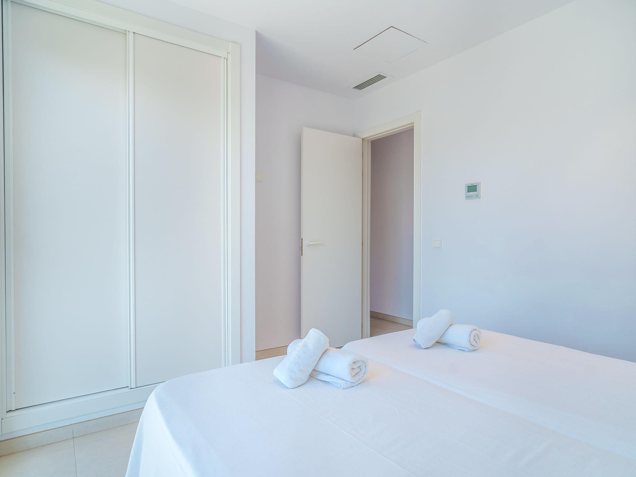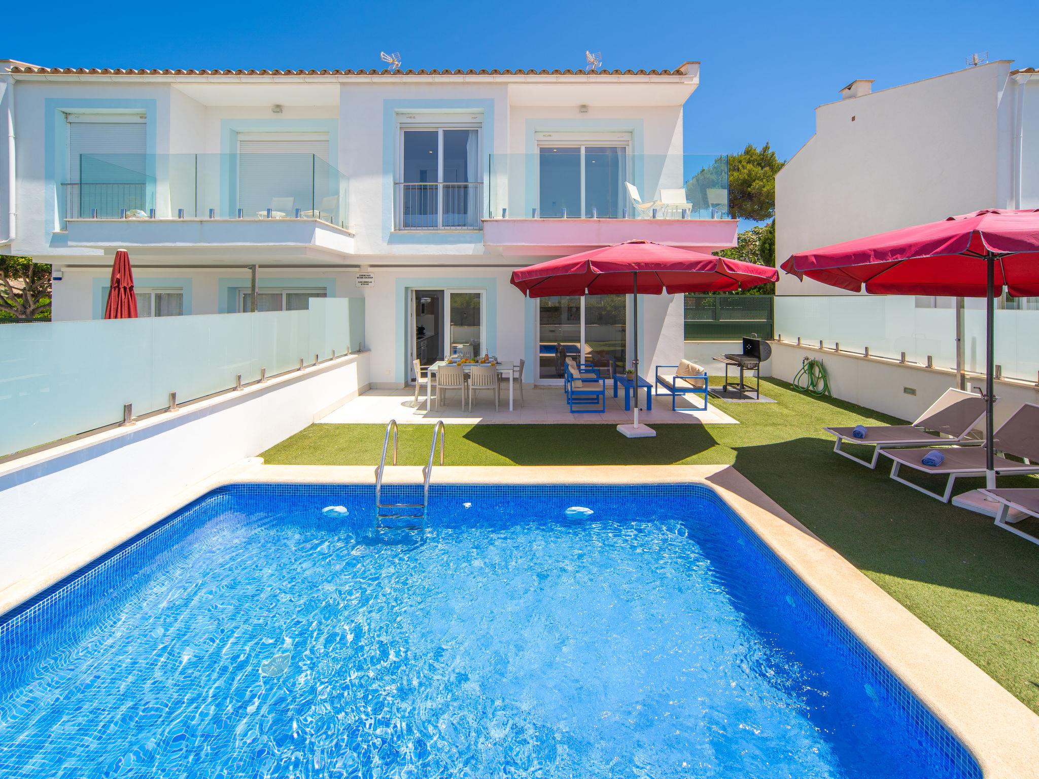 Port d'alcúdia: Very modern, beautiful, cosy house "Teresa Beach 2", 2 storeys, semi-detached, built in 2017. 4 houses in the resort. In the resort, in a quiet, sunny position, 900 m from the edge of the forest, 100 m from the sea, 3 m from the lake, 120 m from the beach, 1 m directly by the canal, direct access to the lagoon. Private: beautiful garden with lawn and wildlife garden, swimming pool angular (6 x 4 m, seasonal availability: 01.Jan. - 31.Dec.). Outdoor shower, patio, garden furniture, barbecue. In the house: WiFi, central heating system, air conditioning, burglar alarm system, washing machine, tumble dryer. Shop 300 m, grocery, supermarket, restaurant, bar, 15 minute walk to the centre, bus stop 200 m, sandy beach 120 m, rocky beach 3 km, bathing lake 3 m. Sports harbour 4.5 km, marina 4.5 km, golf course (18 hole) 7 km, tennis 1 km, riding stable 2 km. Please note: suitable for families, suitable for seniors. Object suitable for 6 adults groups of teenagers on request only. Airfield 50 km from the property. The complex has another 3 houses for rent.