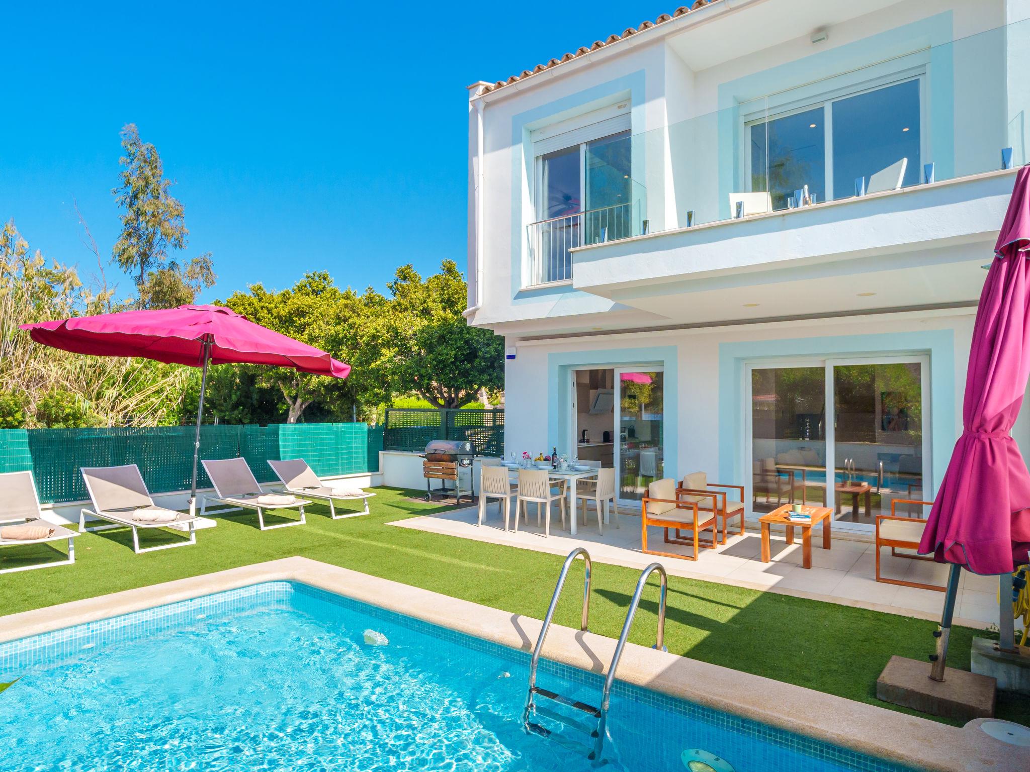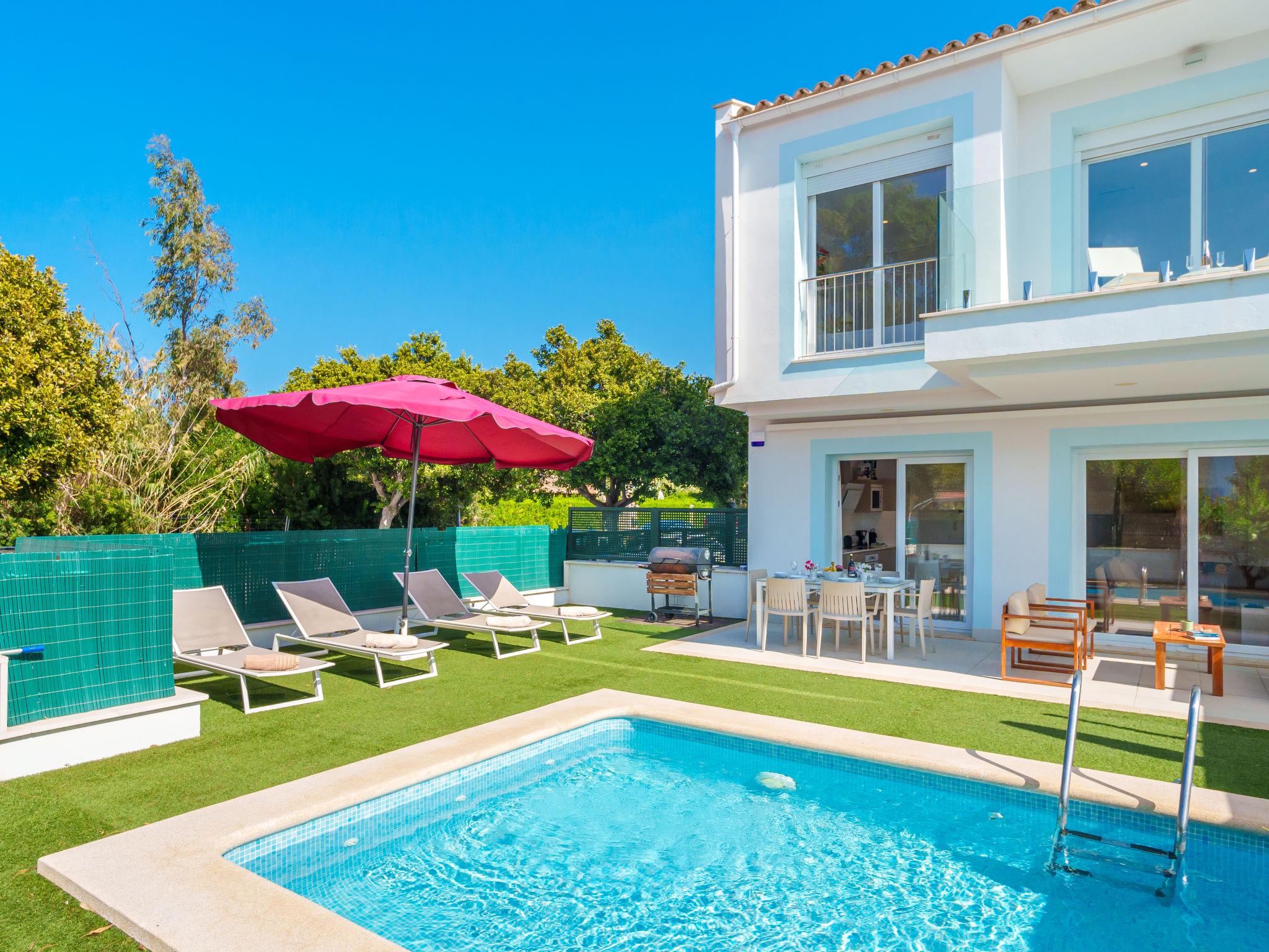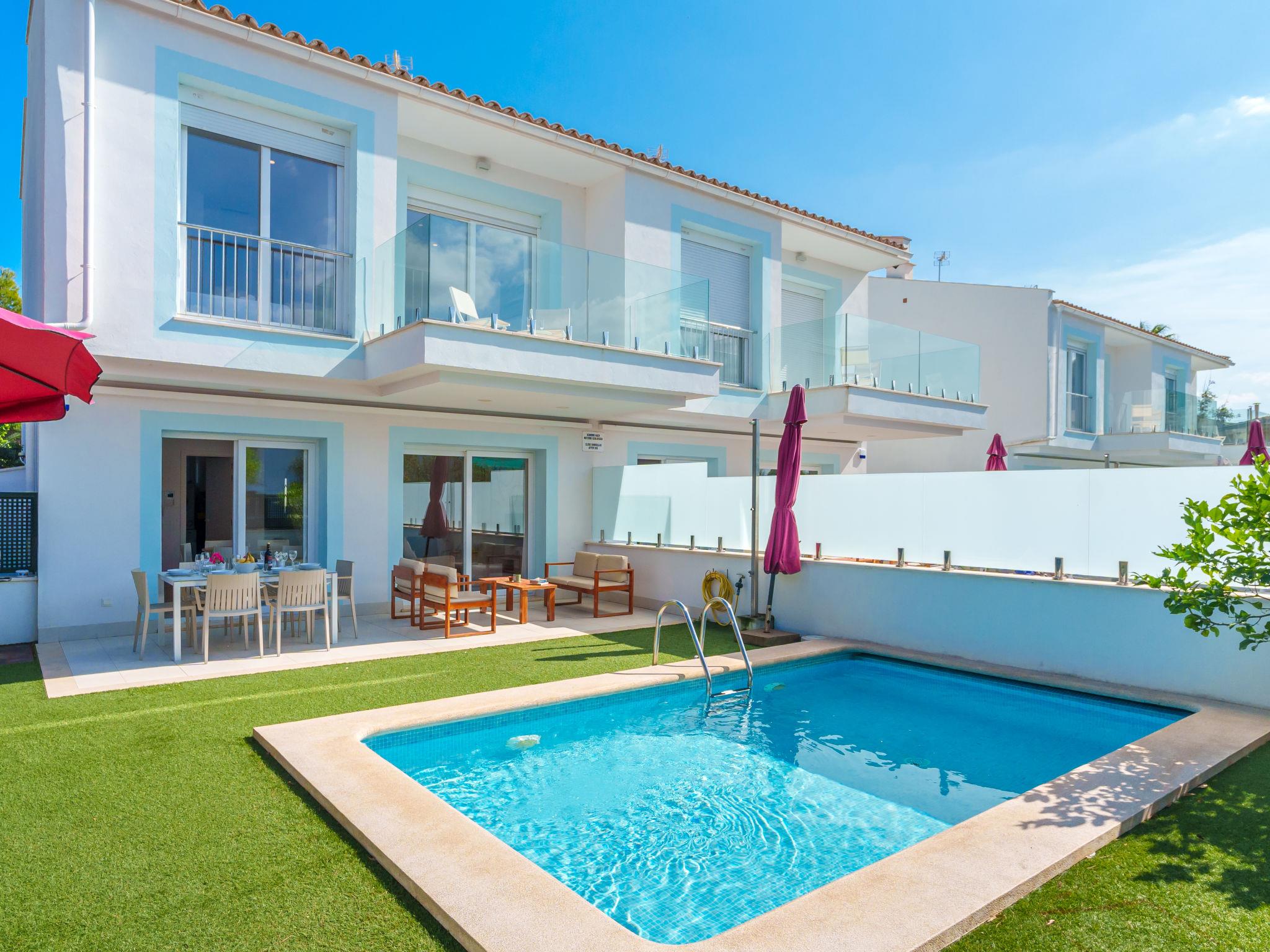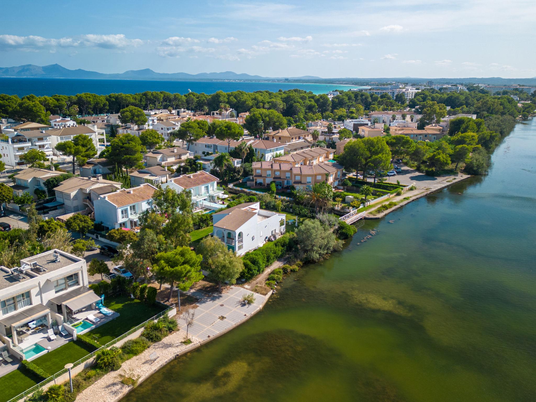Port d'alcúdia: Very modern, beautiful house "Teresa Beach 1", 2 storeys, semi-detached, built in 2017. In the resort, in a quiet, sunny position, 900 m from the edge of the forest, 100 m from the sea, 3 m from the lake, 120 m from the beach, 1 m directly by the canal, direct access to the lagoon. Private: beautiful garden with lawn and wildlife garden, swimming pool angular (6 x 4 m, seasonal availability: 01.Jan. - 31.Dec.). Outdoor shower, patio, arbour, garden furniture. In the house: WiFi, central heating system, air conditioning, burglar alarm system, washing machine, tumble dryer. Shop, grocery, supermarket, restaurant, bar 300 m, 15 minute walk to the centre, bus stop 200 m, sandy beach 120 m, rocky beach 3 km, bathing lake 3 m. Sports harbour 4.5 km, marina 4.5 km, golf course (18 hole) 7 km, tennis 1 km, riding stable 2 km. Please note: suitable for families, suitable for seniors. Object suitable for 6 adults groups of teenagers on request only. Airfield 50 km from the property. The complex has another 4 houses for rent.