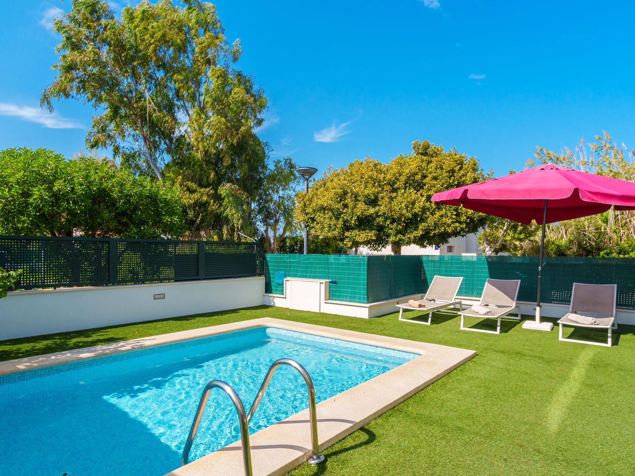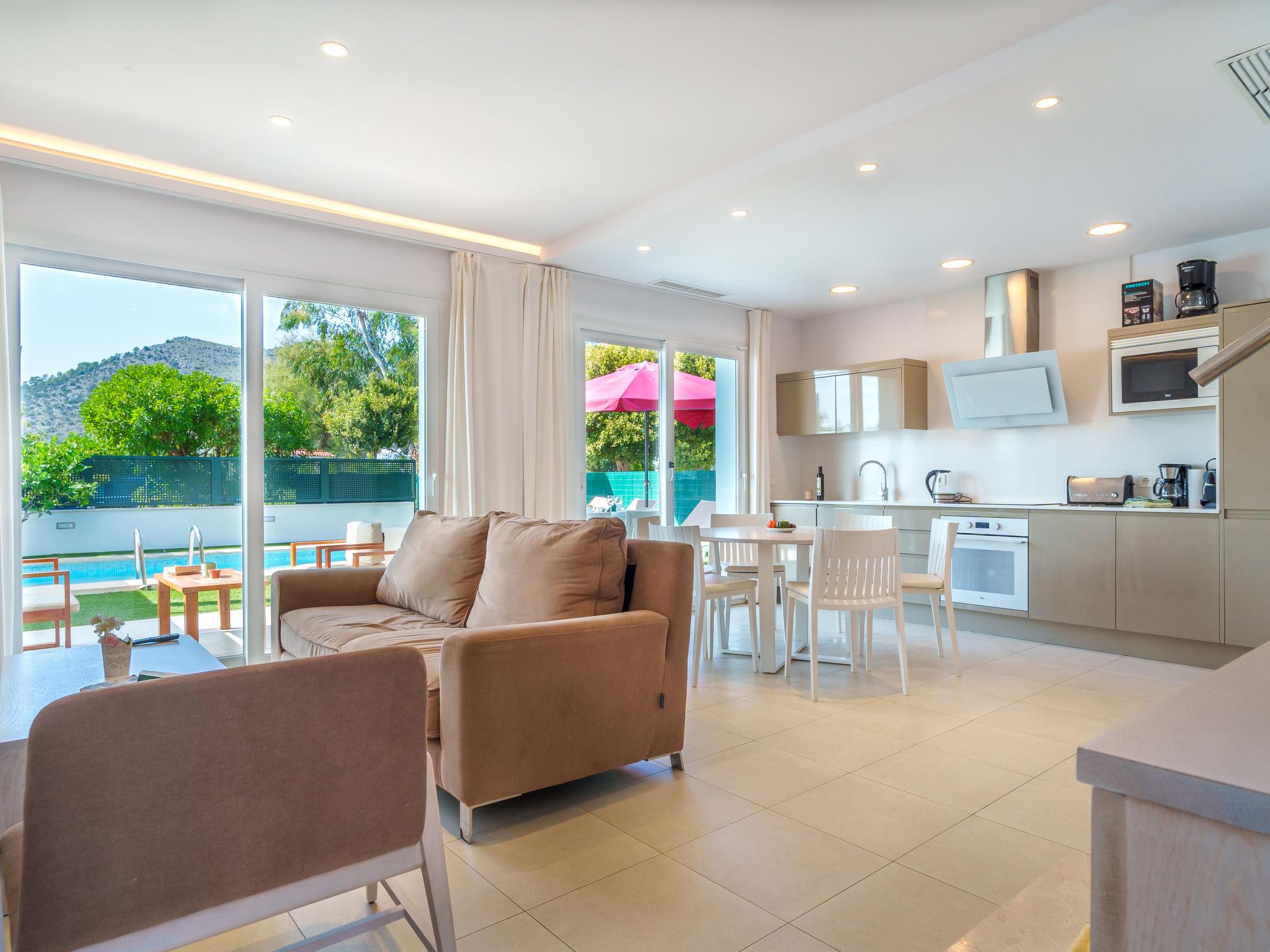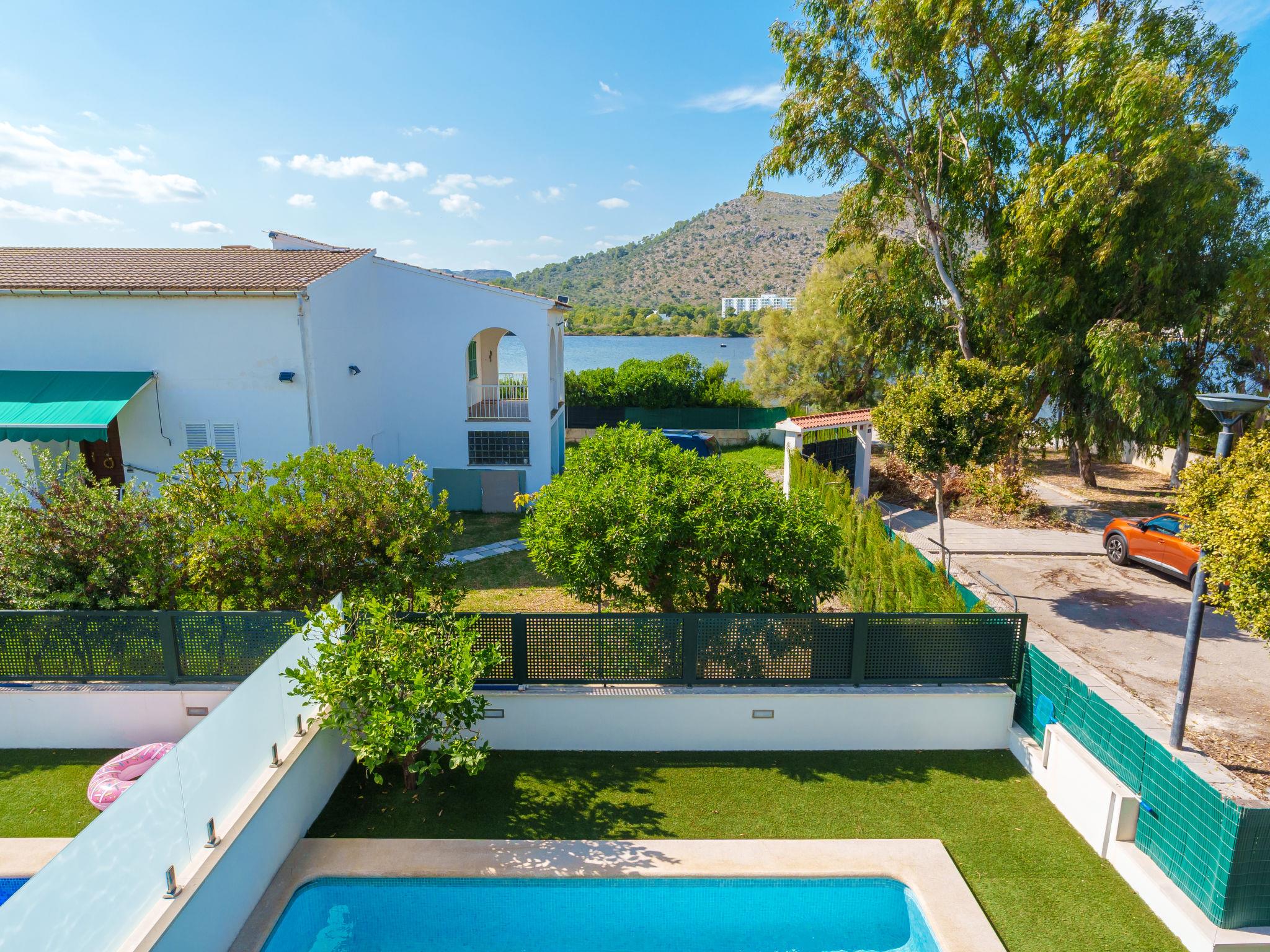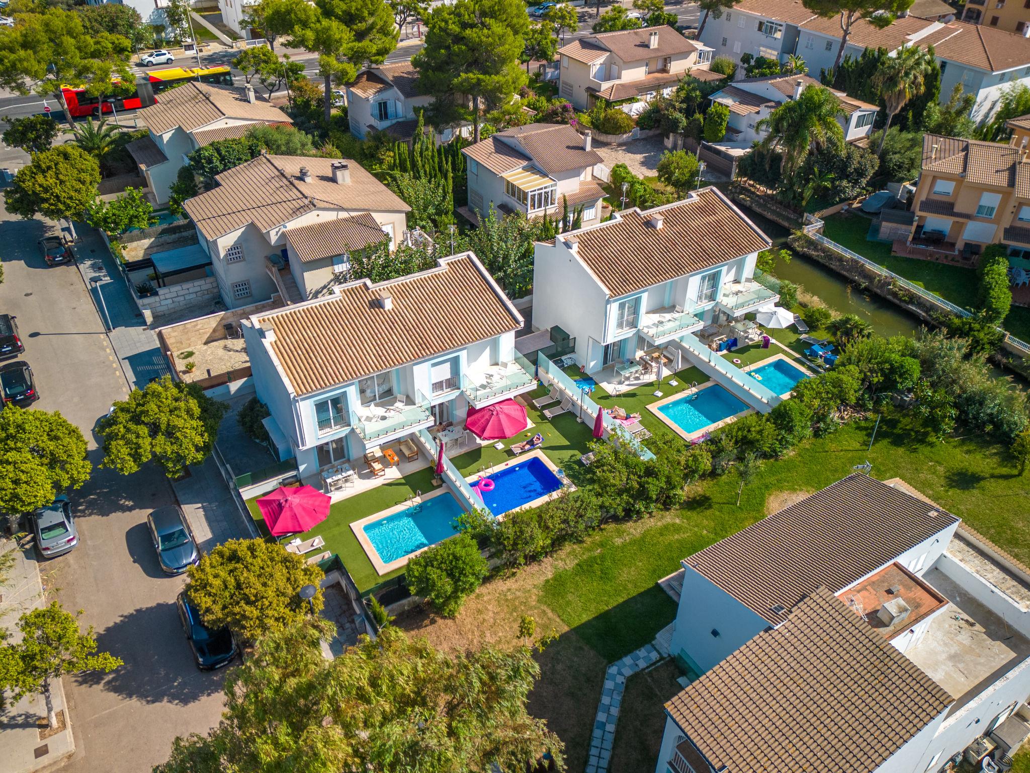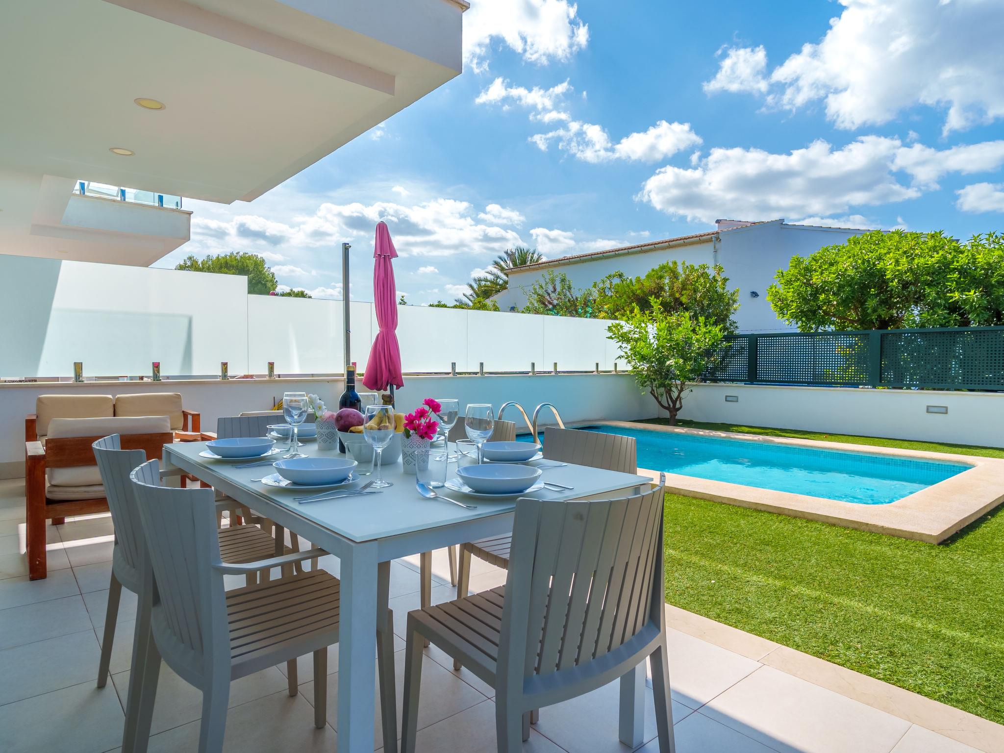 Port d'alcúdia: Very modern, beautiful house "Teresa Beach 1", 2 storeys, semi-detached, built in 2017. In the resort, in a quiet, sunny position, 900 m from the edge of the forest, 100 m from the sea, 3 m from the lake, 120 m from the beach, 1 m directly by the canal, direct access to the lagoon. Private: beautiful garden with lawn and wildlife garden, swimming pool angular (6 x 4 m, seasonal availability: 01.Jan. - 31.Dec.). Outdoor shower, patio, arbour, garden furniture. In the house: WiFi, central heating system, air conditioning, burglar alarm system, washing machine, tumble dryer. Shop, grocery, supermarket, restaurant, bar 300 m, 15 minute walk to the centre, bus stop 200 m, sandy beach 120 m, rocky beach 3 km, bathing lake 3 m. Sports harbour 4.5 km, marina 4.5 km, golf course (18 hole) 7 km, tennis 1 km, riding stable 2 km. Please note: suitable for families, suitable for seniors. Object suitable for 6 adults groups of teenagers on request only. Airfield 50 km from the property. The complex has another 4 houses for rent.