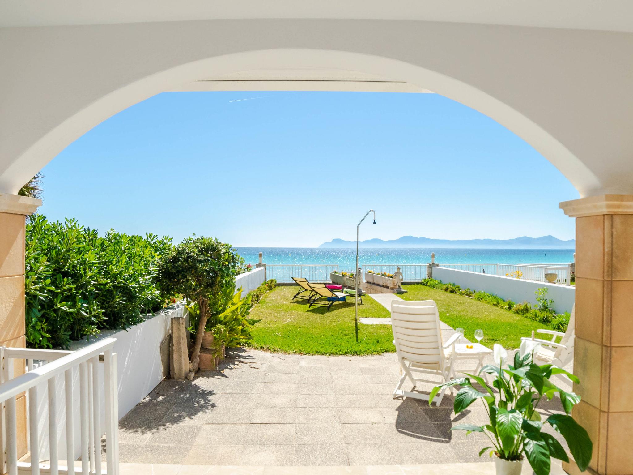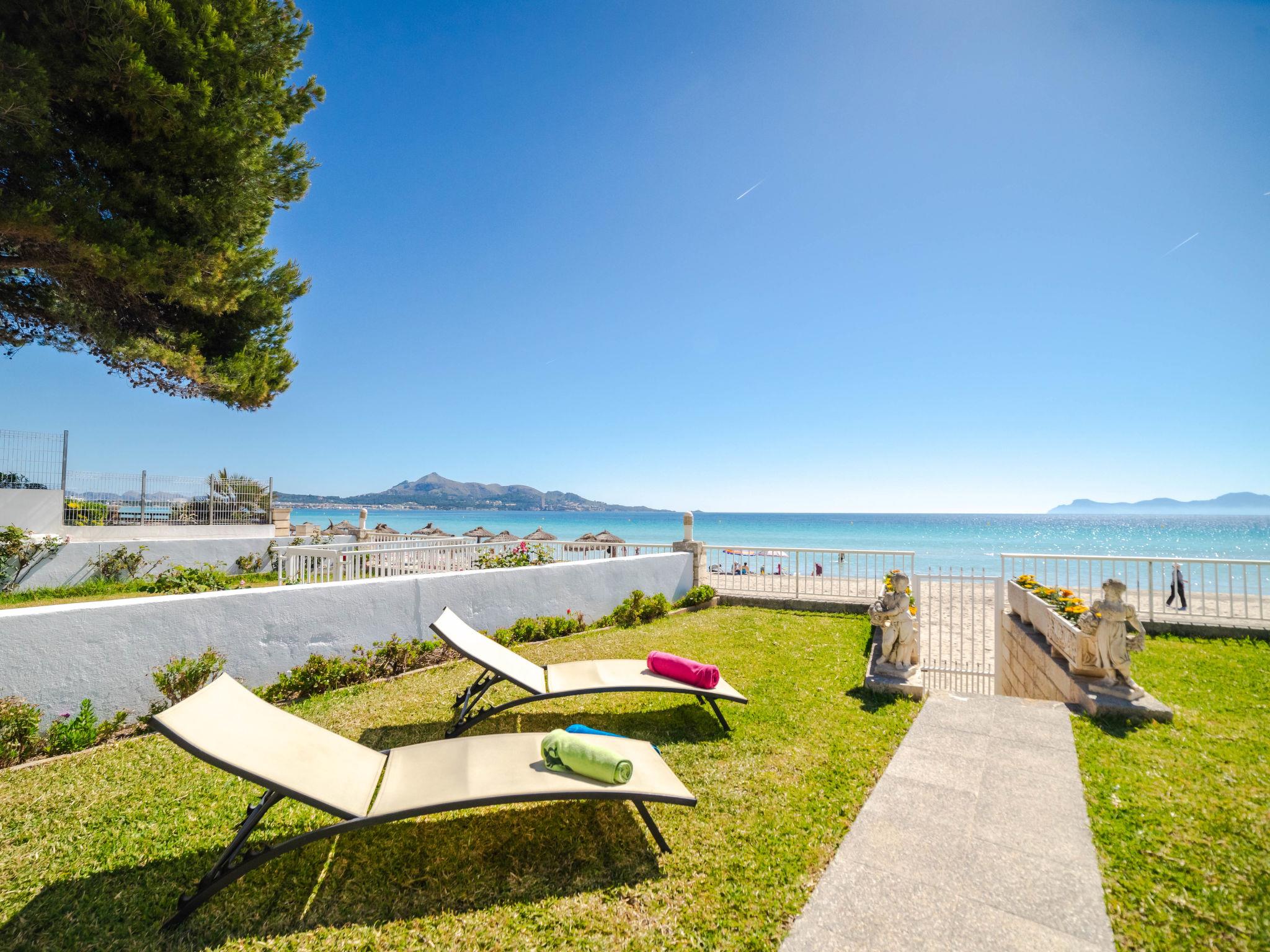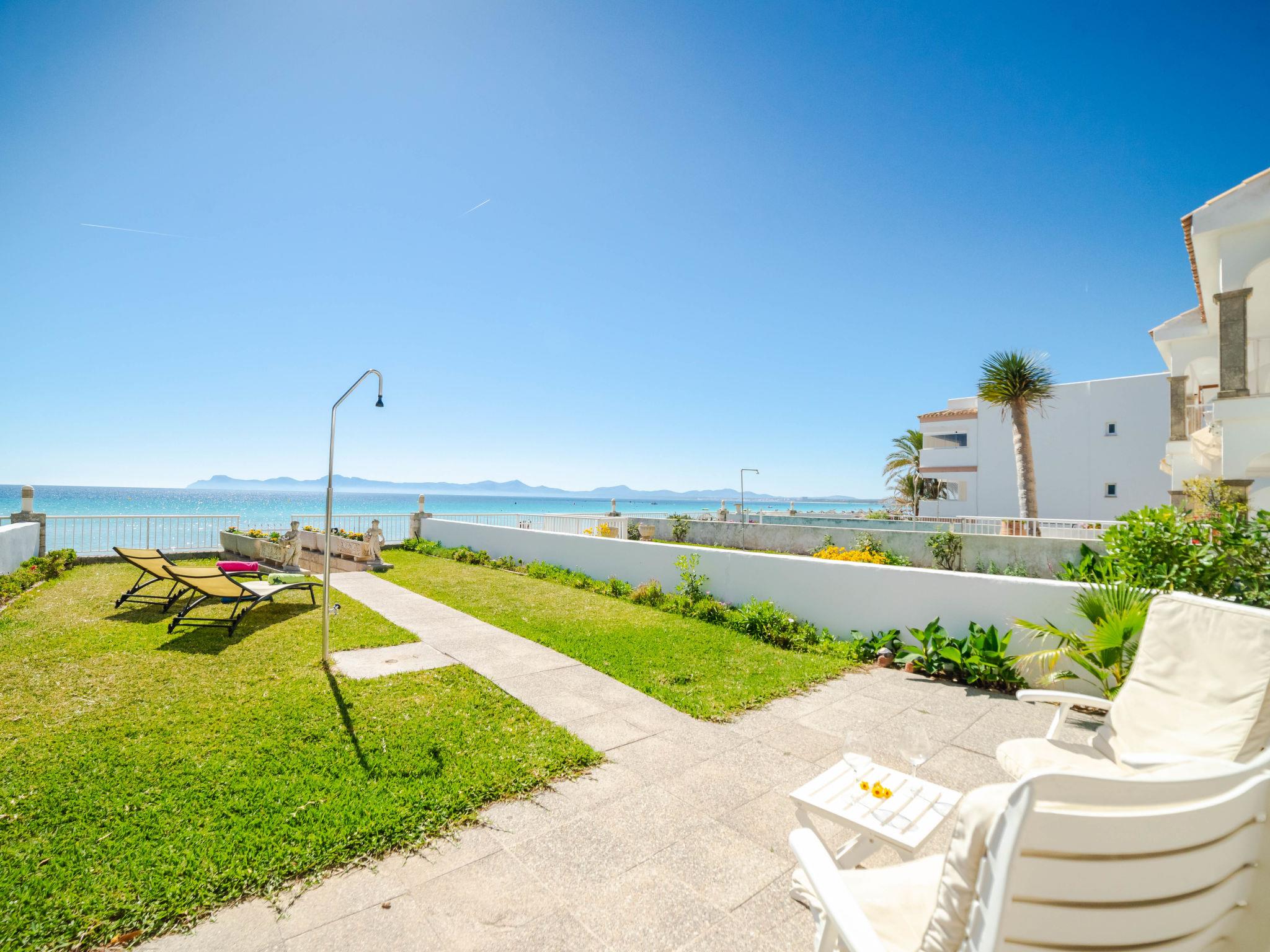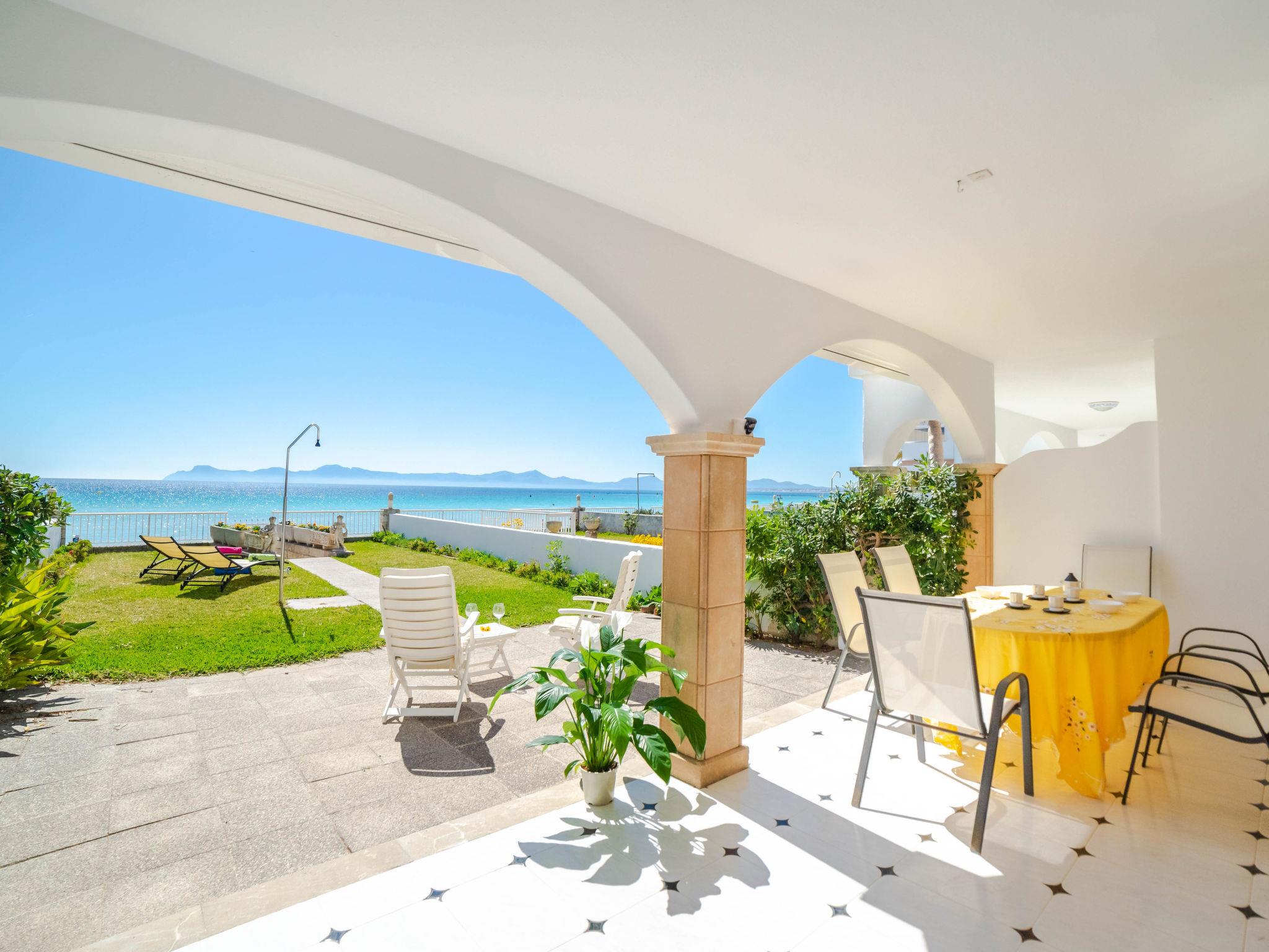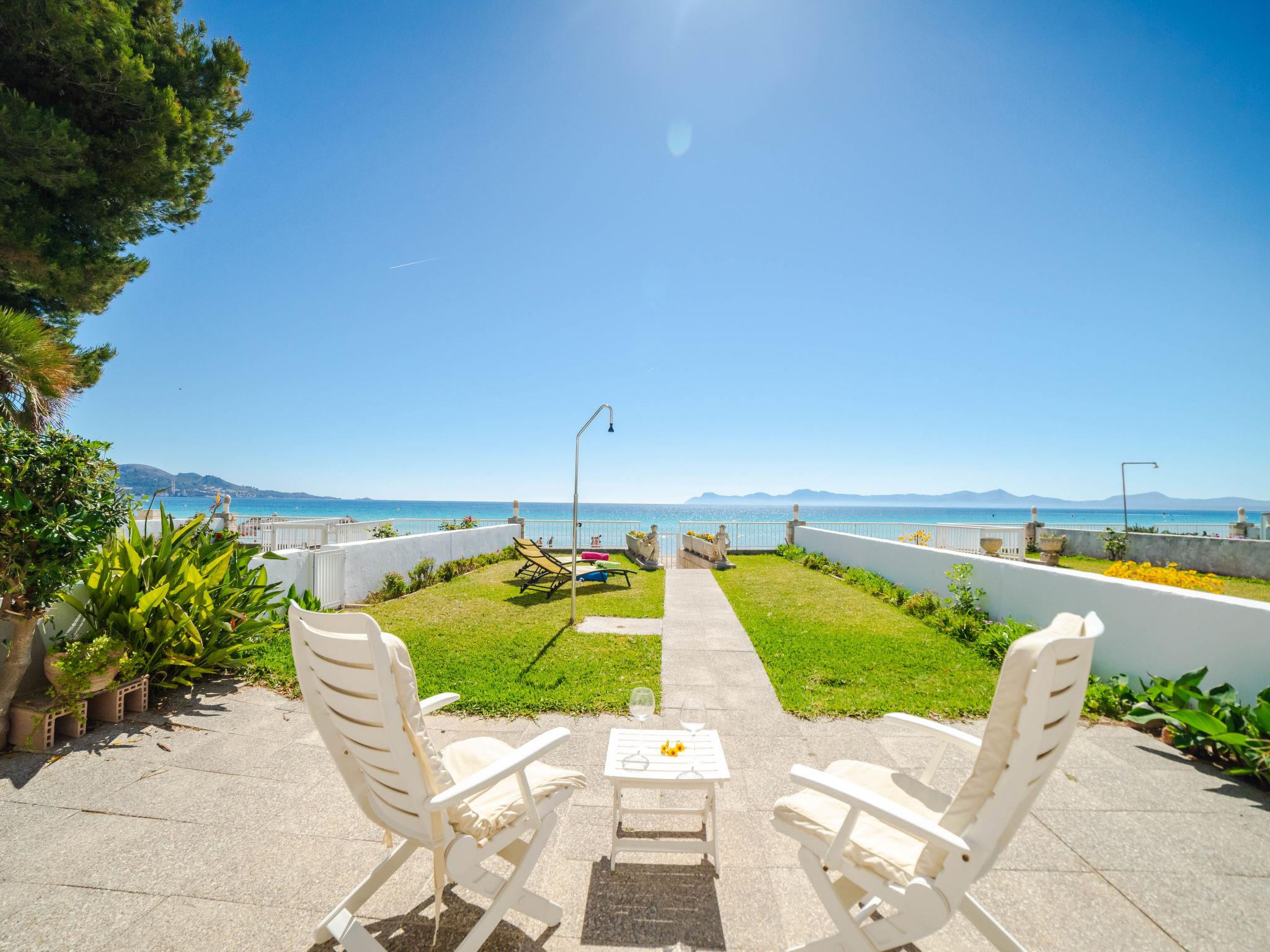 Port d'Alcúdia: Large, cosy apartment block "Sa Mirada". In the resort, 2.5 km from the centre, in a quiet, sunny position, 2.5 km from the edge of the forest, 3 m from the sea, from the beach, direct access to the beach. Private: garden with lawn and wildlife garden. Outdoor shower, patio, arbour, pergola, garden furniture. In the house: internet access, WiFi, washing machine. Stepped path (6 steps) to the house. Supermarket 400 m, restaurant 150 m, bar 200 m, bicycle rental 500 m, pub garden 150 m, bus stop, sandy beach 3 m, rocky beach 5 km. Sports harbour 3 km, marina 3 km, golf course (18 hole) 6 km. Please note: suitable for families, suitable for seniors. Object suitable for 6 adults.