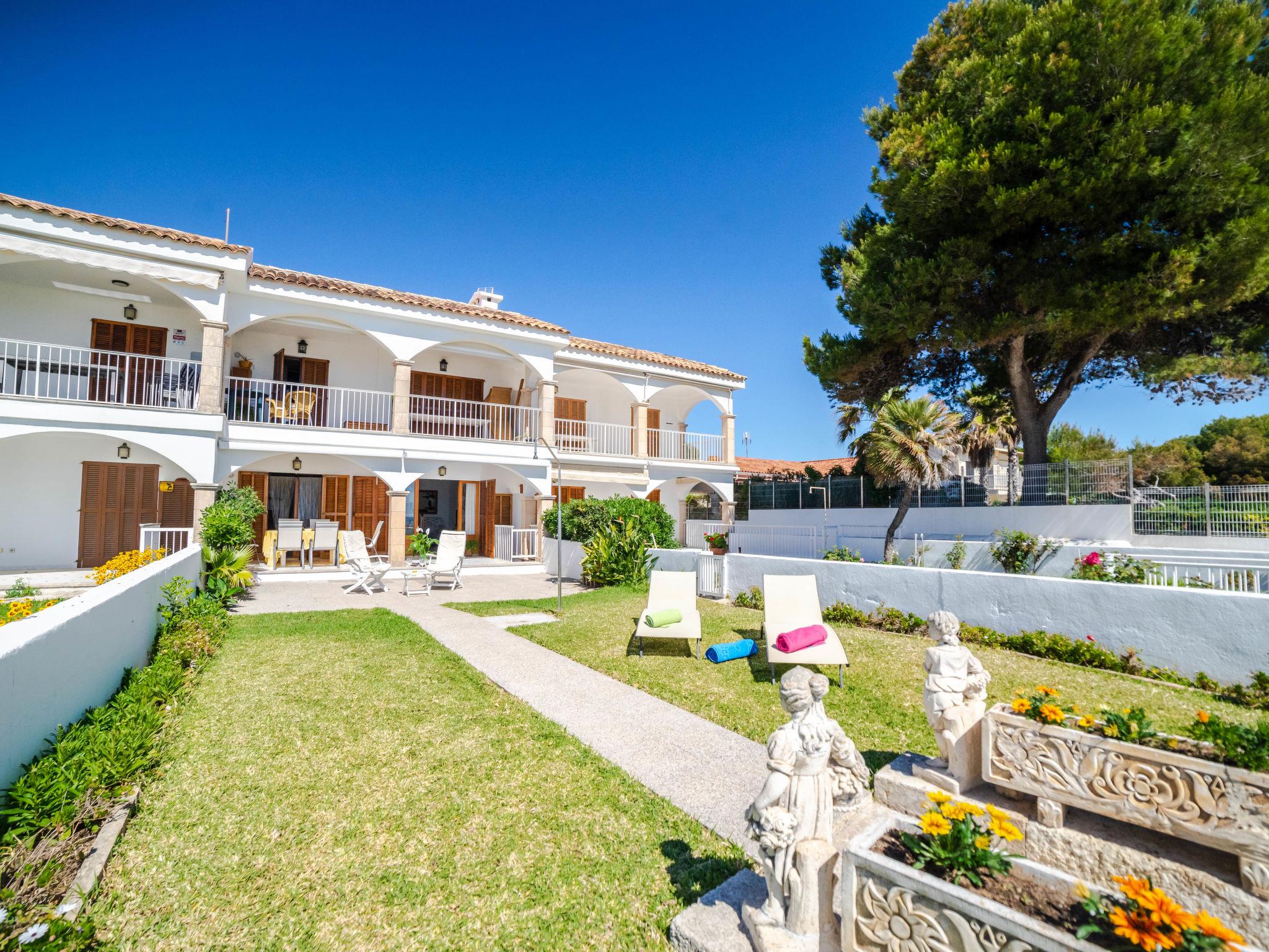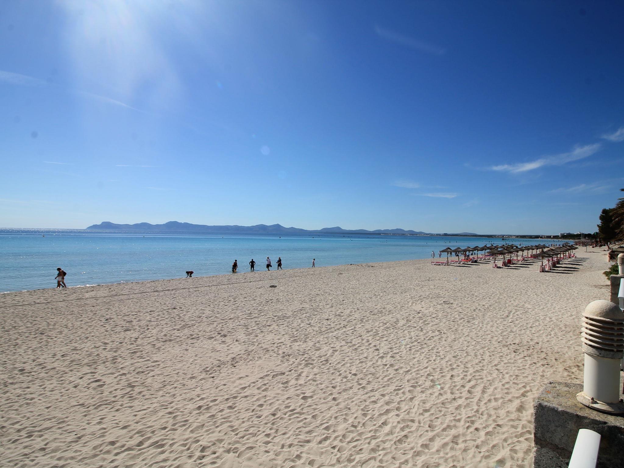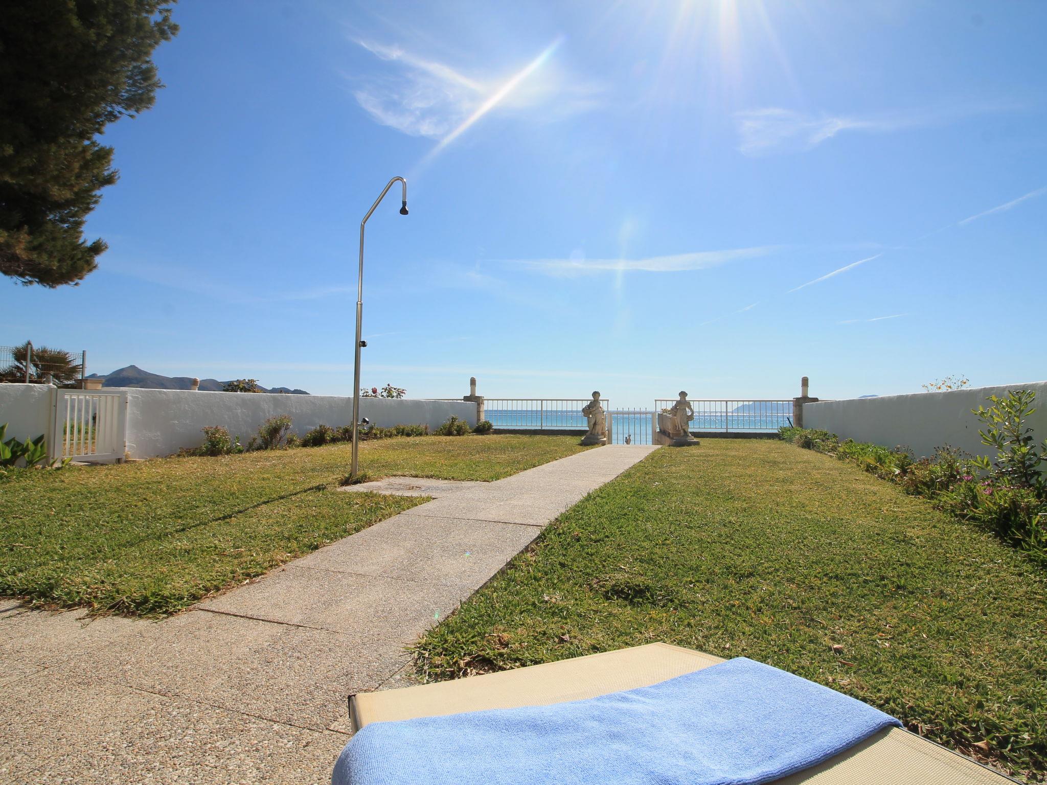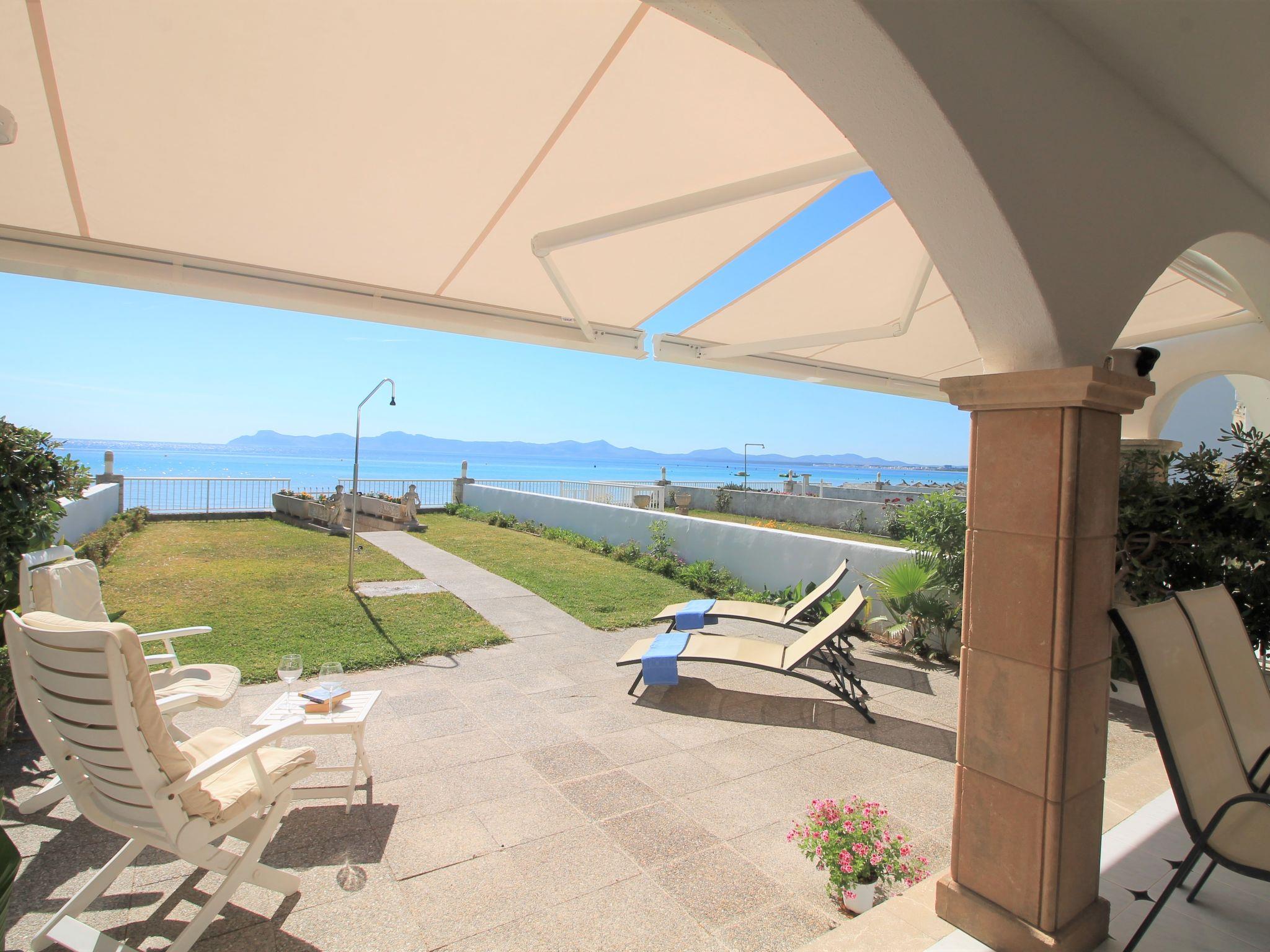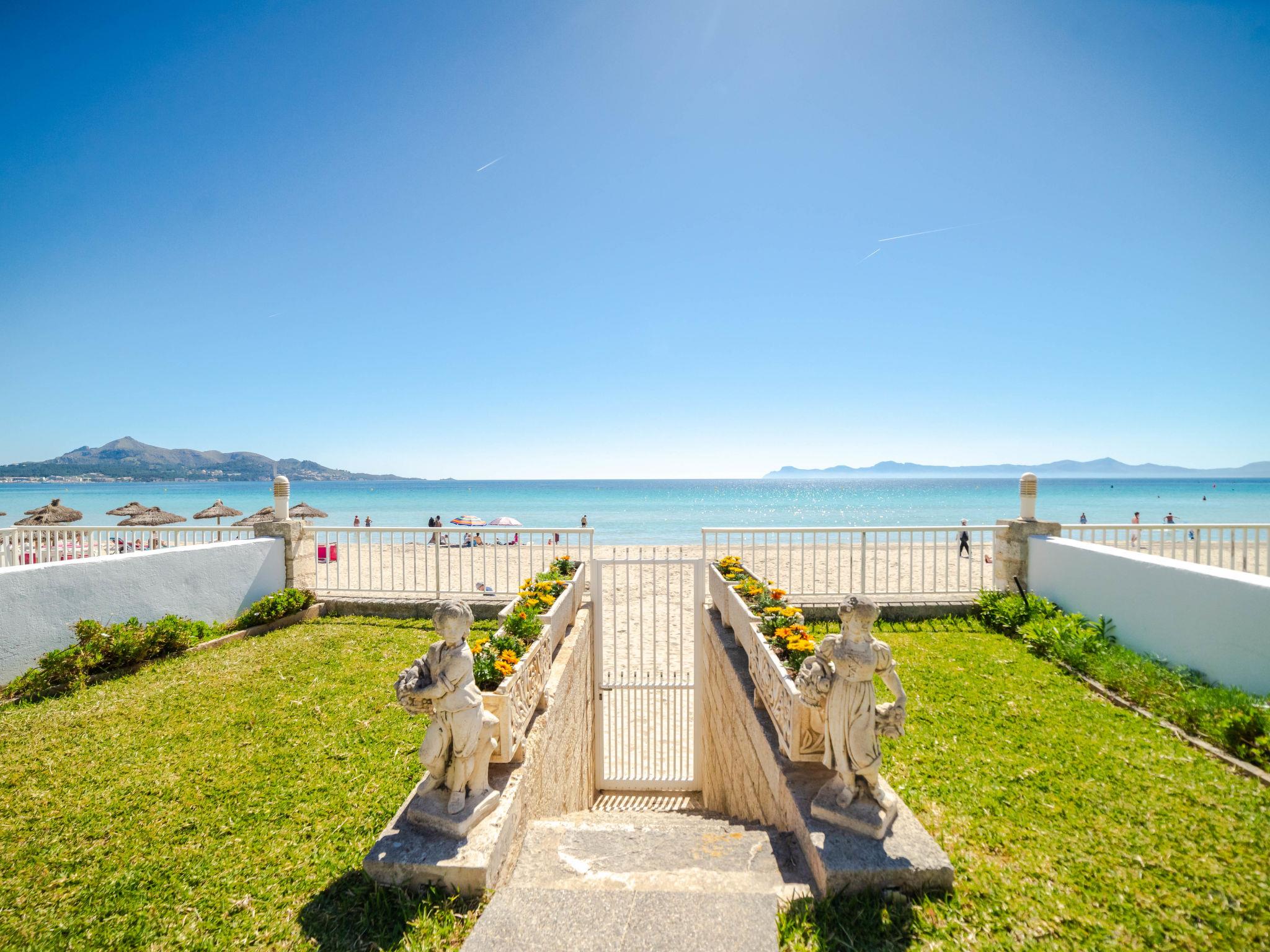 Port d'Alcúdia: Large, cosy apartment block "Sa Mirada". In the resort, 2.5 km from the centre, in a quiet, sunny position, 2.5 km from the edge of the forest, 3 m from the sea, from the beach, direct access to the beach. Private: garden with lawn and wildlife garden. Outdoor shower, patio, arbour, pergola, garden furniture. In the house: internet access, WiFi, washing machine. Stepped path (6 steps) to the house. Supermarket 400 m, restaurant 150 m, bar 200 m, bicycle rental 500 m, pub garden 150 m, bus stop, sandy beach 3 m, rocky beach 5 km. Sports harbour 3 km, marina 3 km, golf course (18 hole) 6 km. Please note: suitable for families, suitable for seniors. Object suitable for 6 adults.