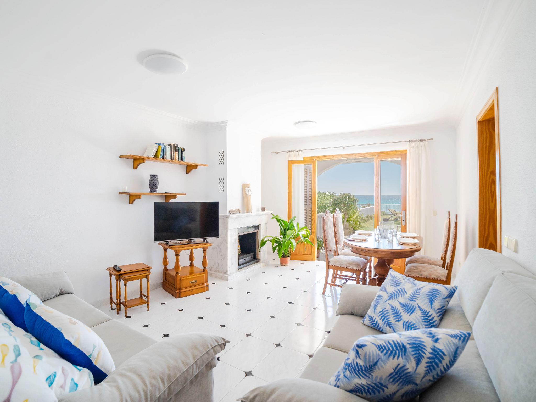 "Sa Mirada", 4-room apartment 120 m2, on the upper ground floor. Object suitable for 6 adults. Spacious and bright, comfortable and cosy furnishings: large living/dining room with panoramic window with dining table, TV and flat screen. Exit to the patio. 2 large double bedrooms with panoramic window, each room with 1 french bed (150 cm, length 190 cm). 1 large double bedroom, window onto the courtyard with 2 beds (90 cm, length 190 cm). Kitchen-/living room (3 hot plates, oven, microwave, freezer, electric coffee machine) with dining table. Exit to the patio. Bath/WC, shower/bidet/WC. No heating option. Patio, lawn, porch. Terrace furniture, deck chairs (2). Marvellous panoramic view of the sea and the bay. Facilities: washing machine, iron, children's high chair, baby cot, hair dryer. Internet (WiFi, free). Suitable for families. ETVPL14012 // Reg. Nr.: ESFCTU0000070430001943720000000000000000000ETV/140128