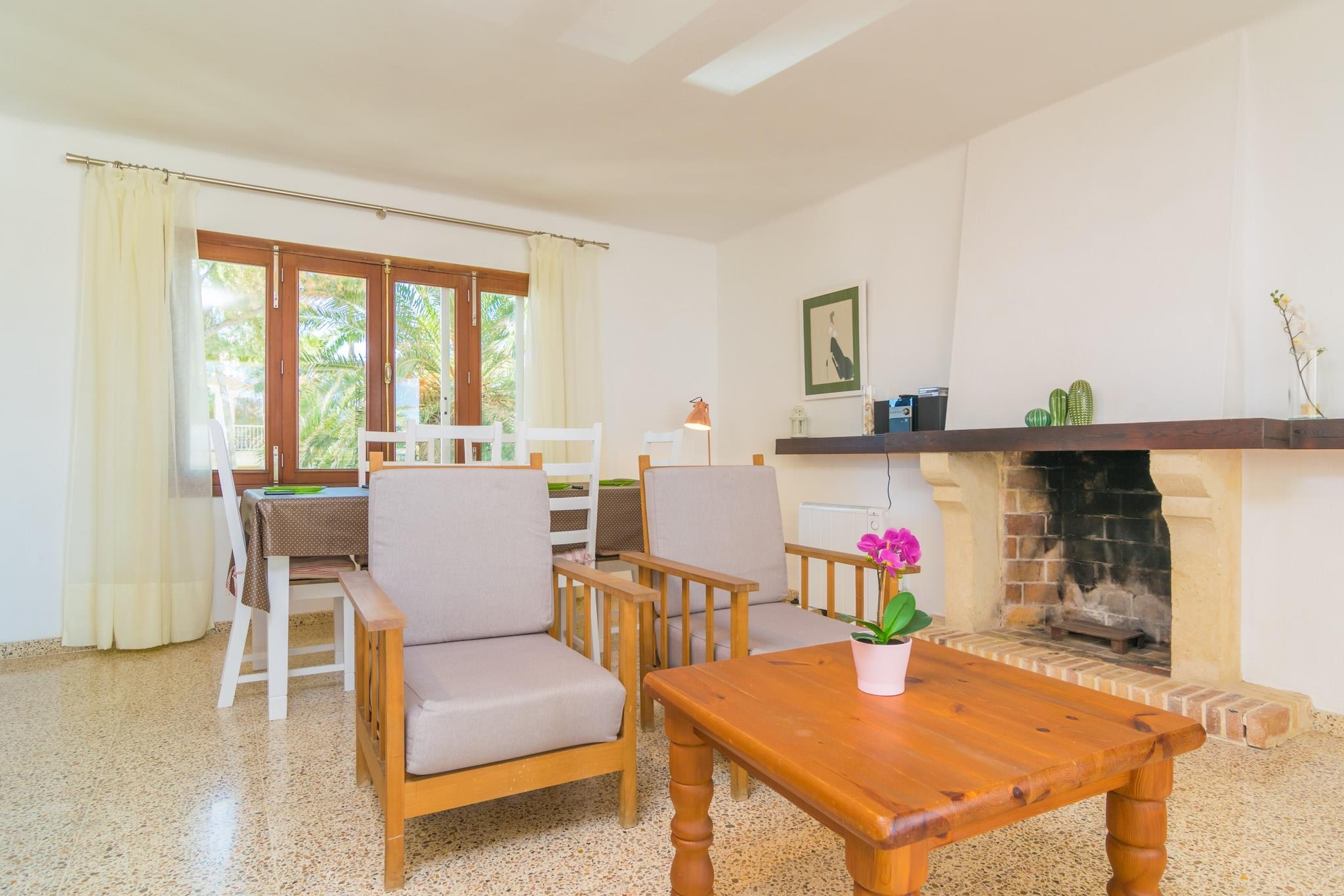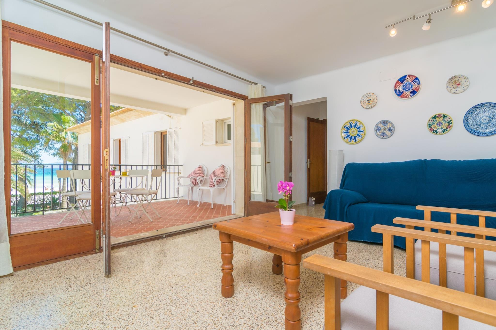 Terrasse med havudsigt Træd ind på den rummelige terrasse og nyd uforstyrret udsigt over havet, mens du nyder morgenmad, frokost eller et aftensmåltid. Forestil dig lange, afslappede middage med et glas vin, mens den kølige havbrise strømmer forbi. Blot få skridt fra den fine sandstrand kan du tilbringe dine dage med at svømme, solbade eller slentre langs den livlige, oplyste promenade med små både. Komfortable opholdsrum Lejligheden ligger på første sal i en bygning uden elevator og har en lys stue/spisestue med satellit-tv og direkte udgang til terrassen. Køkkenet er fuldt udstyret med en keramisk kogeplade, ovn og alle nødvendige redskaber, mens en vaskemaskine, strygejern og strygebræt sikrer bekvemmelighed. Tre soveværelser, hver med to enkeltsenge, garderobeskabe, ventilatorer og radiatorer, kan rumme op til seks gæster. En barneseng og højstol er tilgængelige efter anmodning. To uafhængige badeværelser med bruser tjener hele lejligheden komfortabelt. Levende kystnære beliggenhed Puerto de Alcúdia tilbyder en engagerende blanding af strandliv, gastronomi og lokal kultur. Nyd cocktails på sandet, traditionel mallorcansk paella og shopping efter tøj, kunsthåndværk og souvenirs. Udforsk nærliggende strande og bugter såsom Cala de San Vicente, eller besøg den charmerende gamle bydel i Alcúdia, der er travl med sit marked på tirsdage og søndage. Med nem adgang til golf på Club de Golf Alcanada, færgeforbindelser og fremragende lokale faciliteter er alt hvad du behøver inden for rækkevidde.