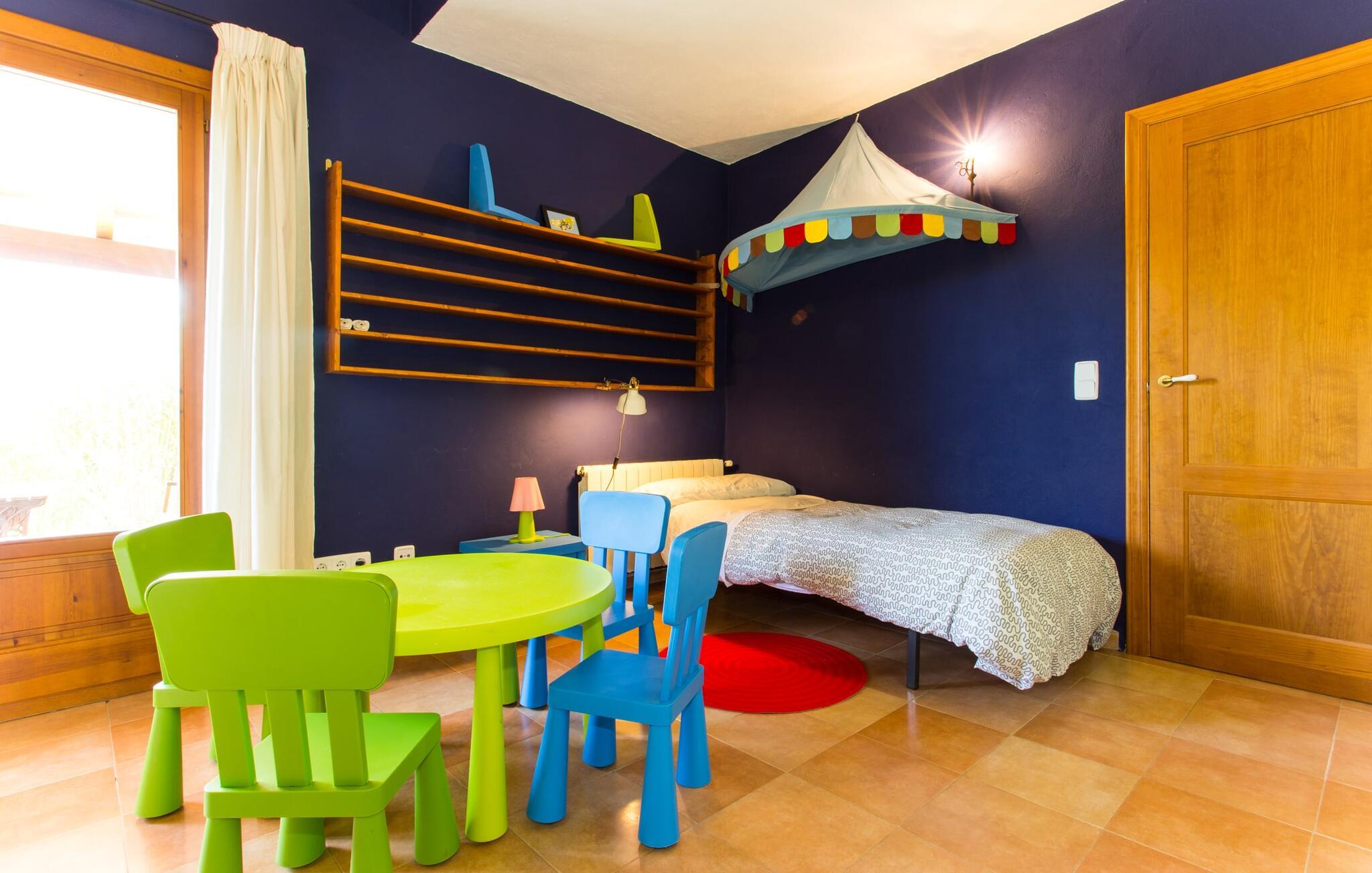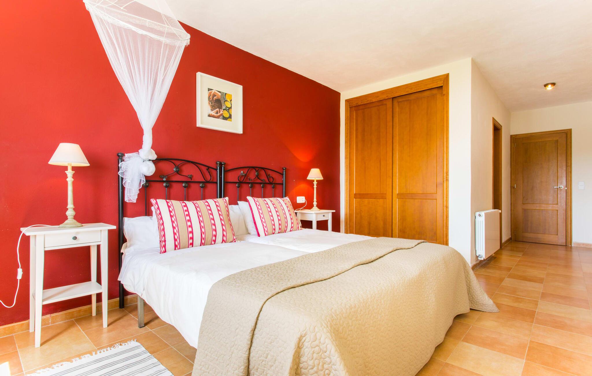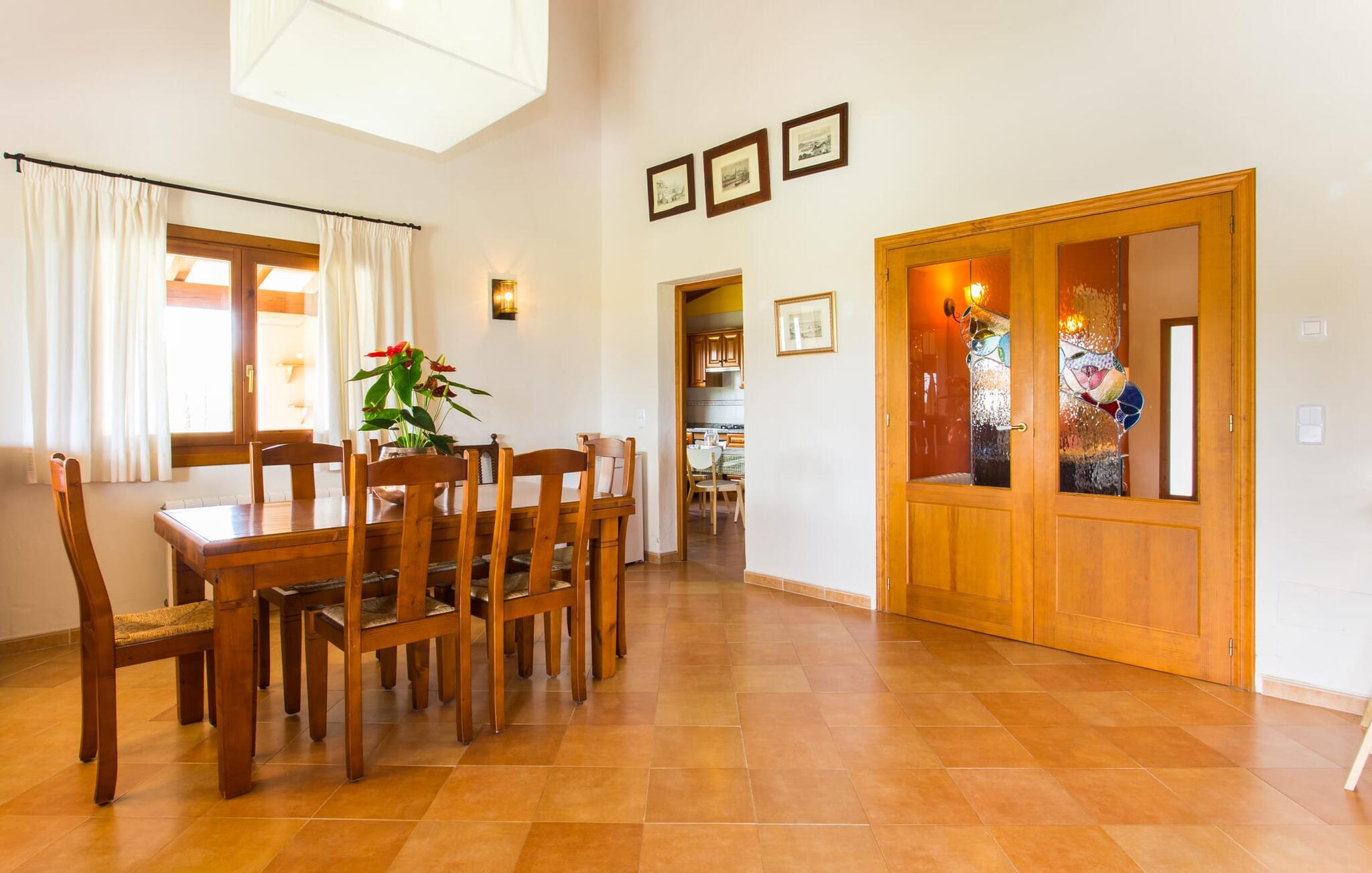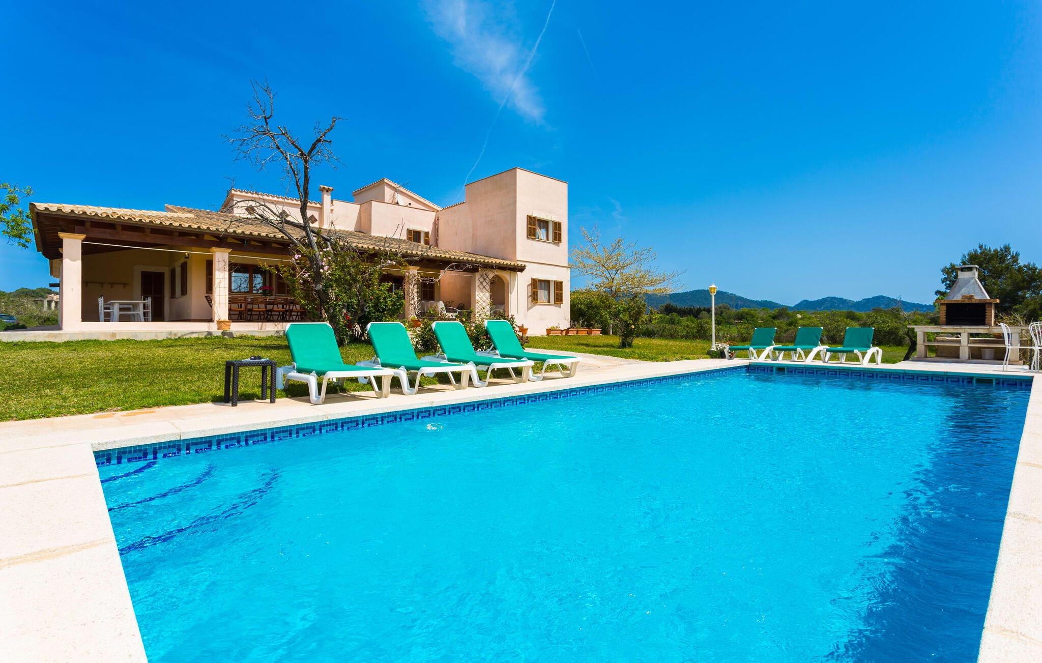 Der er ikke mange ejendomme med seks soveværelser med dobbeltsenge og seks badeværelser (et gæstetoilet). Og tilføjer man andre fordele som familievenlighed, nærhed til stranden og god værdi for pengene, så er der virkelig ikke mange. Af denne grund anbefaler vi især denne villa til en stor familie eller en gruppe familier. Men det er ikke kun nærheden til stranden, der gør denne villa så attraktiv for familier, der elsker at svømme. Ejendommen, nænsomt drevet og vedligeholdt af sin spanske ejer, imponerer frem for alt med sin rummelighed og den relativt overkommelige pris per nat. Hvide linnedlagner svajer blidt i den blide brise, der flyder fra havet over de bølgende bakker til villaen. De giver udearealet i denne smukke villa en helt særlig charme. Sammen med den nybyggede poolterrasse, som også er beklædt med et hvidt klæde, skabes et skønt chill-out område med en fantastisk udsigt til den tilstødende, knaldblå pool og markerne og engene bagved. Udearealet har 20 siddepladser og 12 liggestole. Poolen er ideel til familier og især børn, da den har et trin og en lille stige. Det betyder, at også yngre gæster har mulighed for at plaske rundt på de øverste trin, naturligvis under opsyn. Villaen kan trædes ind gennem hovedindgangen eller gennem en af de store terrassedøre. Når man kommer ind via hovedindgangen, kommer man ind i foyeren, der er over fem meter høj, som igen fører via en stor trappe til opholdsstuen i stueetagen eller til overetagen. Selvom I rejser med en eller flere familier, betyder det store antal soveværelser og badeværelser, at I ikke skal stå i kø til toilettet om morgenen. Der er plads nok til op til 12 personer, og de to førsteklasses babysenge tilbyder ekstra plads til to babyer, der rejser med jer. Villaen har fuldt udstyret køkken, spiseplads og opholdsstue, som igen har fladskærms-satellit-tv og WiFi. I kan til enhver tid sende aktuelle feriebilleder til jeres smartphone eller tablet via internettet. I øvrigt: To soveværelser er forbundet, hvilket er perfekt til et par (i det ene soveværelse) med børn (i det andet). Dette er især nyttigt, hvis I rejser med mere end én familie. Vi giver derfor Villa “Pont Verd” to tommelfingre op for familier med børn. Bare se nærmere på den forstørrede kortvisning af omgivelserne i denne villa, og I vil straks indse, hvor tæt det er på den smukke sandstrand "Sa Marjal" (på Costa de los Pinos). Det er beliggende mellem boligområderne Costa og Port Verd. Port Verd er en tidligere lille fiskerihavn, der nu er hjemsted for en fantastisk restaurant. Har I ikke lyst til at lave mad en aften, kan I blot nyde et lækkert måltid her i stedet. Den nærliggende strandpromenade er foret med flere andre restauranter, så I kan vælge en anden (høj kvalitet!) restaurant hver aften. Villaens navn stammer fra den nærliggende landsby Port Verd og dens beliggenhed er en af villaens helt store fordele. Den enorme ferievilla "Port Verd" er ideel til børn og ligger meget tæt på stranden, nær den lille by af samme navn på "Coast of the Pines" (Costa de los Pinos). Det er beliggende på en grund på omkring 14.000 m² med udsigt over havet, meget tæt på stranden og med indkøbsmuligheder kun få minutter væk (f.eks. i Son Servera). I nærheden af Cala Ratjada er der en dejlig strandpromenade med gode barer og restauranter til en aftentur eller en aften i byen.