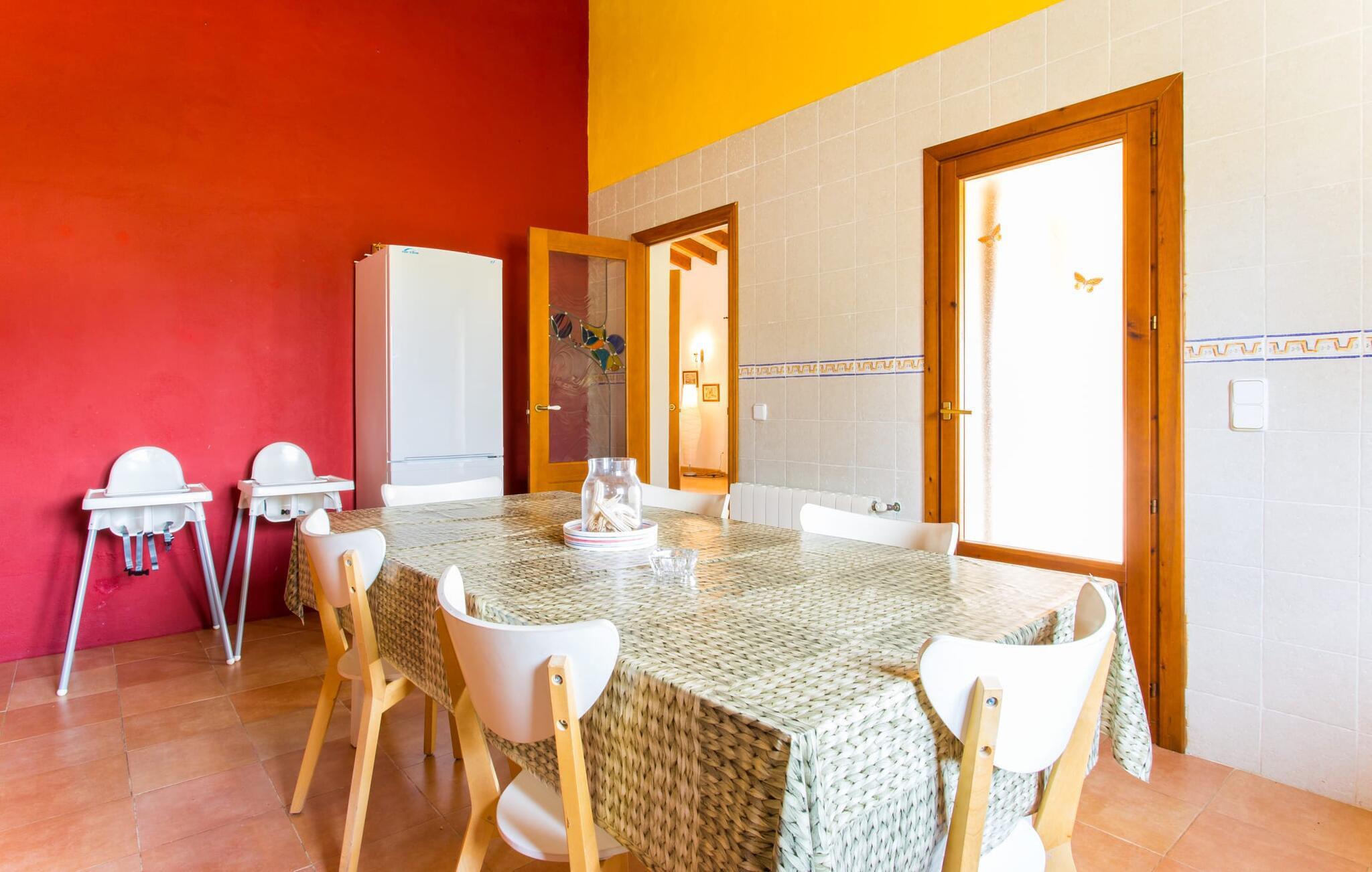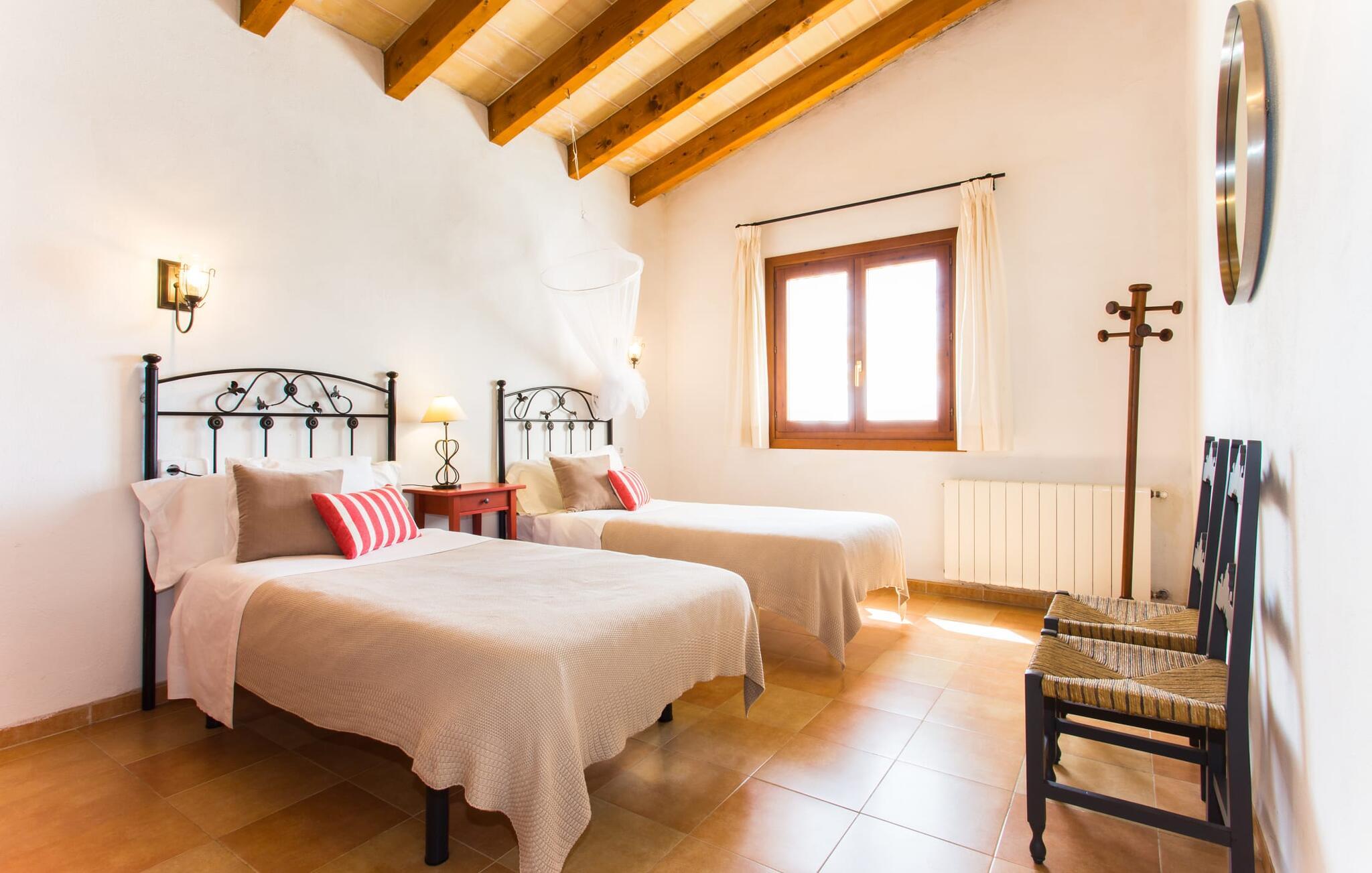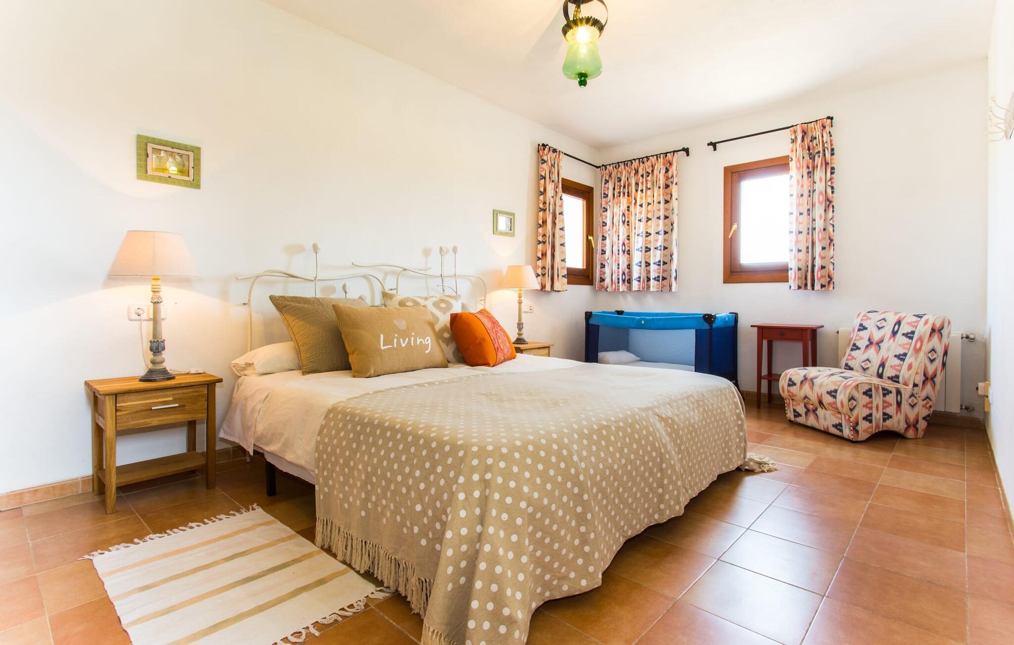Der er ikke mange ejendomme med seks soveværelser med dobbeltsenge og seks badeværelser (et gæstetoilet). Og tilføjer man andre fordele som familievenlighed, nærhed til stranden og god værdi for pengene, så er der virkelig ikke mange. Af denne grund anbefaler vi især denne villa til en stor familie eller en gruppe familier. Men det er ikke kun nærheden til stranden, der gør denne villa så attraktiv for familier, der elsker at svømme. Ejendommen, nænsomt drevet og vedligeholdt af sin spanske ejer, imponerer frem for alt med sin rummelighed og den relativt overkommelige pris per nat. Hvide linnedlagner svajer blidt i den blide brise, der flyder fra havet over de bølgende bakker til villaen. De giver udearealet i denne smukke villa en helt særlig charme. Sammen med den nybyggede poolterrasse, som også er beklædt med et hvidt klæde, skabes et skønt chill-out område med en fantastisk udsigt til den tilstødende, knaldblå pool og markerne og engene bagved. Udearealet har 20 siddepladser og 12 liggestole. Poolen er ideel til familier og især børn, da den har et trin og en lille stige. Det betyder, at også yngre gæster har mulighed for at plaske rundt på de øverste trin, naturligvis under opsyn. Villaen kan trædes ind gennem hovedindgangen eller gennem en af de store terrassedøre. Når man kommer ind via hovedindgangen, kommer man ind i foyeren, der er over fem meter høj, som igen fører via en stor trappe til opholdsstuen i stueetagen eller til overetagen. Selvom I rejser med en eller flere familier, betyder det store antal soveværelser og badeværelser, at I ikke skal stå i kø til toilettet om morgenen. Der er plads nok til op til 12 personer, og de to førsteklasses babysenge tilbyder ekstra plads til to babyer, der rejser med jer. Villaen har fuldt udstyret køkken, spiseplads og opholdsstue, som igen har fladskærms-satellit-tv og WiFi. I kan til enhver tid sende aktuelle feriebilleder til jeres smartphone eller tablet via internettet. I øvrigt: To soveværelser er forbundet, hvilket er perfekt til et par (i det ene soveværelse) med børn (i det andet). Dette er især nyttigt, hvis I rejser med mere end én familie. Vi giver derfor Villa “Pont Verd” to tommelfingre op for familier med børn. Bare se nærmere på den forstørrede kortvisning af omgivelserne i denne villa, og I vil straks indse, hvor tæt det er på den smukke sandstrand "Sa Marjal" (på Costa de los Pinos). Det er beliggende mellem boligområderne Costa og Port Verd. Port Verd er en tidligere lille fiskerihavn, der nu er hjemsted for en fantastisk restaurant. Har I ikke lyst til at lave mad en aften, kan I blot nyde et lækkert måltid her i stedet. Den nærliggende strandpromenade er foret med flere andre restauranter, så I kan vælge en anden (høj kvalitet!) restaurant hver aften. Villaens navn stammer fra den nærliggende landsby Port Verd og dens beliggenhed er en af villaens helt store fordele. Den enorme ferievilla "Port Verd" er ideel til børn og ligger meget tæt på stranden, nær den lille by af samme navn på "Coast of the Pines" (Costa de los Pinos). Det er beliggende på en grund på omkring 14.000 m² med udsigt over havet, meget tæt på stranden og med indkøbsmuligheder kun få minutter væk (f.eks. i Son Servera). I nærheden af Cala Ratjada er der en dejlig strandpromenade med gode barer og restauranter til en aftentur eller en aften i byen.