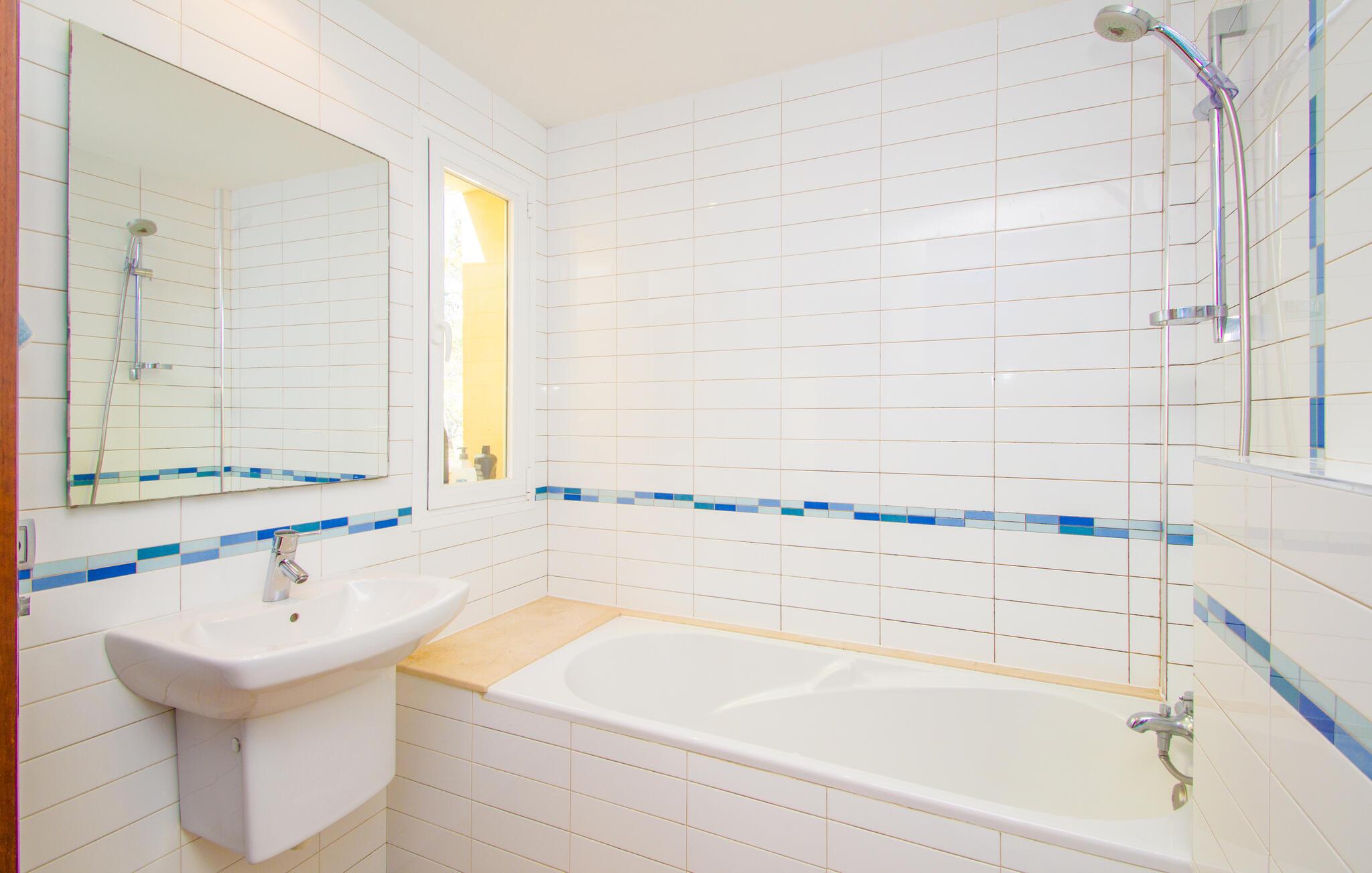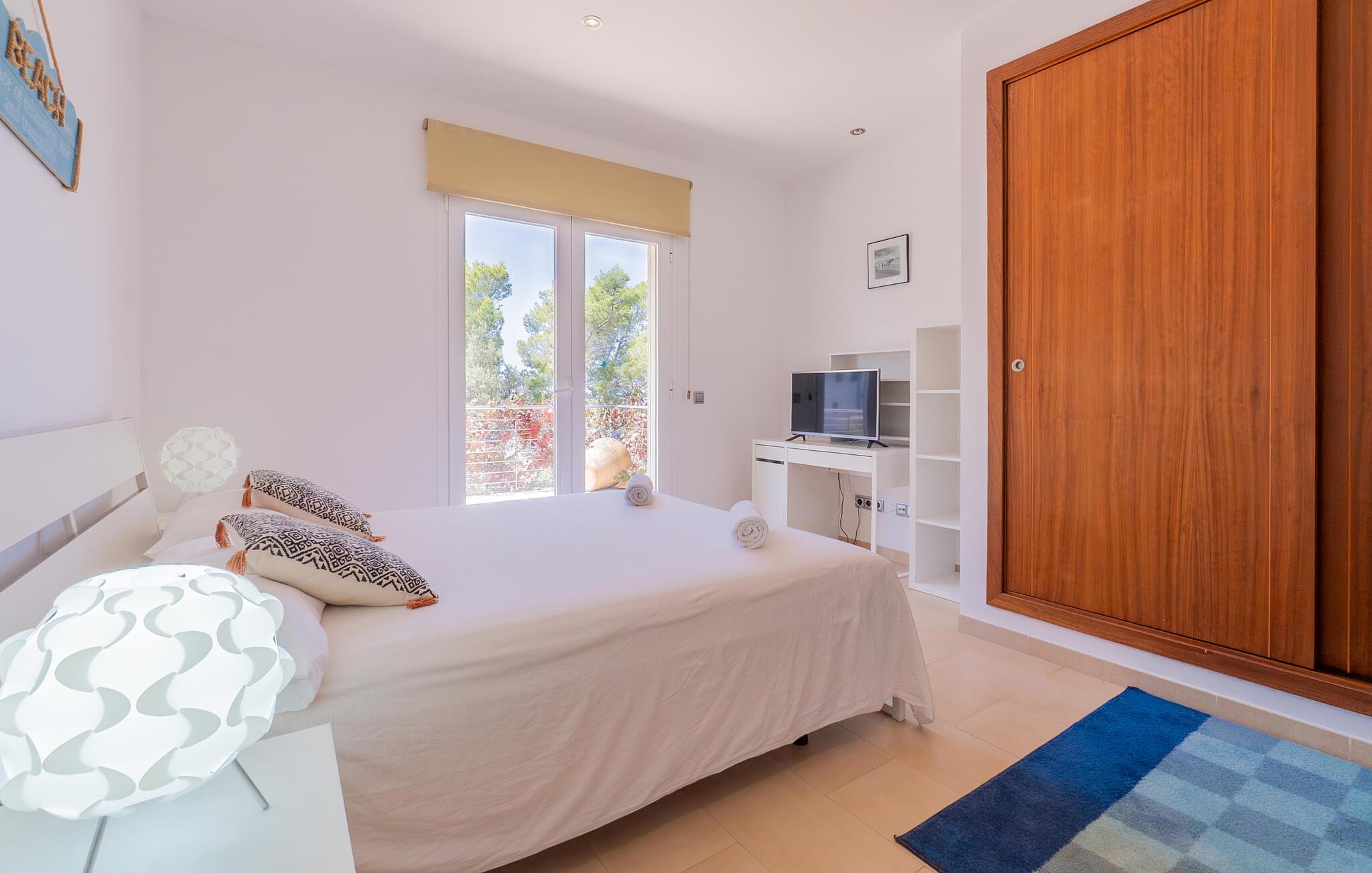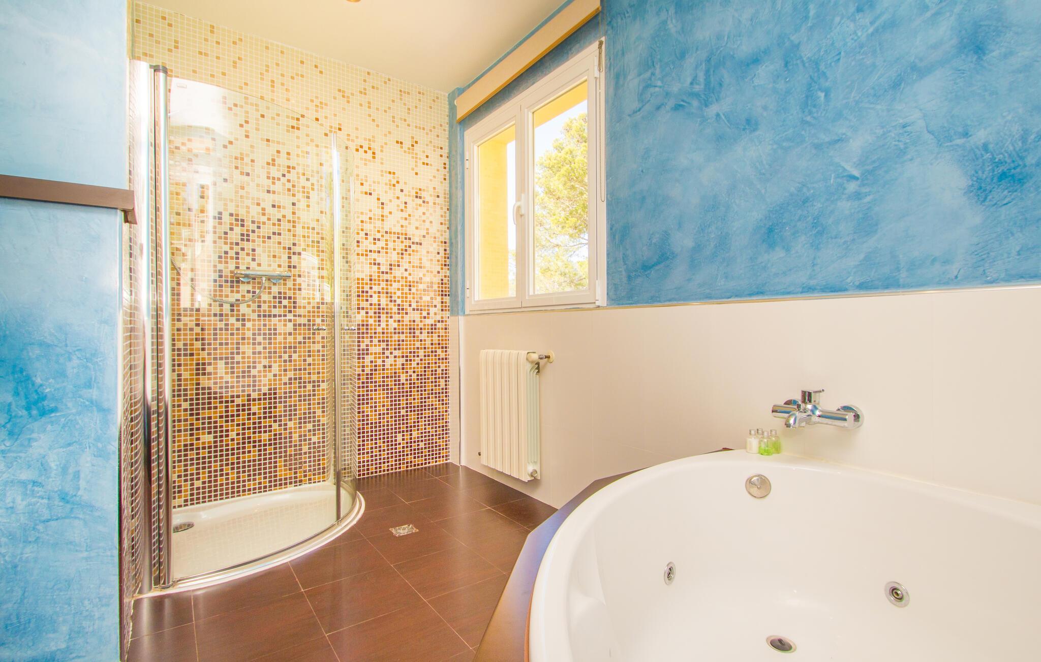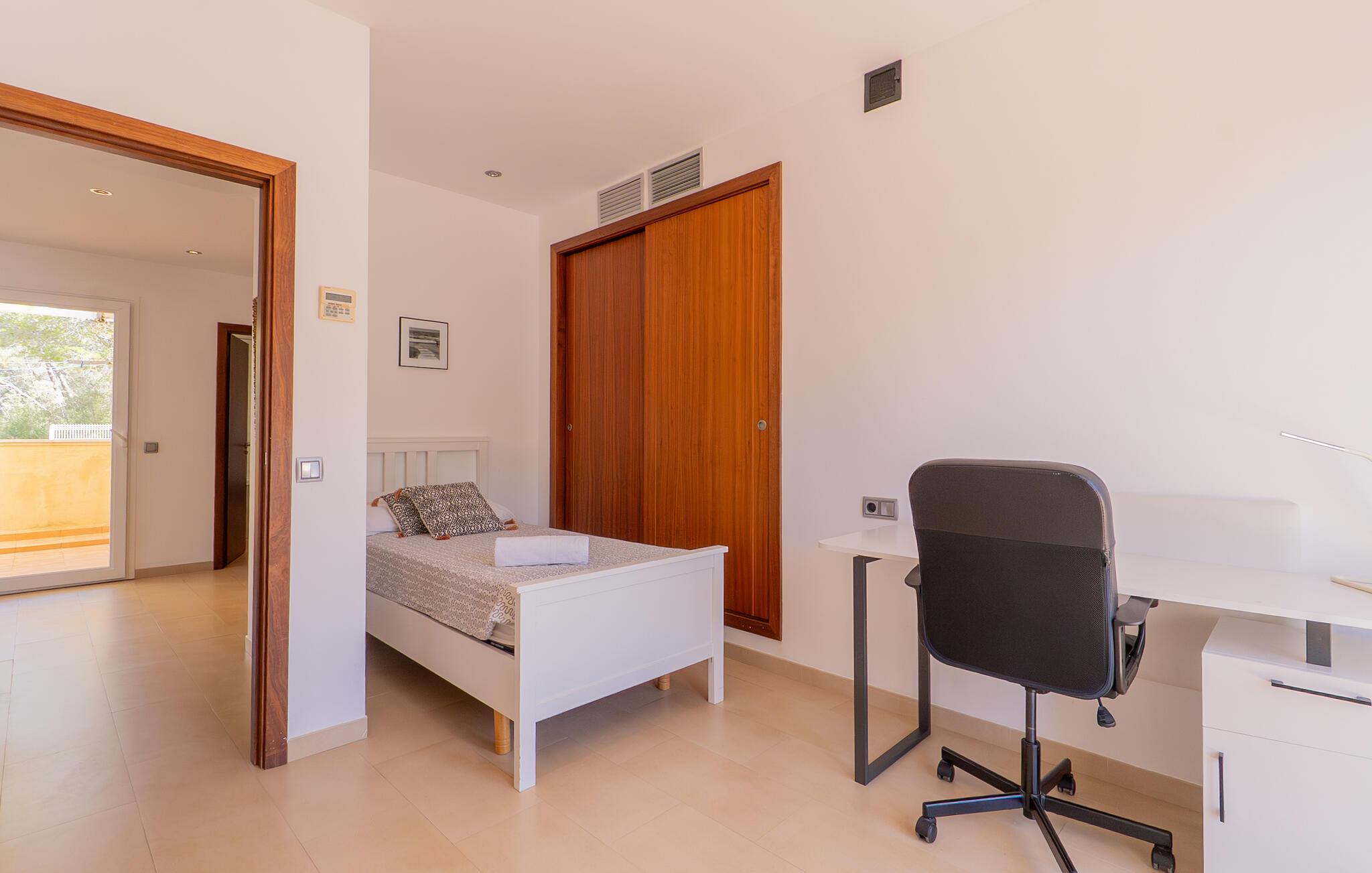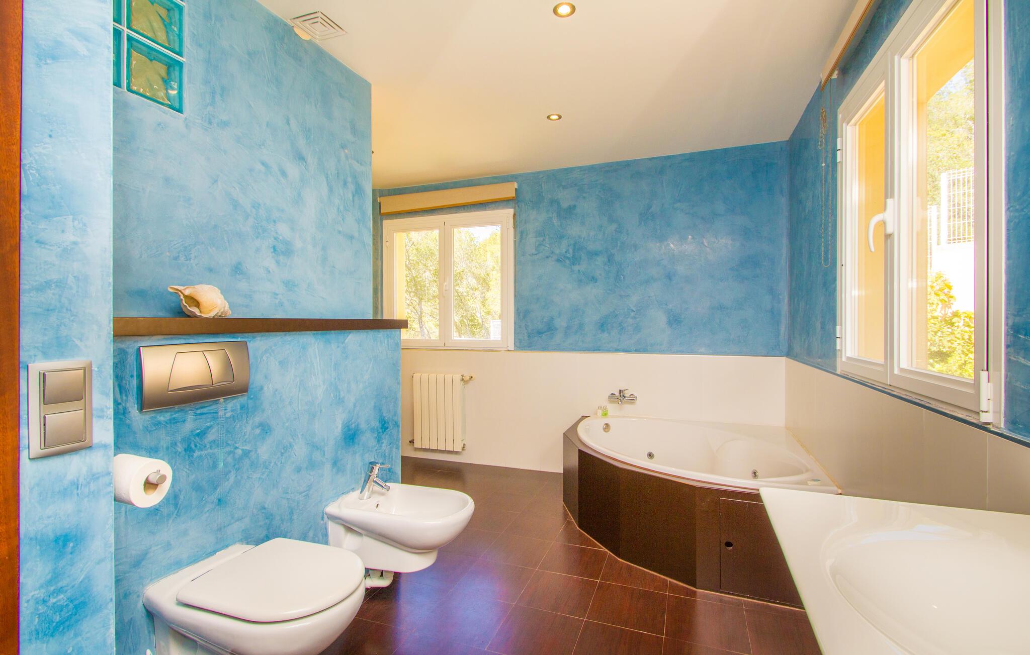 Når først jeres krop er helt nedsænket i den forfriskende pool på terrassen, I har svømmet et par omgange og nydt udsigten over bugten fra de skyggefulde træer, kan I ånde undren over dette smukke ørneblik. Om I vil nyde panoramaudsigten over bådene på vej mod den nærliggende lystbådehavn eller trække jer tilbage til træstolene for en lille lur, er helt op til jer. De bølgeformede liggestole i træ er formet til at efterligne havets bølger. Alt efter årstiden er den overdækkede terrasse omgivet af grønne klatreplanter, som sammen med den lille plet græsplæne og mange andre planter ved siden af huset skaber en meget naturlig atmosfære. Dette er det perfekte sted at starte eftermiddagen i godt selskab og lægge planer for udflugter i området. Den store altan ovenpå er et andet godt sted at nyde solen og den friske luft fuldt ud. Midtpunktet inde i bygningen er en stor stue og spisestue. Sofaområdet er adskilt fra resten af en træhylde i antik stil, hvor I kan krølle jer sammen og se tv på den store fladskærm for at se, hvad der sker derhjemme. Spisebordet lavet af massivt træ giver plads nok til alle gæster. Det er et sted, hvor alle kan mødes, når det bliver lidt koldere på terrassen om natten. Et særligt højdepunkt er køkkenet. Takket være det enorme køleskab og fryser behøver I ikke begrænse jer, når I handler på et af øens landmandsmarkeder. Køkkenøen midt i køkkenet gør villaen ideel til fælles madlavningsarrangementer, da mange kokke kan gøre deres del i madlavningsprocessen på samme tid. Hvis morgenerne er lidt mere hektiske, og I gerne vil have morgenmad direkte i køkkenet, kan I gøre det ved et andet bord. Soveværelset i stueetagen har en dobbeltseng. Et badeværelse er på samme etage. Ovenpå er der yderligere tre soveværelser: et med en enkeltseng, et med dobbeltseng og eget badeværelse og et tredje med to enkeltsenge og børnevenligt tapet. Et særligt højdepunkt: To af de tre badeværelser har et badekar, hvor I kan afslutte dagen med et afslappende boblebad. Som navnet antyder, ligger villaen "Portals Nous Hills" i "Portals Nous"-forstaden Palma - det ideelle udgangspunkt for forskellige dagsture. Alene i øens hovedstad er der nok af seværdigheder til at holde jer beskæftiget i flere dage. Efter et besøg i den imponerende katedral, en spadseretur i havnen og en omfattende shoppingtur, er det meget muligt, at I foretrækker blot at slappe af på stranden resten af dagen. Og I behøver ikke engang en bil, for villaen ligger kun 850 m fra havet. Hvis I beslutter jer for at udforske Tramuntana-bjergene og besøge de maleriske byer Valemossa eller Déjà, vil I støde på flere imponerende monumenter, som I vil huske i lang tid. Kun 850 m fra havet kombinerer villaen "Portals Nous Hills" alle fordelene ved en kystnær beliggenhed med gode transportforbindelser, så I hurtigt kan nå byens lystbådehavn og slentre langs den varierede "Marina Portals"-promenaden med dens butikker og restauranter På ingen tid overhovedet kan I komme til øens hovedstad Palma, hvor adskillige kulturelle og fritidsaktiviteter venter på jer. I har også valget mellem flere sandstrande.